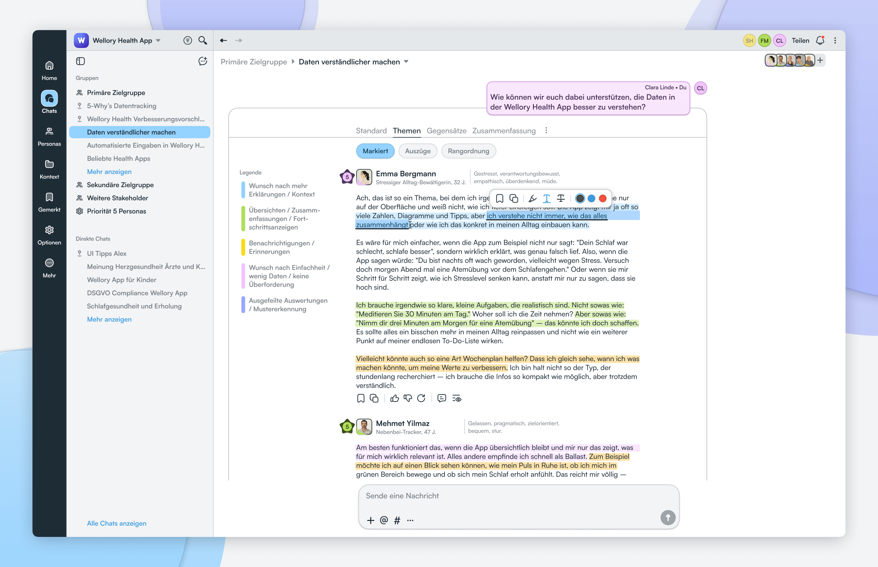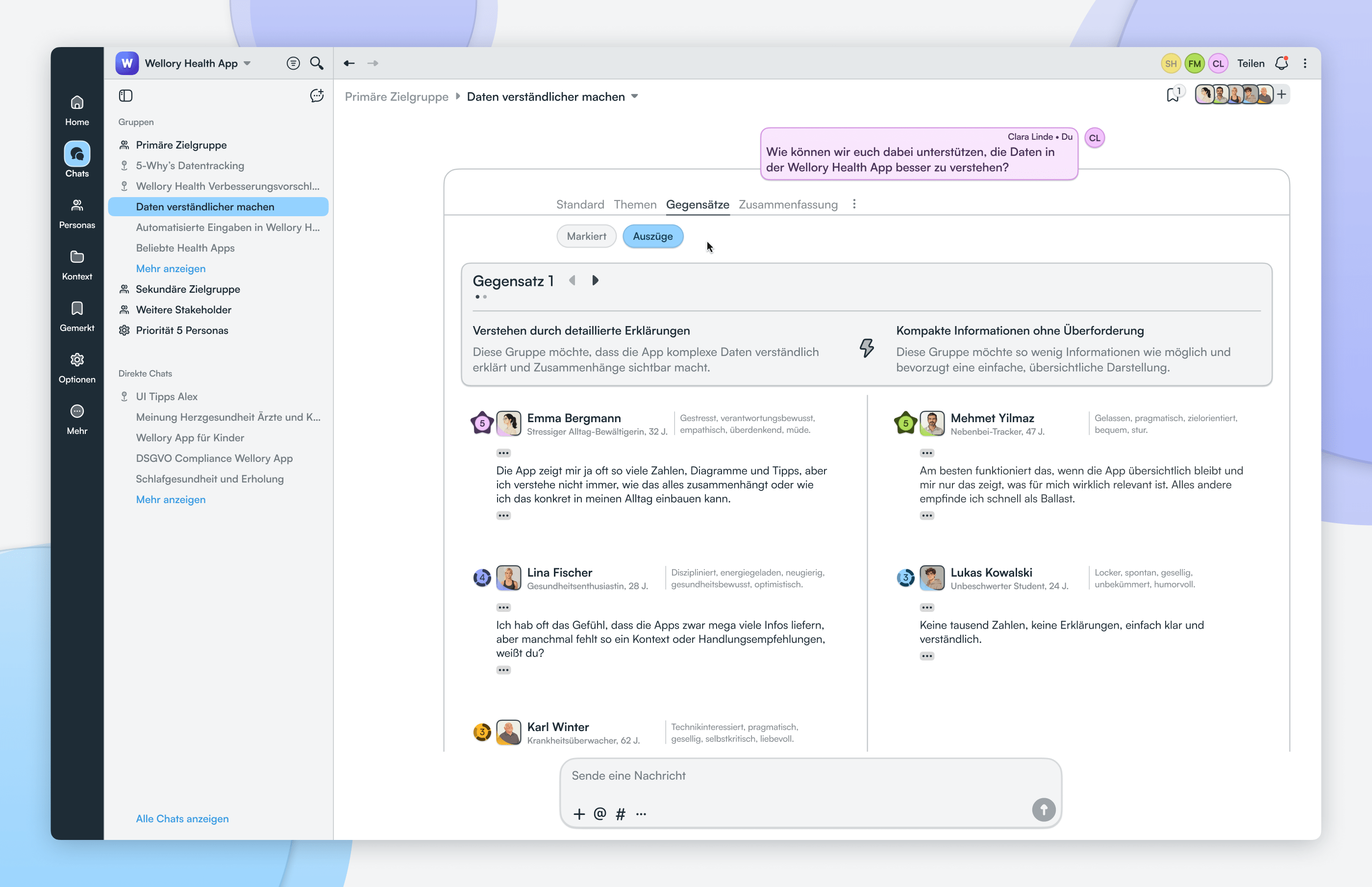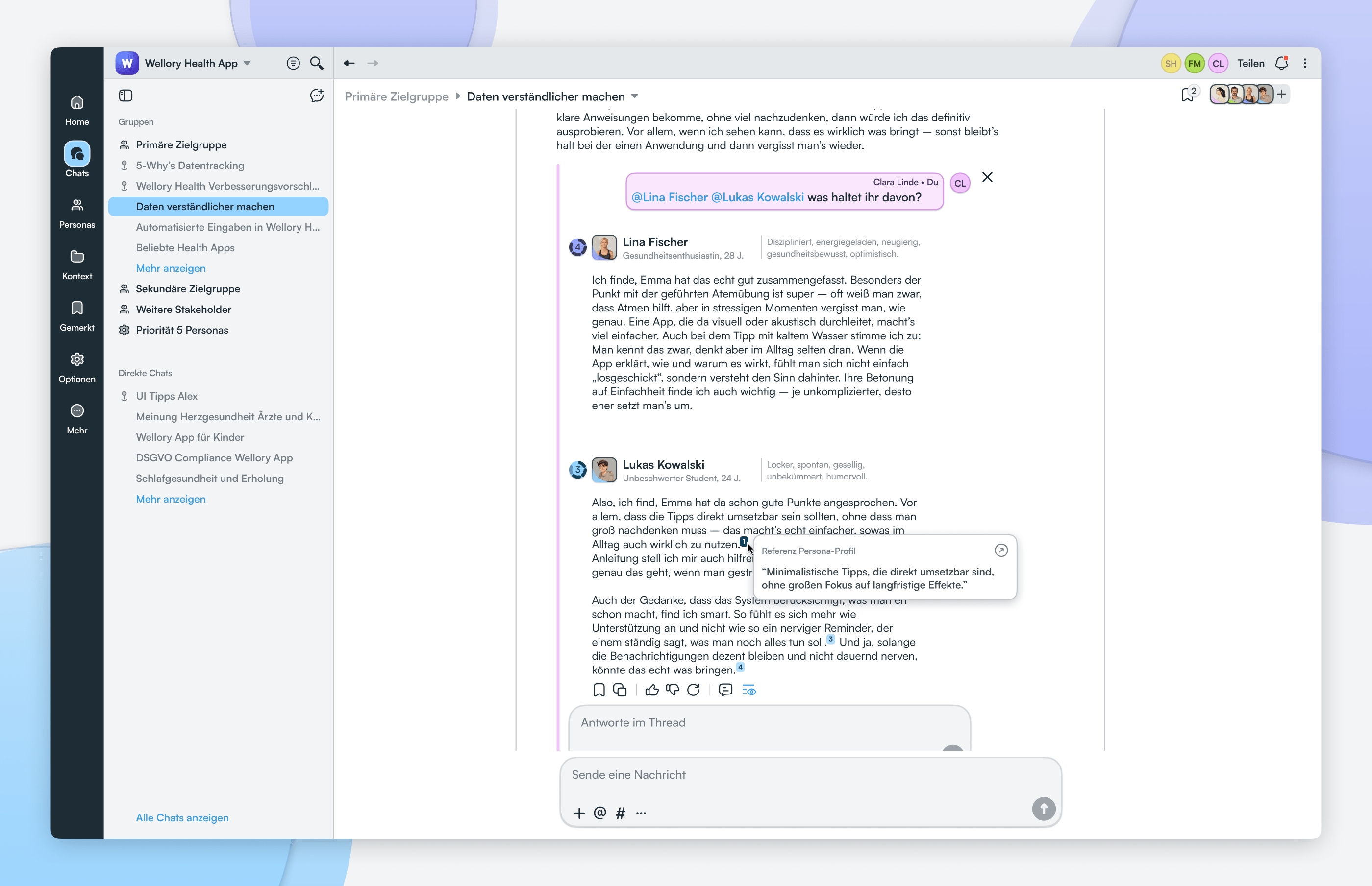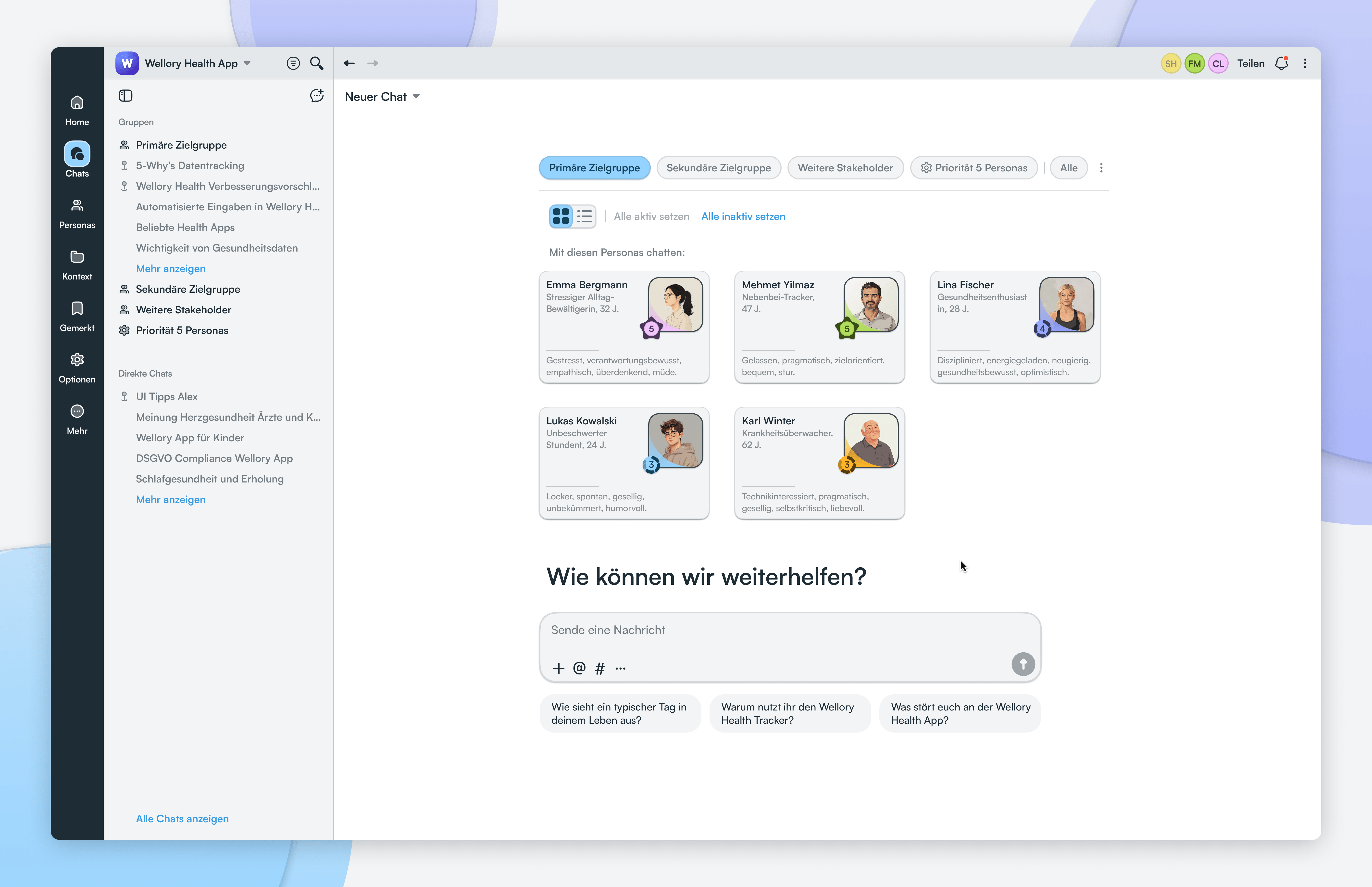 Mit jeder neuen Frage, Funktion oder Designskizze lassen sich die Personas wieder hinzuschalten, sodass das Team ständig im Austausch mit seinen Zielgruppen bleibt. Während echte Interviews und Nutzertests nach wie vor sinnvoll sind, schließt Yosona die Lücke zwischen den größeren Projektschritten. So können Unternehmen wie Wellory kontinuierlich und schnell ihre Produkte und Dienstleistungen optimieren, ohne die Nutzerperspektive aus dem Auge zu verlieren.