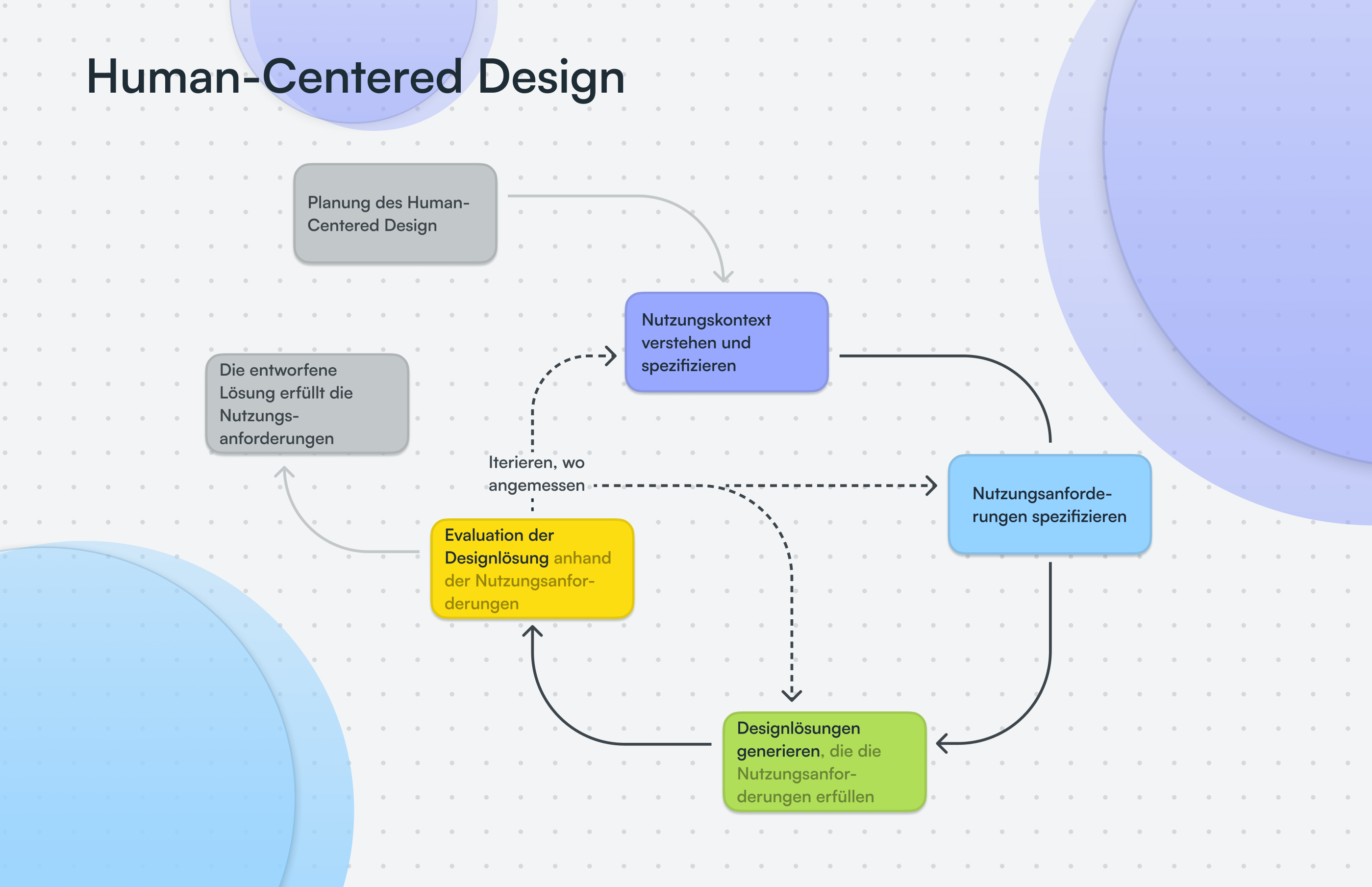 Human-Centered Design, eine Praktik für die Entwicklung menschenzentrierter Produkte und Dienstleistungen (Eigene Darstellung auf Basis von E DIN EN ISO 9241-210 (2019))