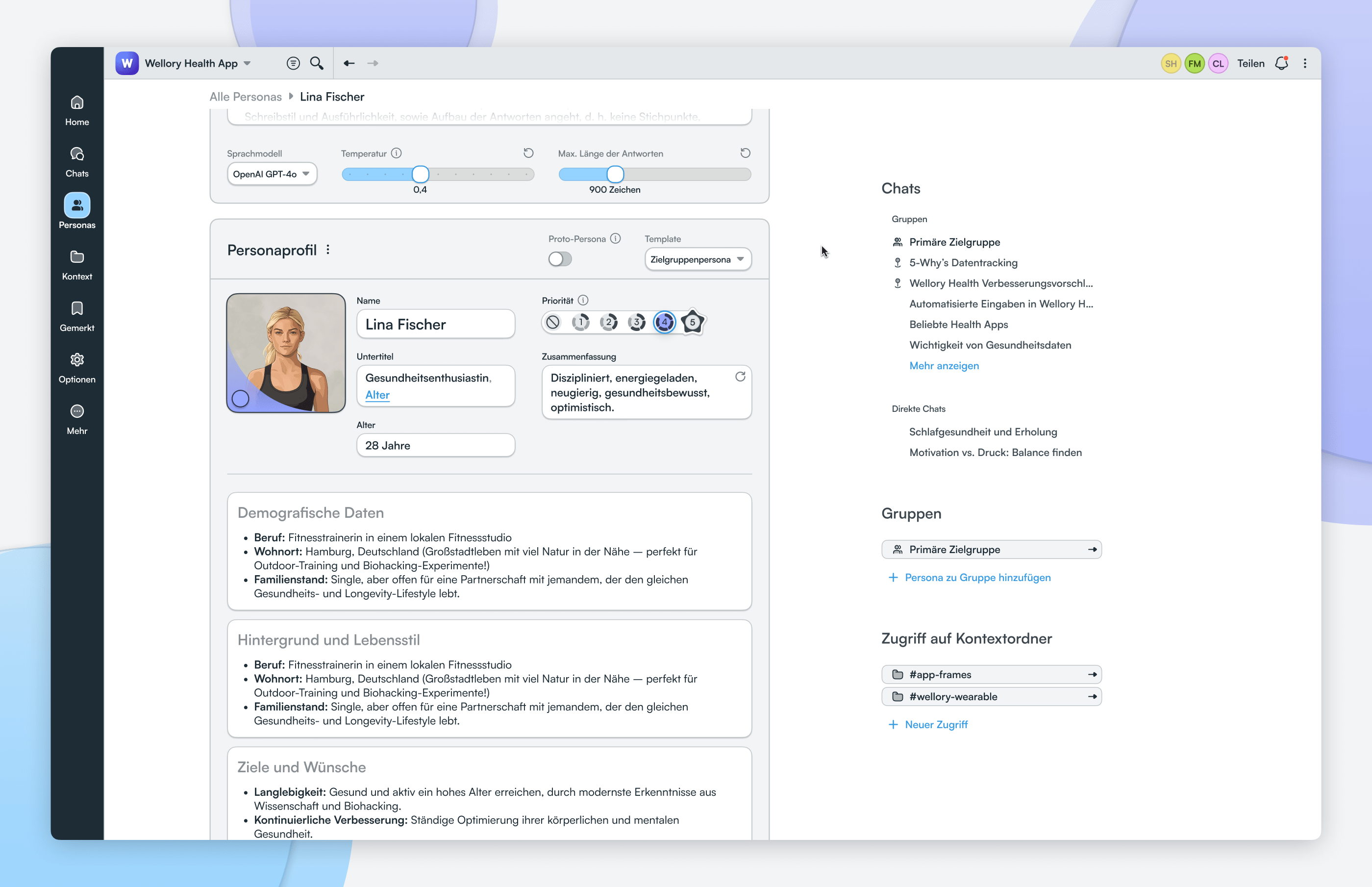 Wellory möchte seine App kontinuierlich verbessern, damit die erfassten Vitaldaten für Nutzer:innen leicht verständlich sind und sie langfristig motiviert bleiben. An dieser Stelle kommt Yosona ins Spiel: Das Team von Wellory hat in Yosona mehrere KI-Personas erstellt, die unterschiedliche Nutzertypen verkörpern – darunter Vielbeschäftigte mit wenig Zeit, Gesundheits- und Sportenthusiast:innen sowie Menschen mit speziellen Gesundheitsbedürfnissen.