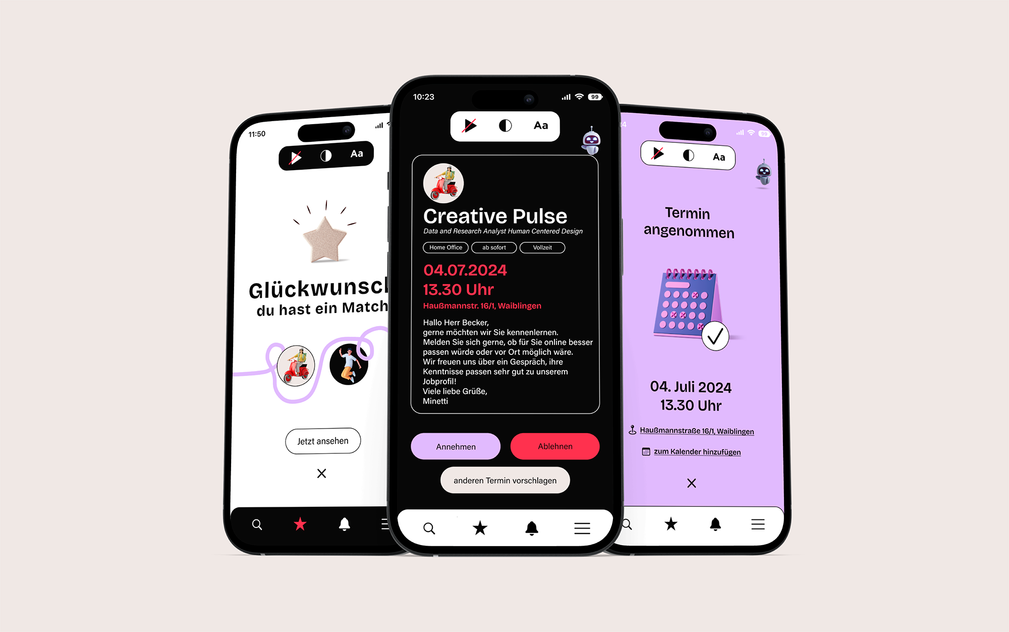 Die Plattform erleichtert mit Hilfe von künstlicher Intelligenz den Rekrutierungsprozess für KMU, indem die individuellen Fähigkeiten von Bewerbenden mit Behinderung mit den Anforderungen von KMU abgeglichen werden. So entstehen maßgeschneiderte Job Matches, die KMU und qualifizierte Fachkräfte zusammen bringen. Die Potenziale von Inklusion werden real und erfahrbar gemacht und die verbundene Diversität und Vielfalt an Lebensrealitäten in der Belegschaft stärkt die Zufriedenheit und Innovationskraft im Unternehmen.
