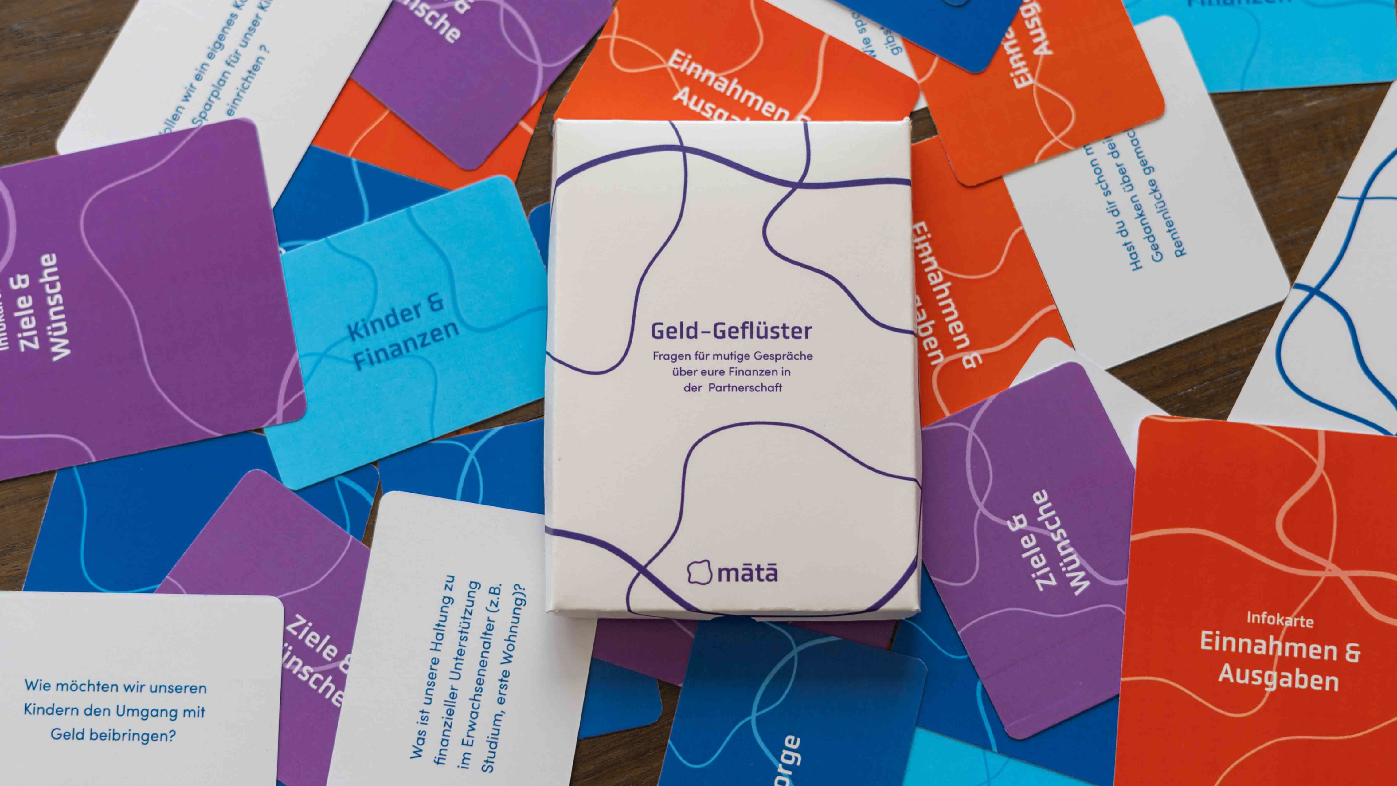 Als Ergänzung zum Finanzsimulator wurden Gesprächskarten entwickelt, um das Thema Geld frühzeitig in Beziehungen anzusprechen. Das Kartenset „Geldgeflüster“ bietet niedrigschwellige Anstöße zu Themen wie gemeinsamer Haushaltsführung, Elternzeit, Vermögensaufteilung oder Altersvorsorge. Das Ziel besteht darin, finanzielle Gleichberechtigung bereits in den frühen Phasen einer Beziehung zu berücksichtigen, bevor sich Abhängigkeiten oder traditionelle Rollenmuster festigen. Neben den Gesprächsimpulsen enthalten die Karten auch Hintergrundinformationen zu den jeweiligen Themenbereichen. So schafft das Kartenset Raum für offene und partnerschaftliche Gespräche, in denen wirtschaftliche Verantwortung geteilt und individuell verhandelt werden kann.