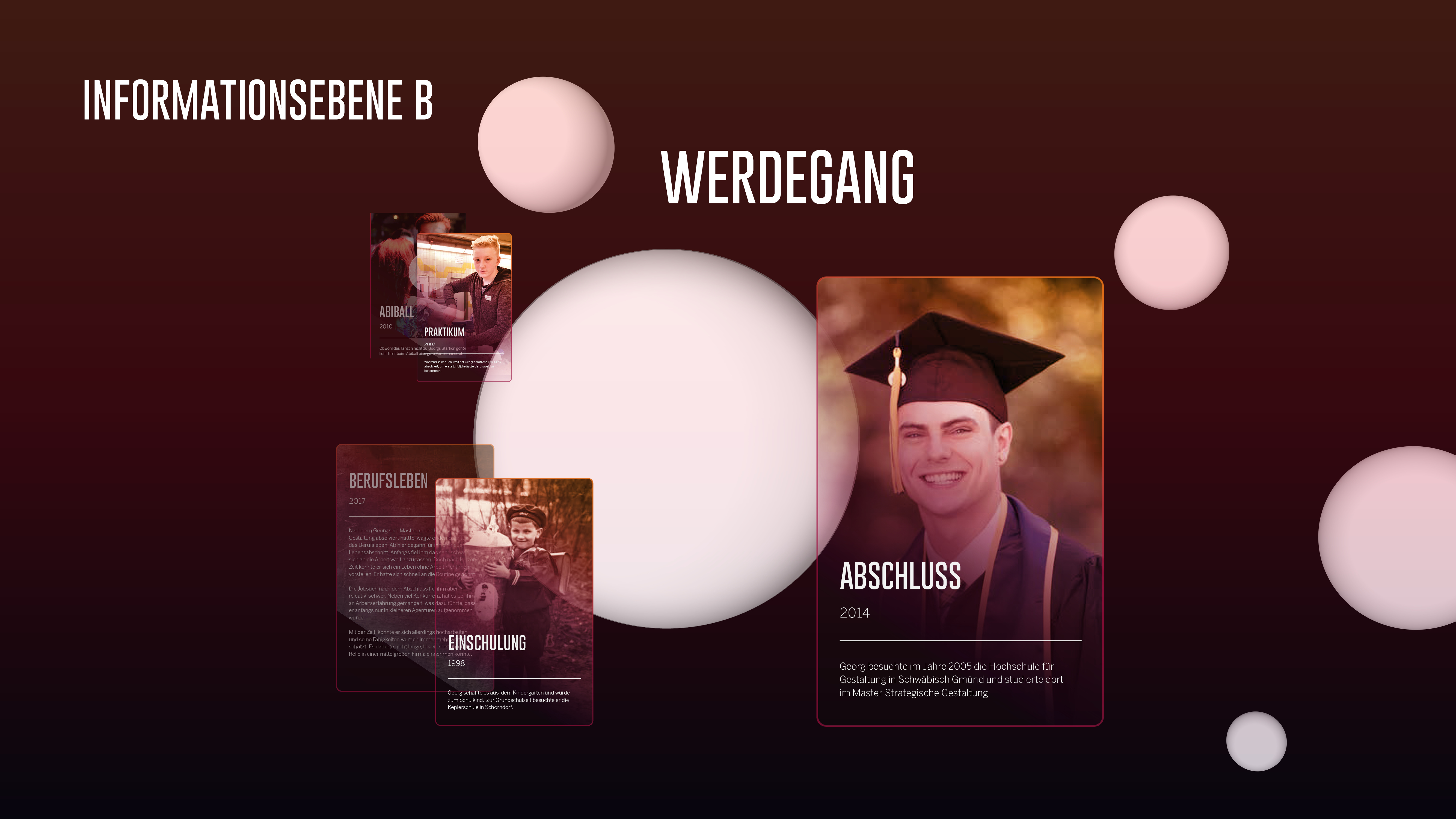 Betritt man eines der Häuser, so befindet man sich in der zweiten Ebene. Hier können detaillierte Informationskategorien angezeigt werden (z.B. Werdegang, Interessen, Orte, …). Dabei ist das Abrufen der Informationen genauestens durch die Vergabe der Zugriffsberechtigungen an bestimmte Nachkommen geregelt.