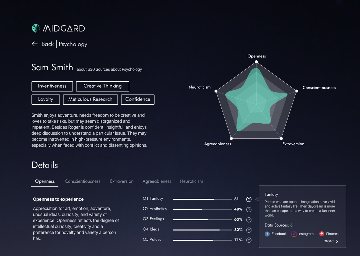 Midgard ist eine Softwareanwendung, die zur Verwaltung von personenbezogenen Daten dient. Nach der Anmeldung über die Software werden Daten gesammelt, analysiert und strukturiert, um sie so den Besitzern zugänglich und sicher nutzbar zu machen. Zentraler Punkt der Datenanalyse ist der detaillierte Profiling-Prozess, in welchem die offenen und freigegebenen Daten nach der Strukturierung intelligent vernetzt werden. Dadurch entsteht ein digitales Abbild, über welches der Nutzer frei verfügen kann.