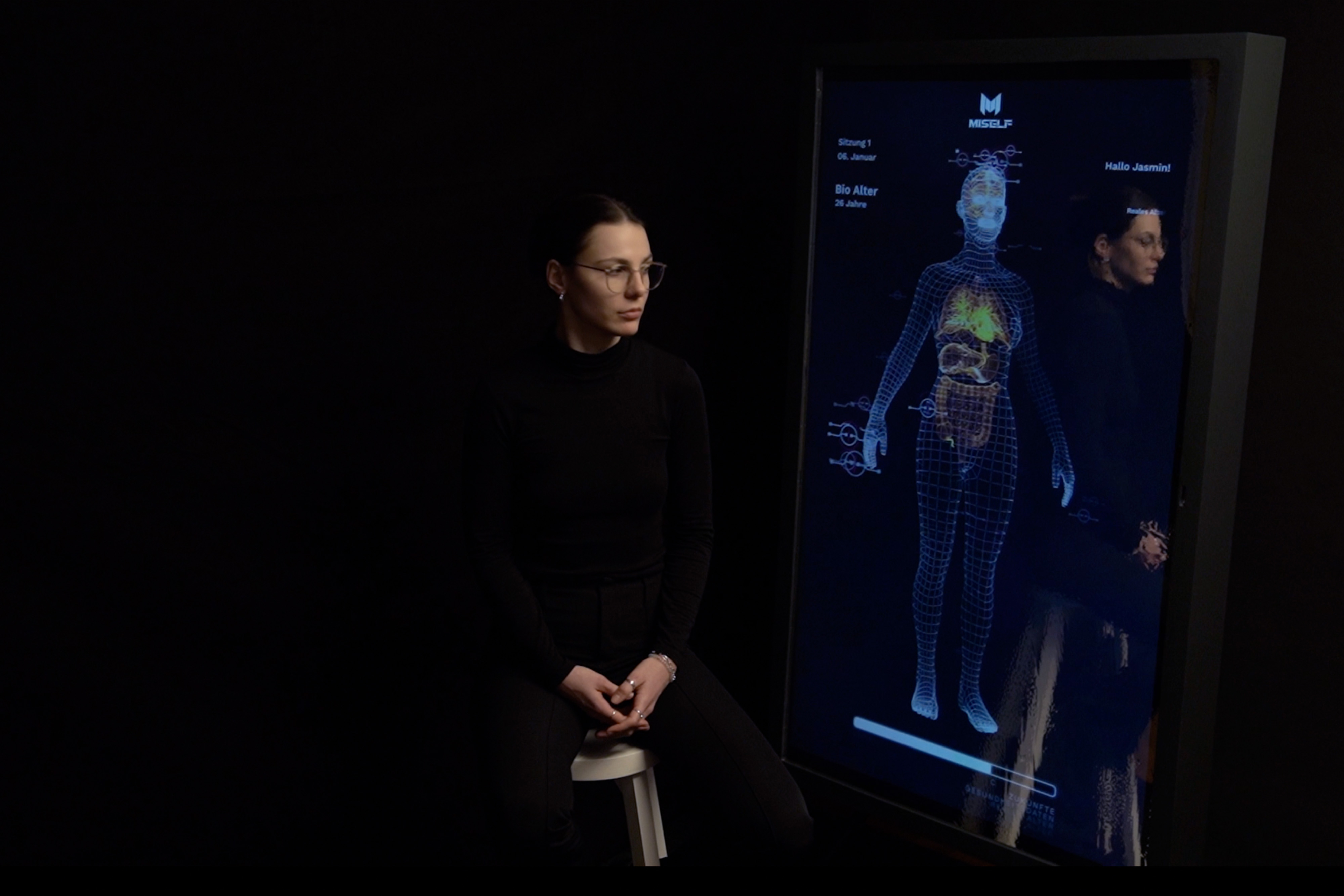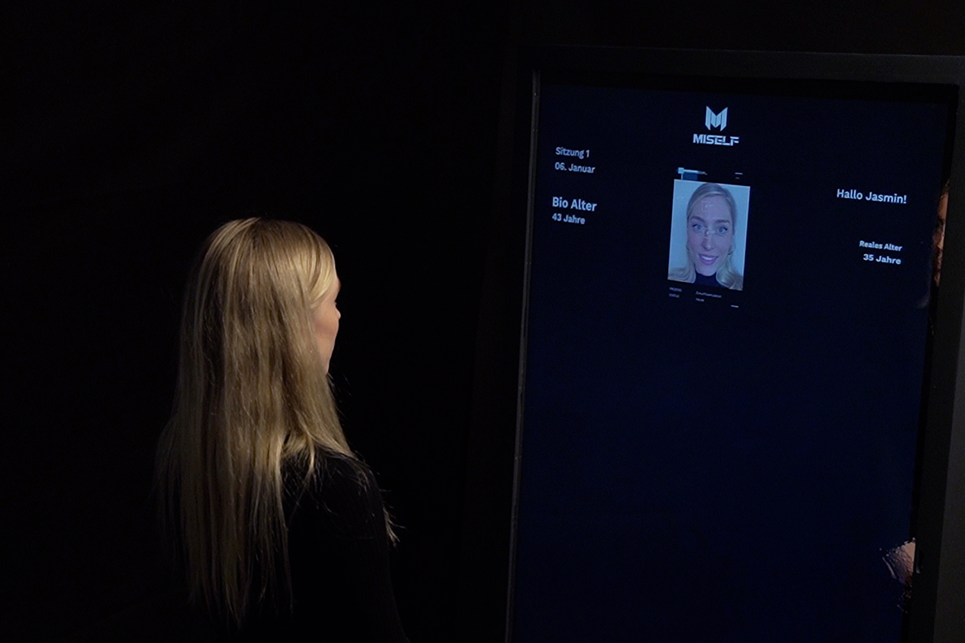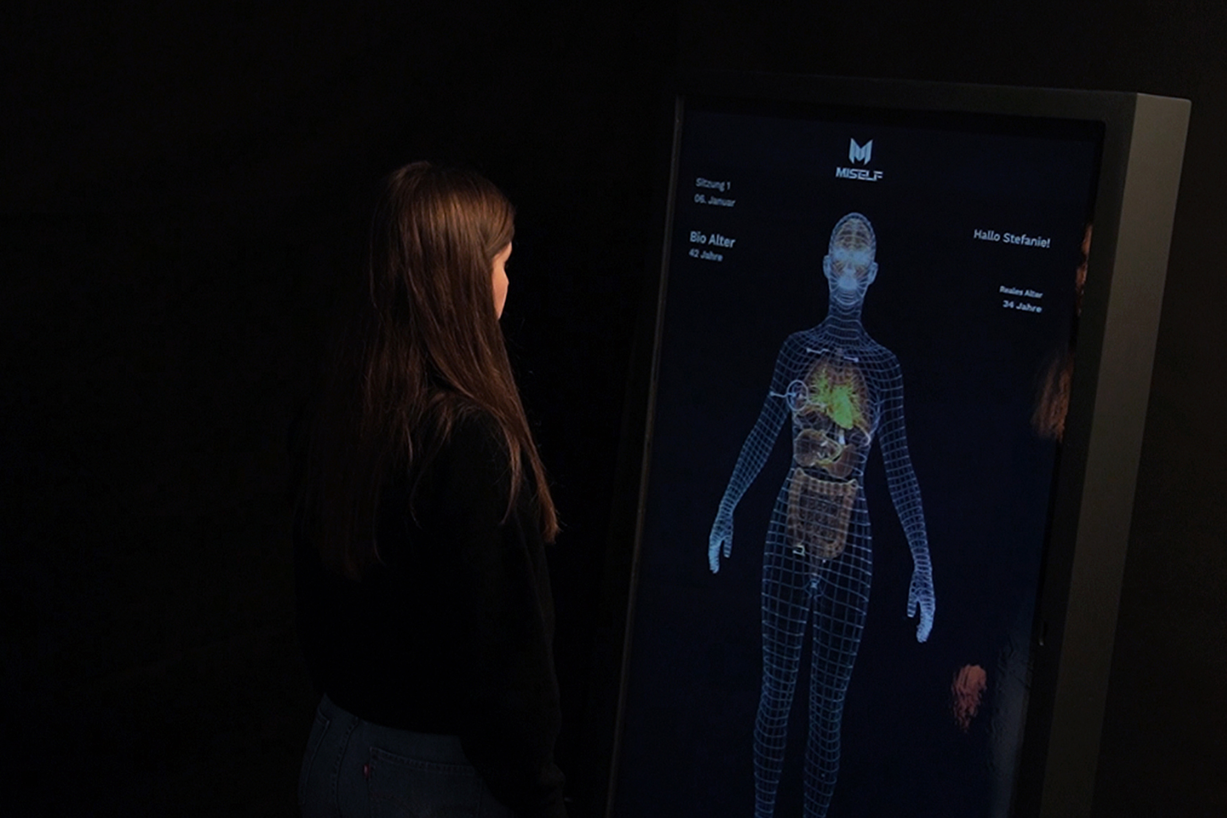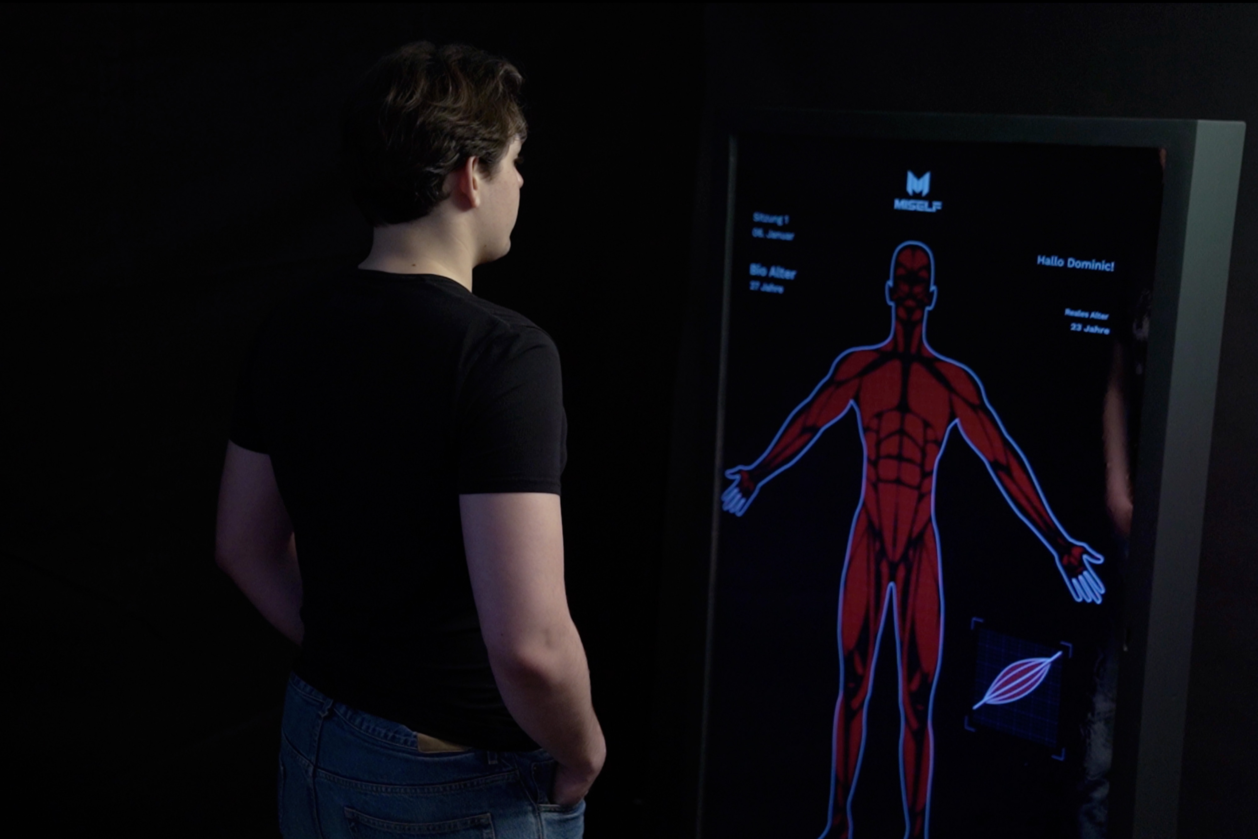 Miself ist ein Smart Mirror. Unter dem Aspekt des aktiven Alterns und der Motivationssteigerung ist ein Prototyp entstanden. Darin wurden verschiedene Visualisierungsformen eines digitalen Zwillings des Menschen integriert und potenzielle Zukünfte in Bezug auf Gesundheitsvorhaben simuliert.