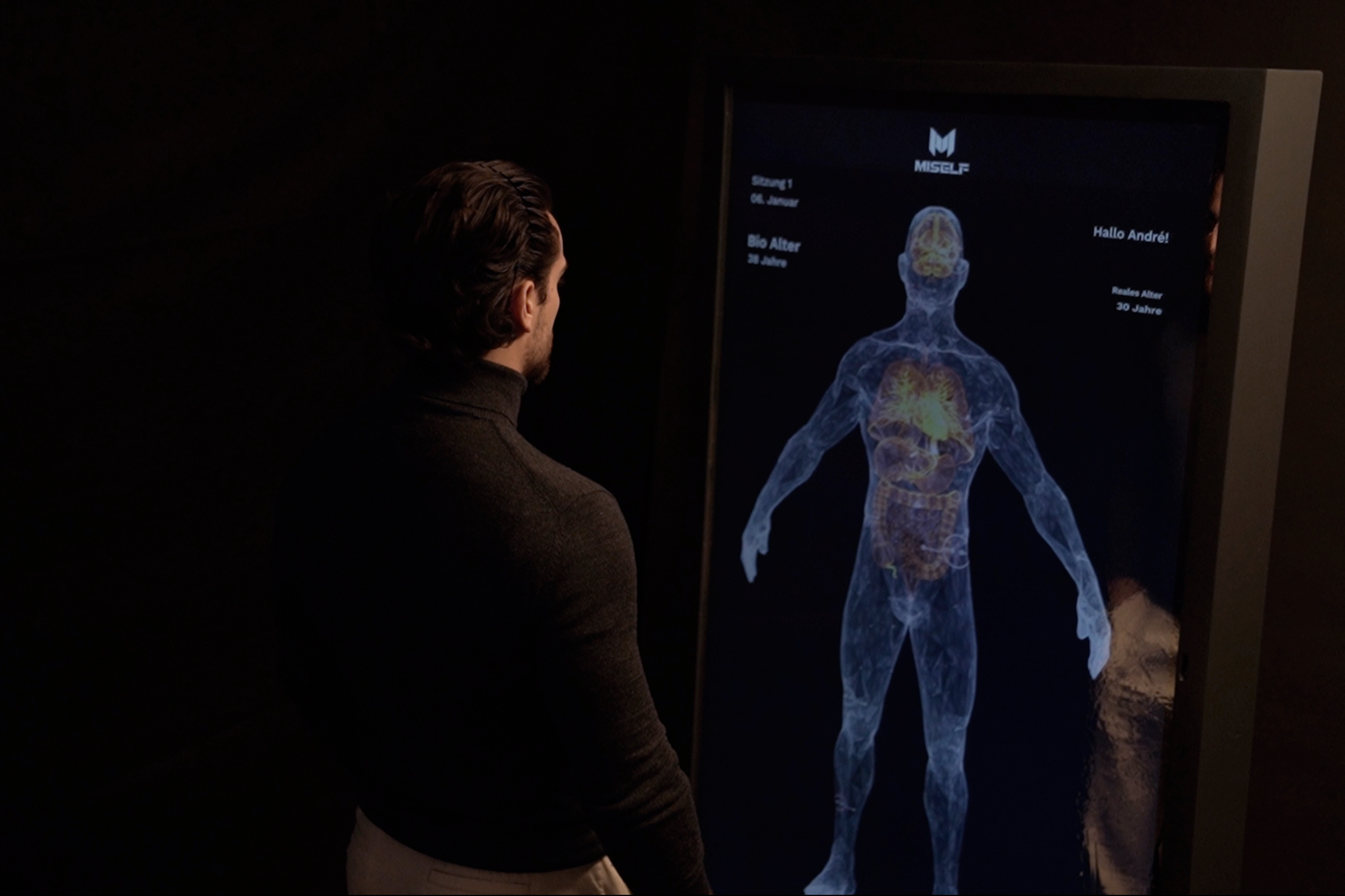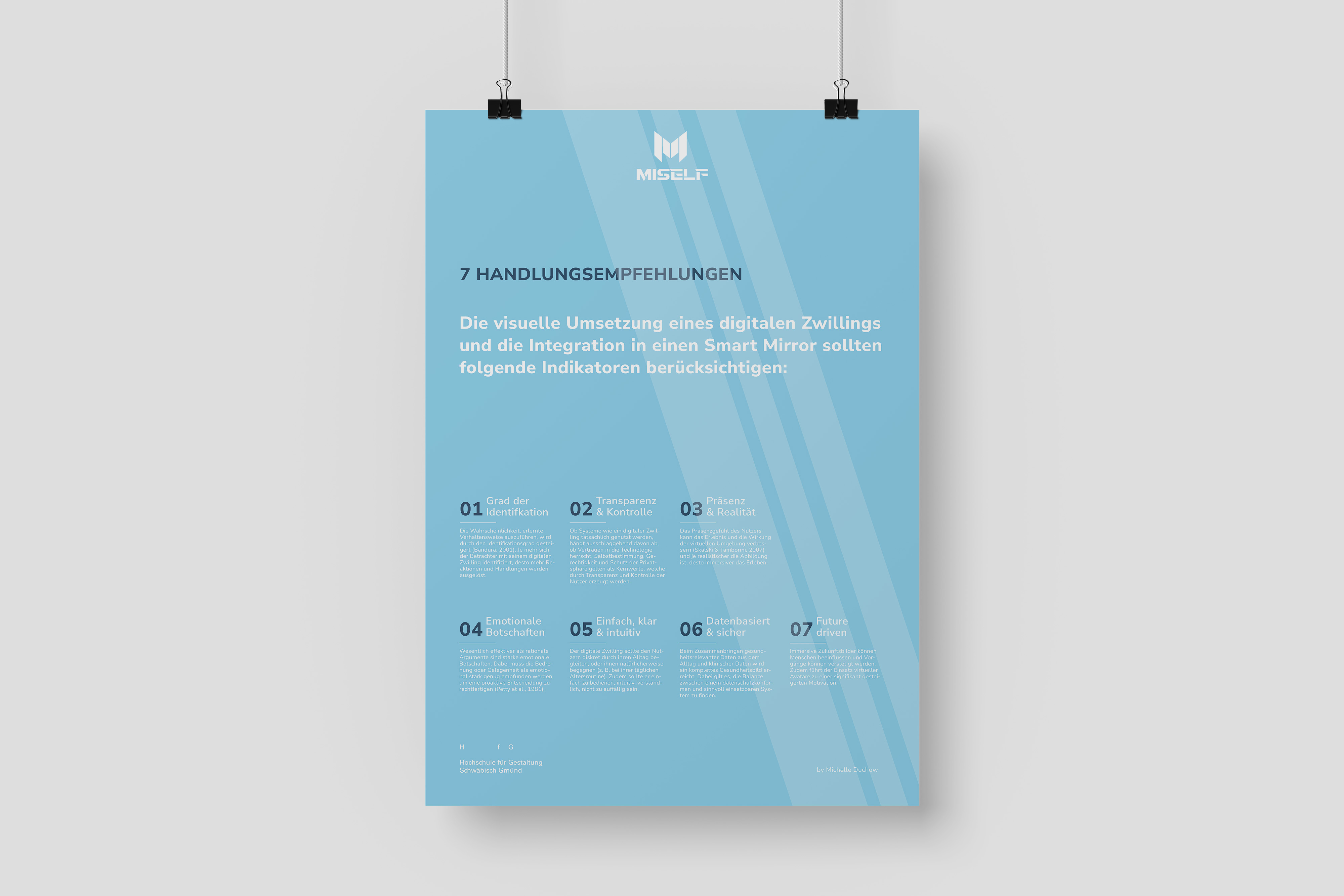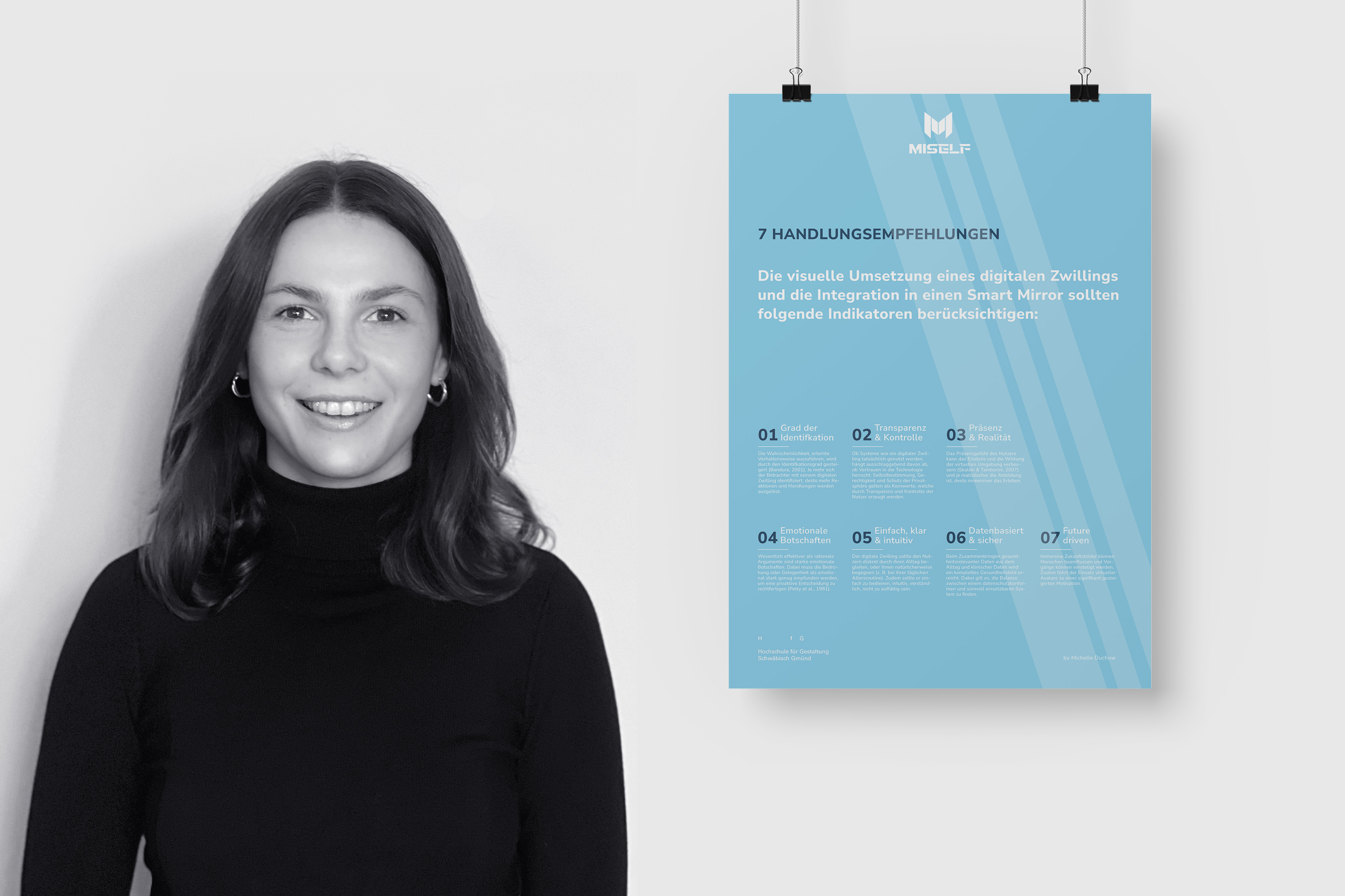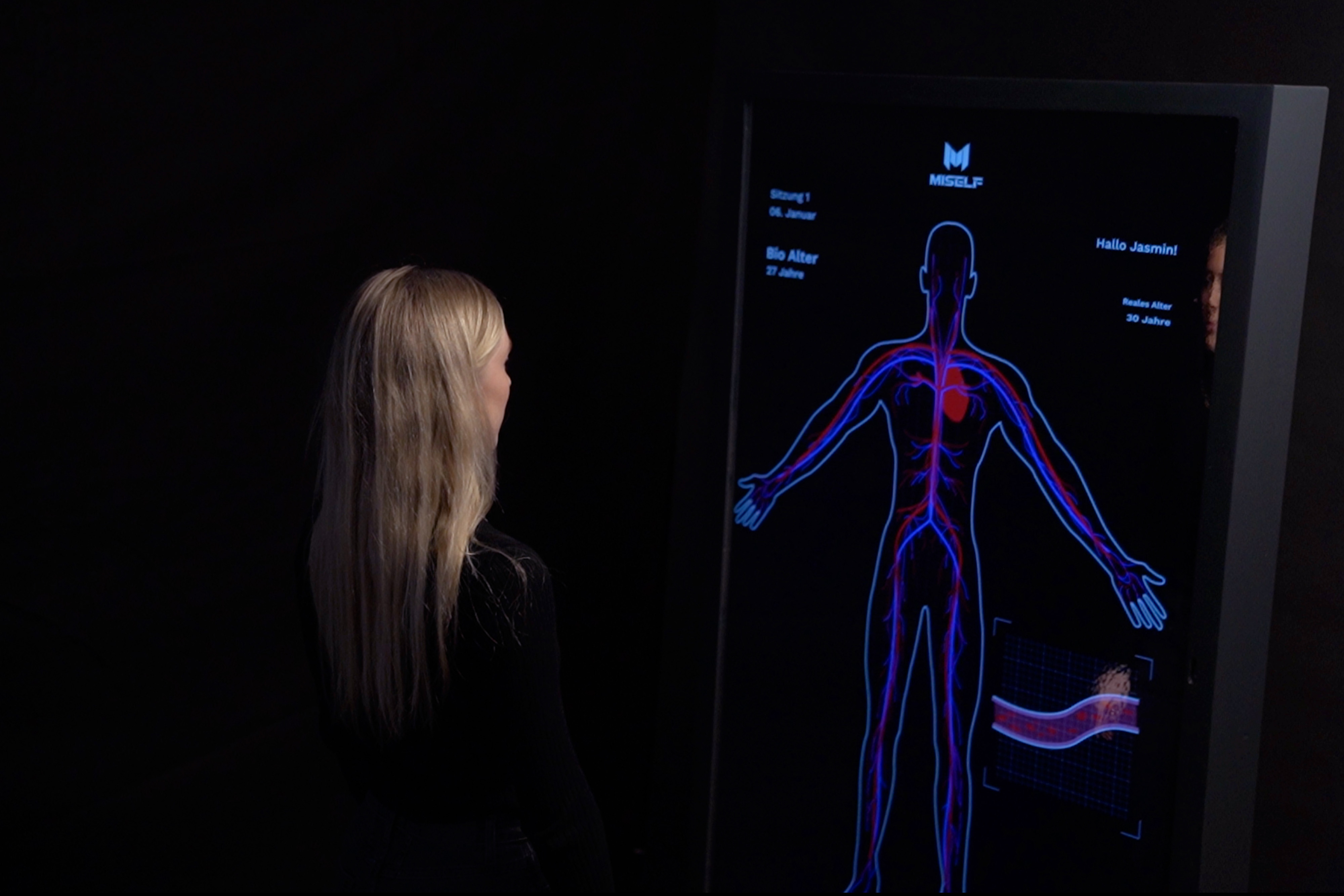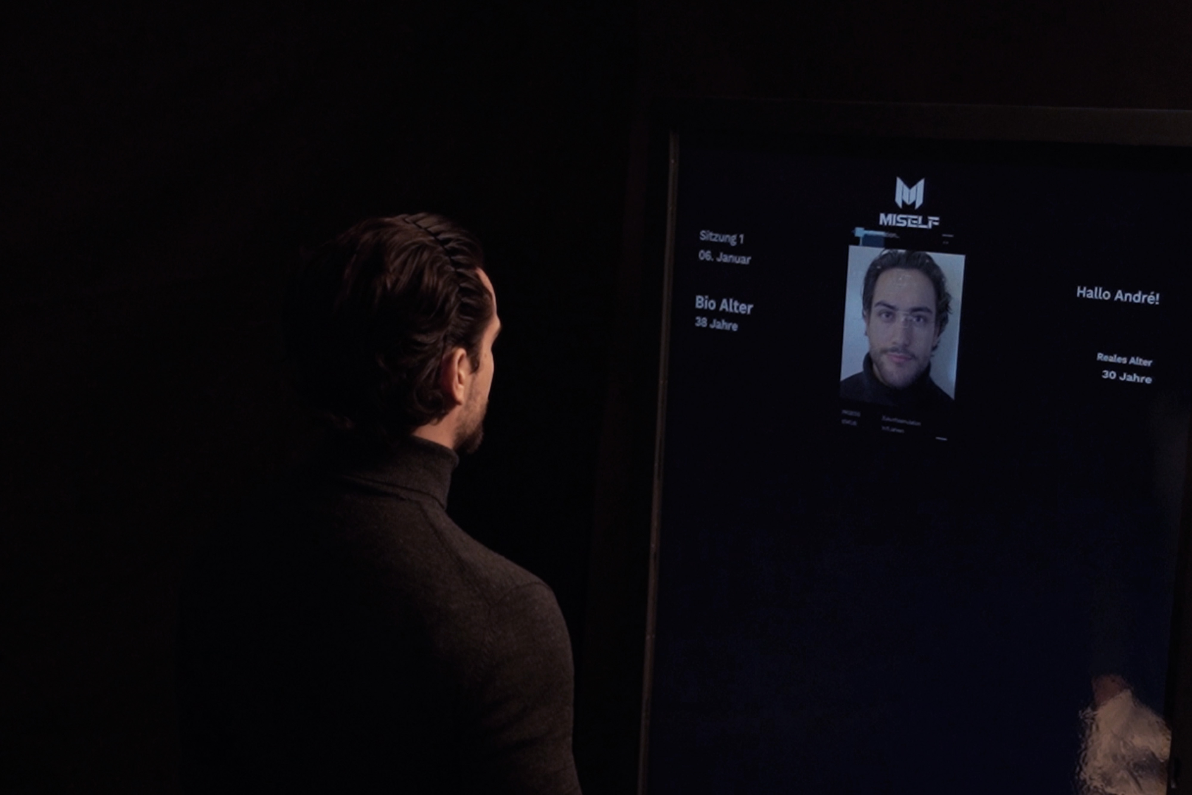 Miself ist ein Smart Mirror. Unter dem Aspekt des aktiven Alterns und der Motivationssteigerung ist ein Prototyp entstanden. Darin wurden verschiedene Visualisierungsformen eines digitalen Zwillings des Menschen integriert und potenzielle Zukünfte in Bezug auf Gesundheitsvorhaben simuliert.