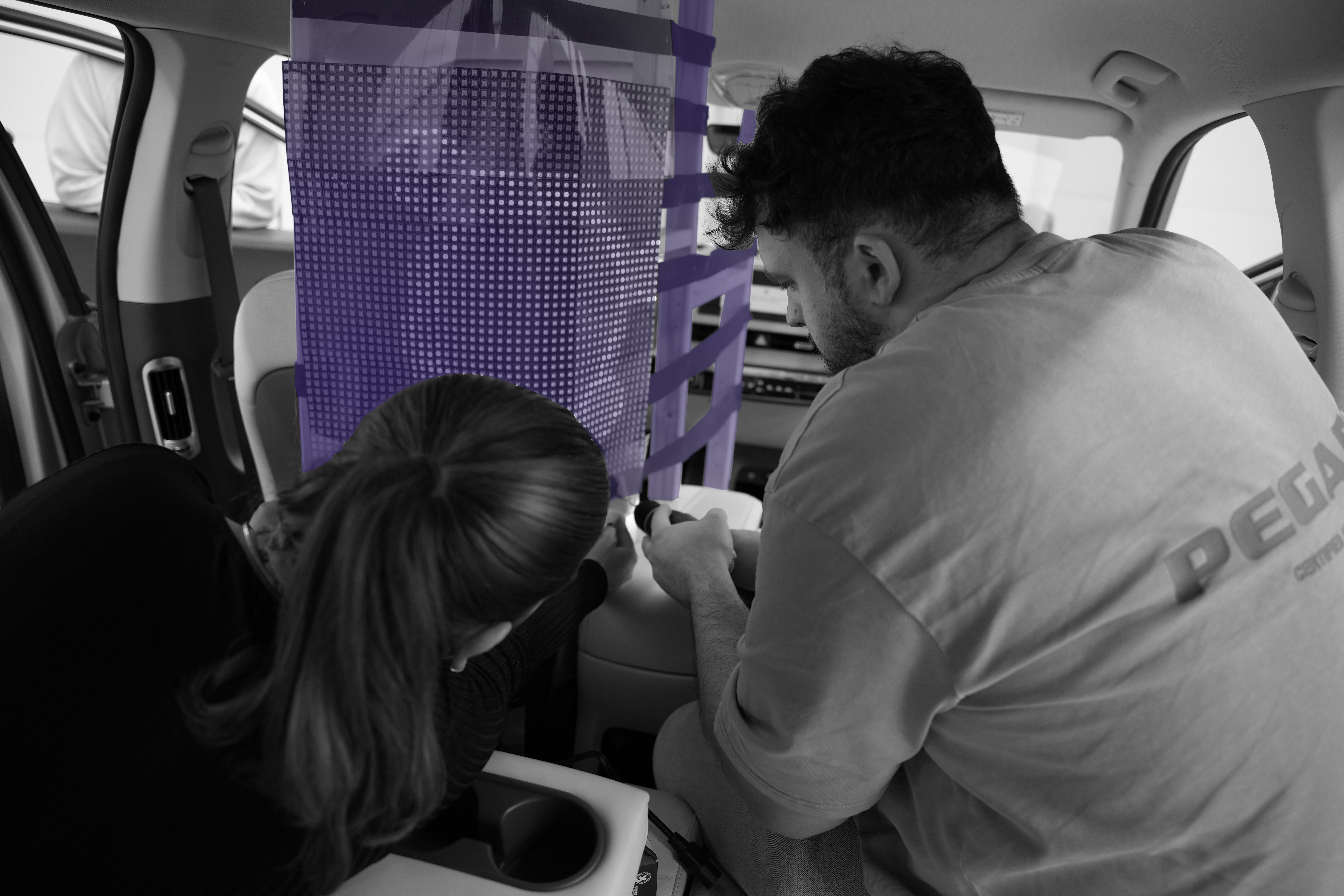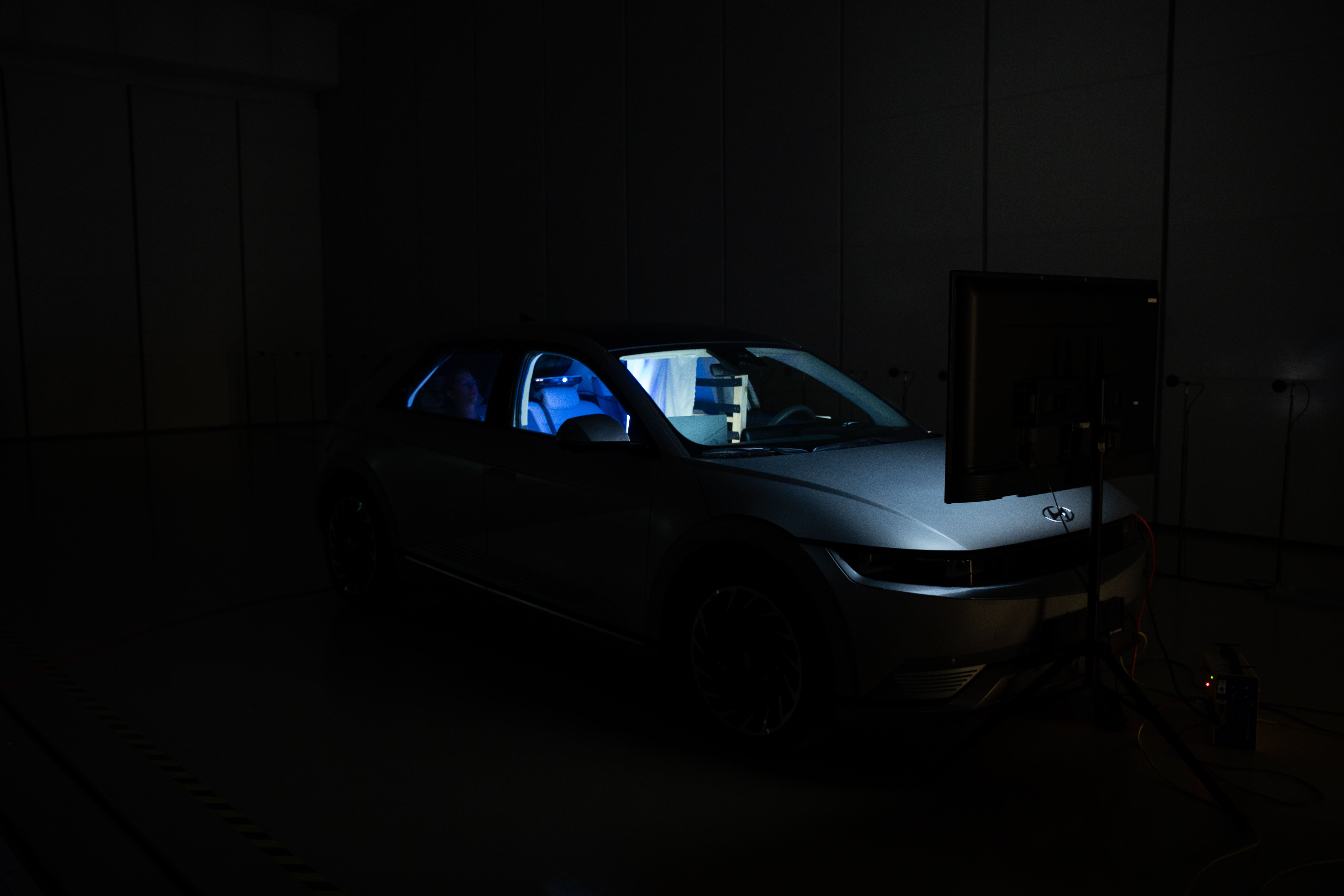 Für die NutzerInnentests wurde das Interieur des Hyundai Ioniq 5 so verändert, dass eine optimale Testumgebung geschaffen wird. Zwei Bildschirme wurden installiert: ein Monitor auf der Beifahrerseite zeigt Fahrtinformationen, während der Beifahrersitz entfernt wurde, um mehr Beinfreiheit zu bieten.