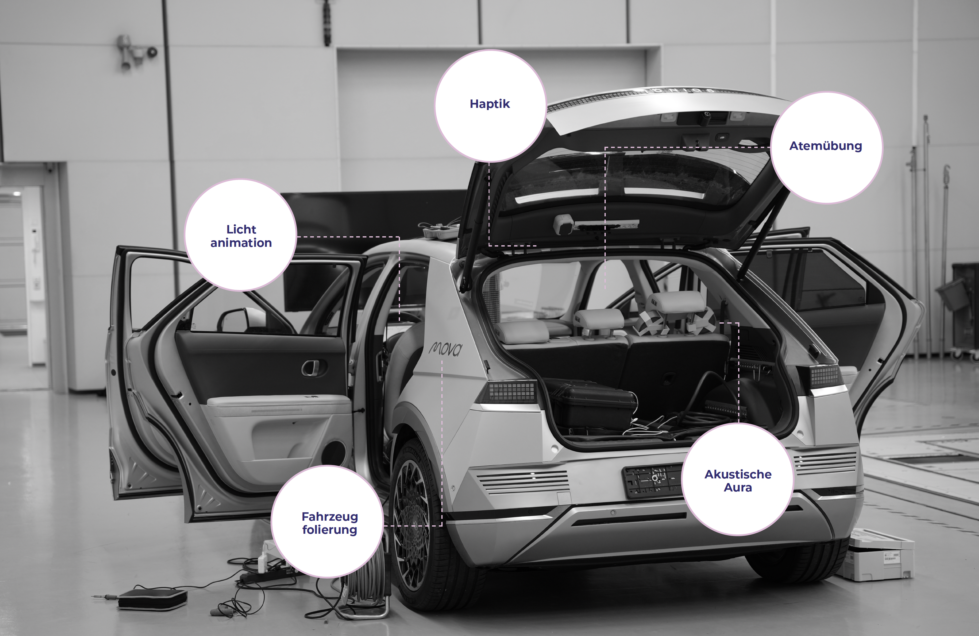 Die Masterthesis „Mova - Gestaltungsvorschlag eines immersiven Ride-Hailing Fahrdienstes zur Regeneration von PassagierInnen“ im Studiengang Strategische Gestaltung an der Hochschule für Gestaltung Schwäbisch Gmünd verfolgt das Ziel, ein innovatives Fahrzeuginnenraumkonzept zu entwickeln. Dieses Konzept fördert durch die Interaktion mit Atemtechniken, Licht und Ton die mentale Gesundheit der PassagierInnen während der Fahrt. Angesichts des zunehmenden Alltagsstresses ist es von entscheidender Bedeutung, Entspannungselemente in Mobilitätslösungen zu integrieren. Der Fokus liegt auf der Gestaltung eines adaptiven Innenraums, der durch interaktive Elemente wie dynamische Beleuchtung, Soundlandschaften und Atemübungen das Wohlbefinden der PassagierInnen steigert.