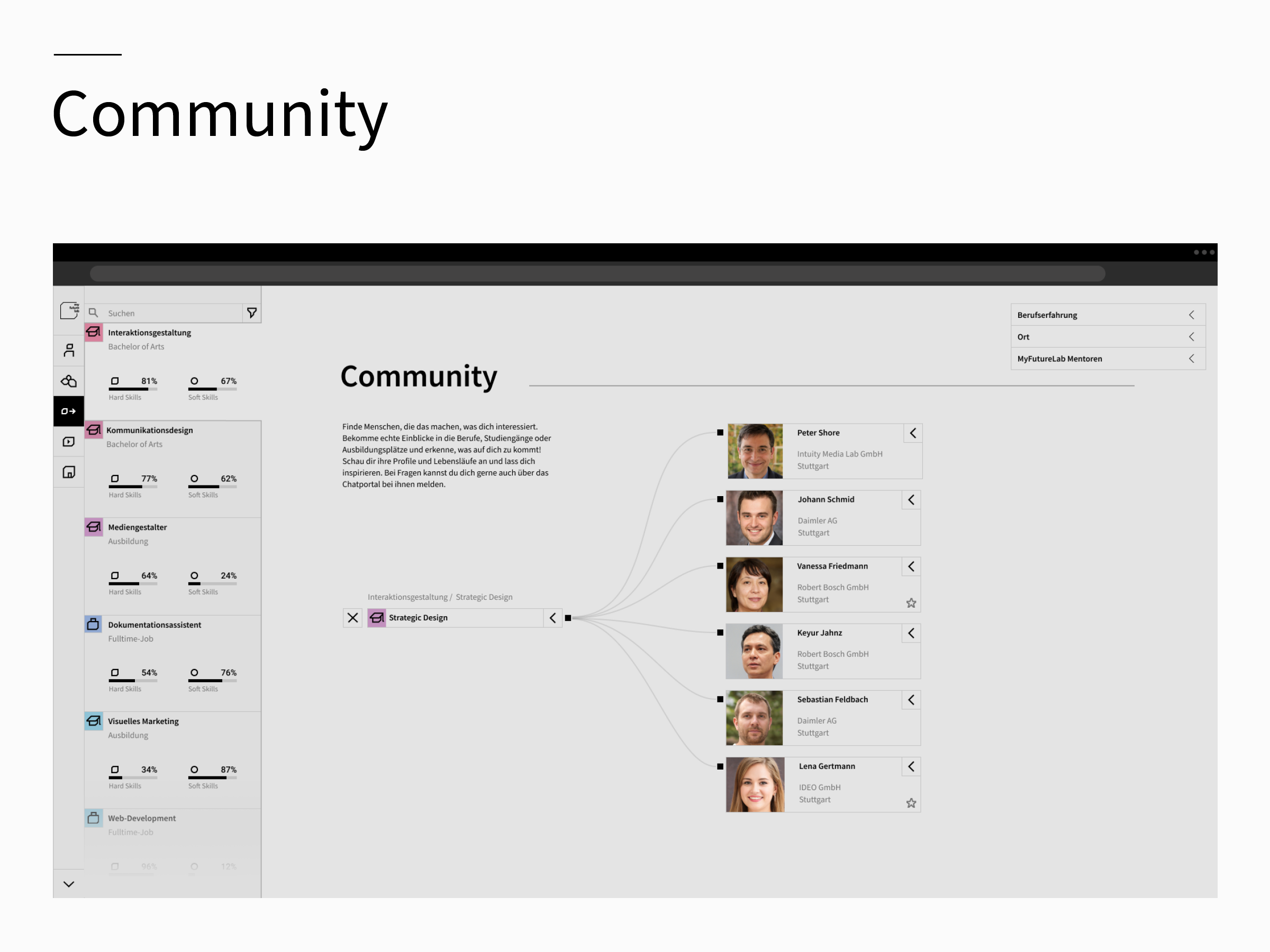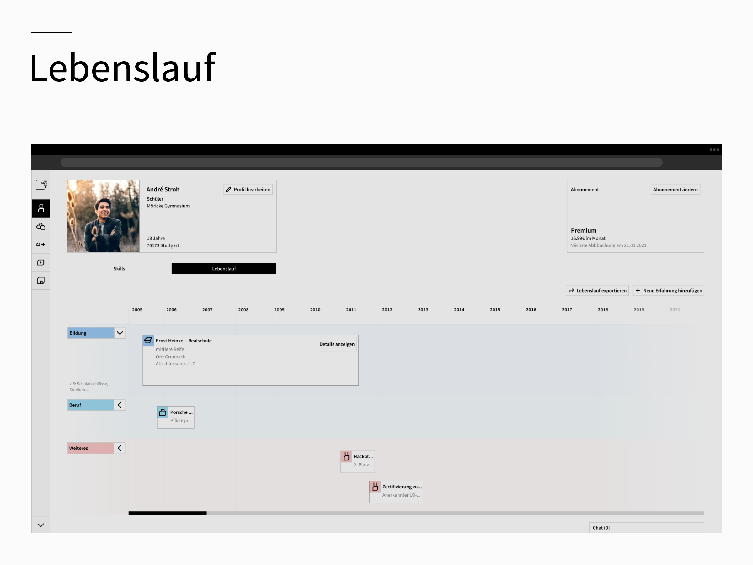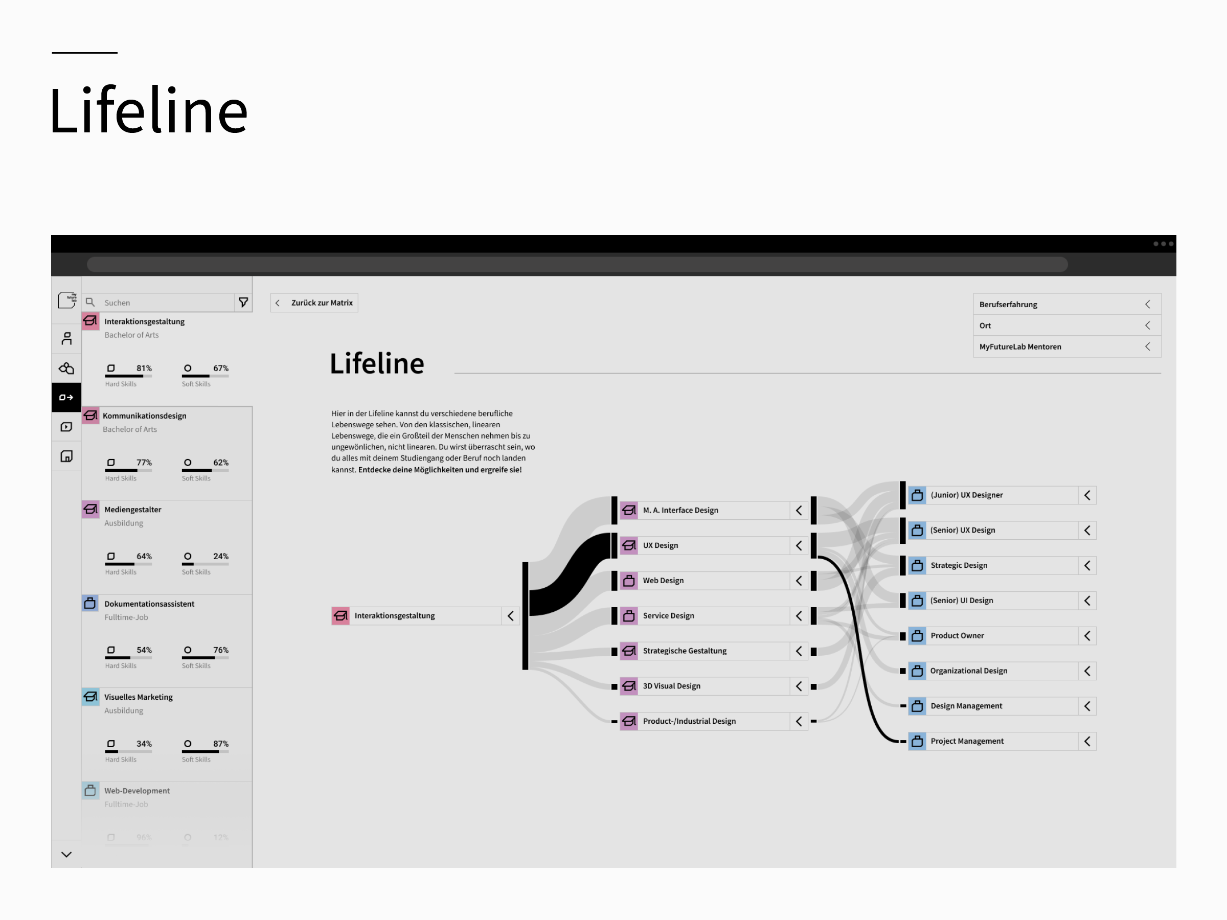 Inspiration und einen Zukunftsausblick erlangen unsere Nutzer:innen in unserer Lifeline. Dort werden verschiedene berufliche Wege aufzeigt, die man beispielsweise mit einem bestimmten Studium gehen kann. Die Lifeline soll zudem auch durch das Aufzeigen nicht linearer Lebenswege Mut machen.