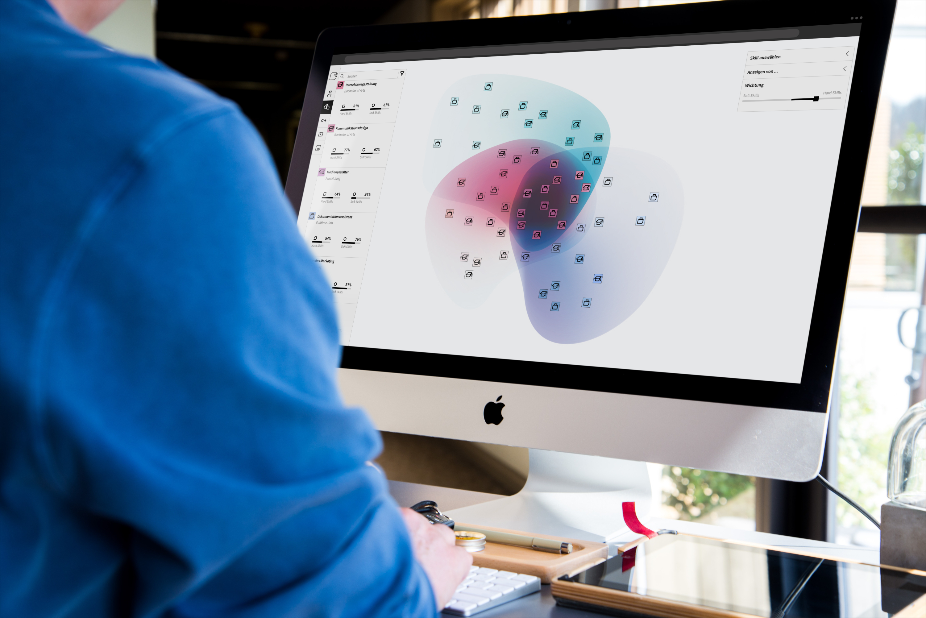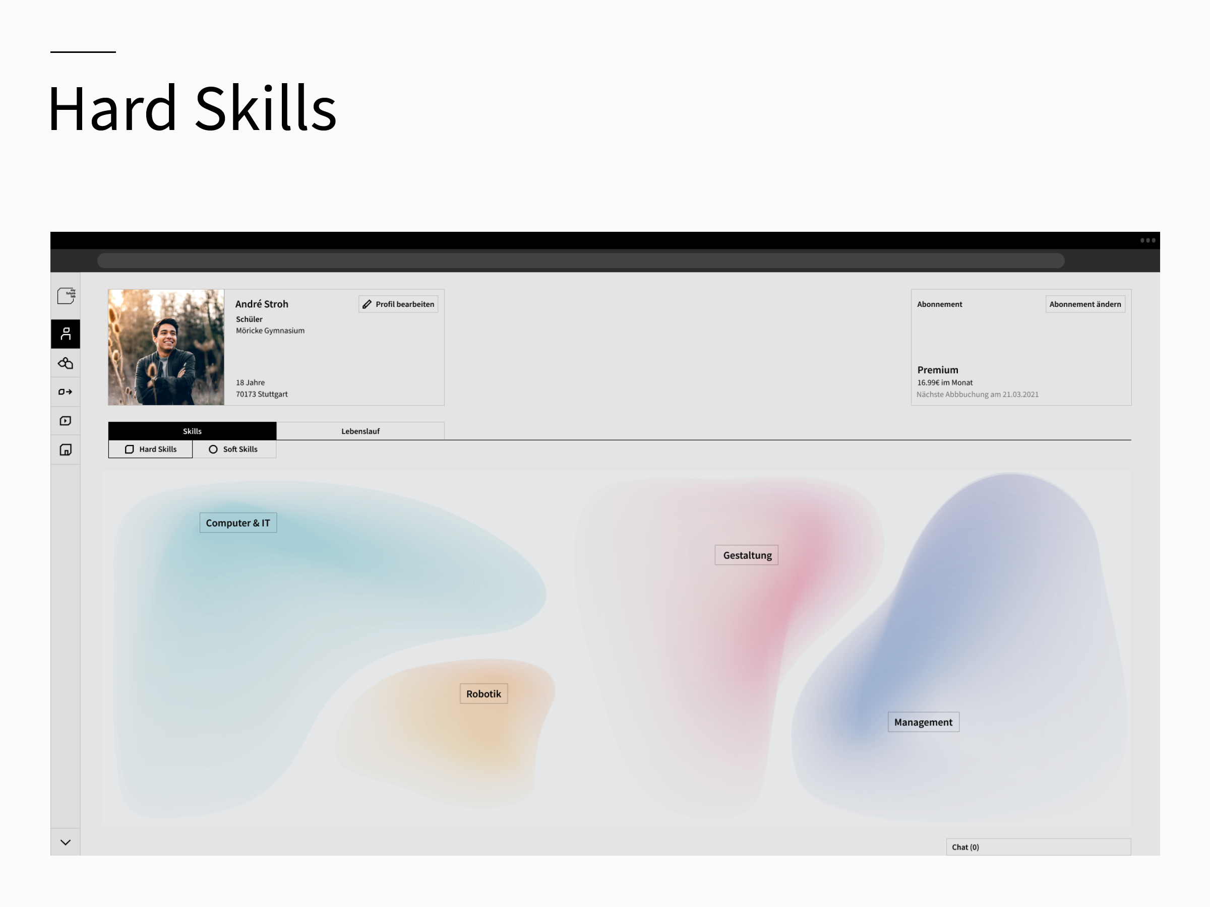 In der Übersicht der Hard Skills erhalten die Nutzer:innen visuelles Feedback ihrer fachlichen Kompetenzen. Diese werden thematisch in farbige Formen untergliedert.
