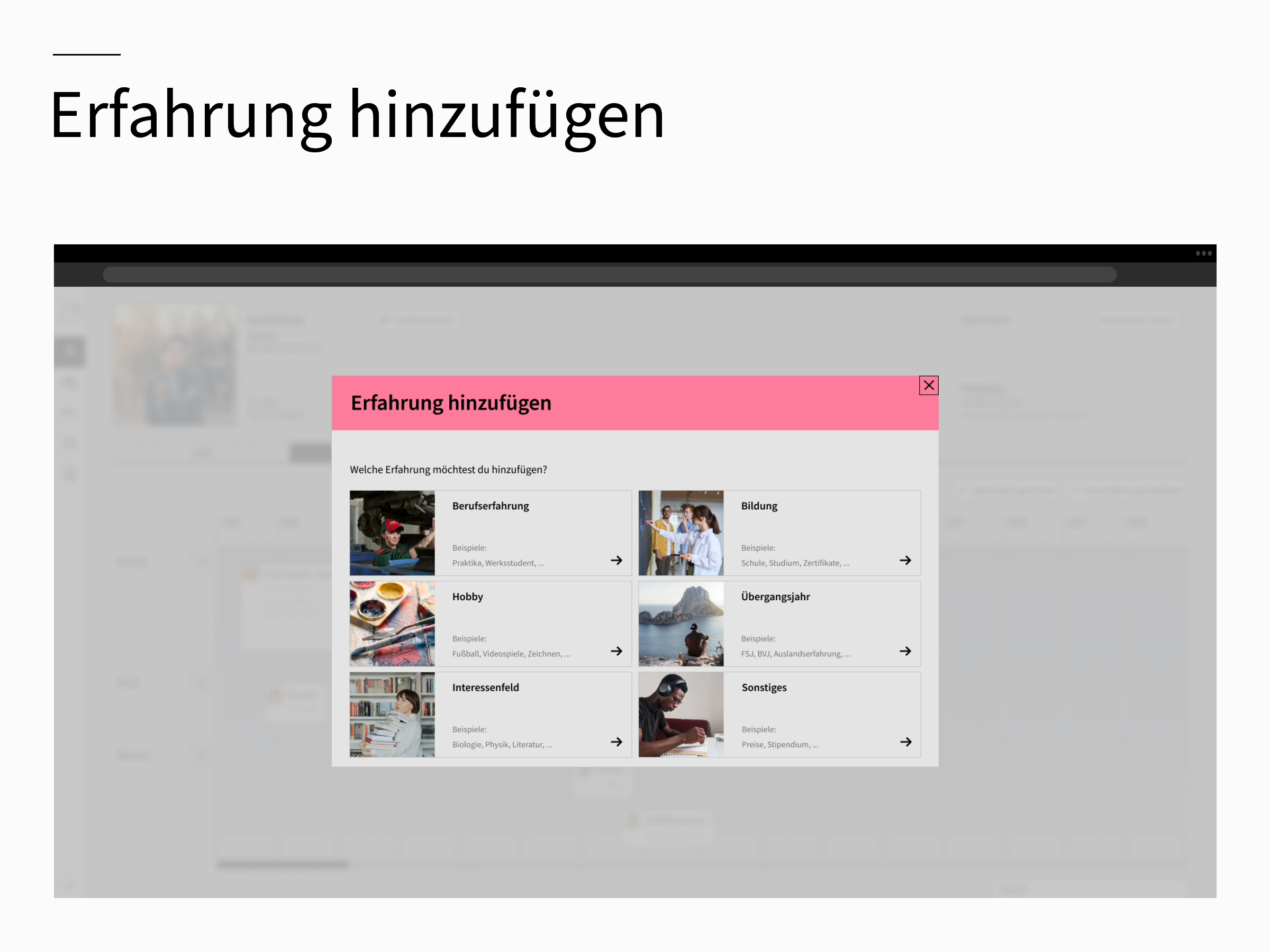 Hobbys, Praktika oder andere Erfahrungen können von den Nutzer:innen im Fragebogen eintragen. Nach Eingabe der Erfahrung werden passende Skills vorgeschlagen, die sich sie sich möglicherweise schon angeeignet haben. Daraus entscheiden die Nutzer:innen, was auf sie zutrifft und erkennen, was sie schon alles können.