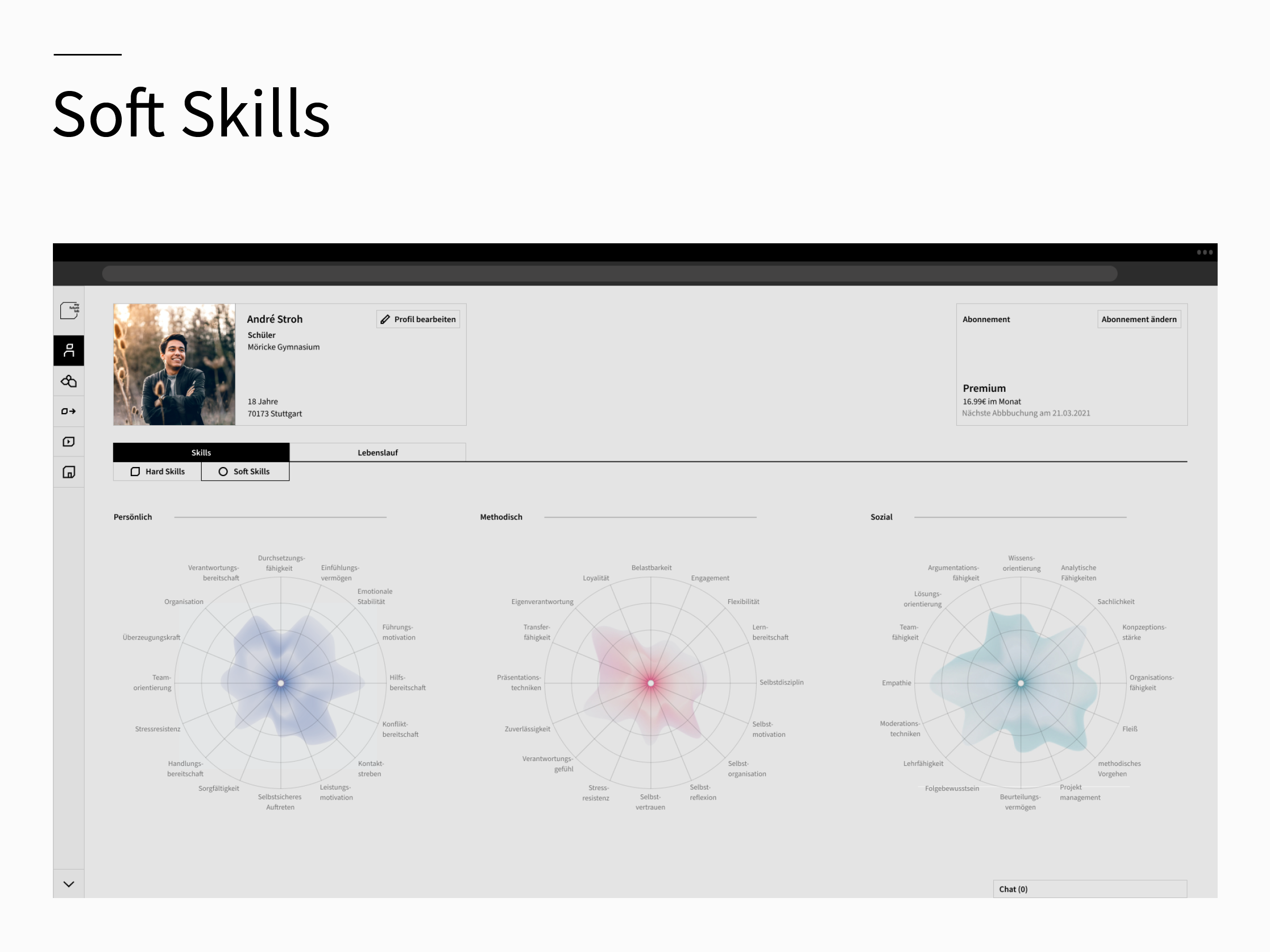 In der Soft Skill Übersicht werden die erworbenen Skills mithilfe von Netzgrafiken dargestellt. Bei den Softskills unterteilen wir in die persönlichen, methodischen und sozialen Skills.