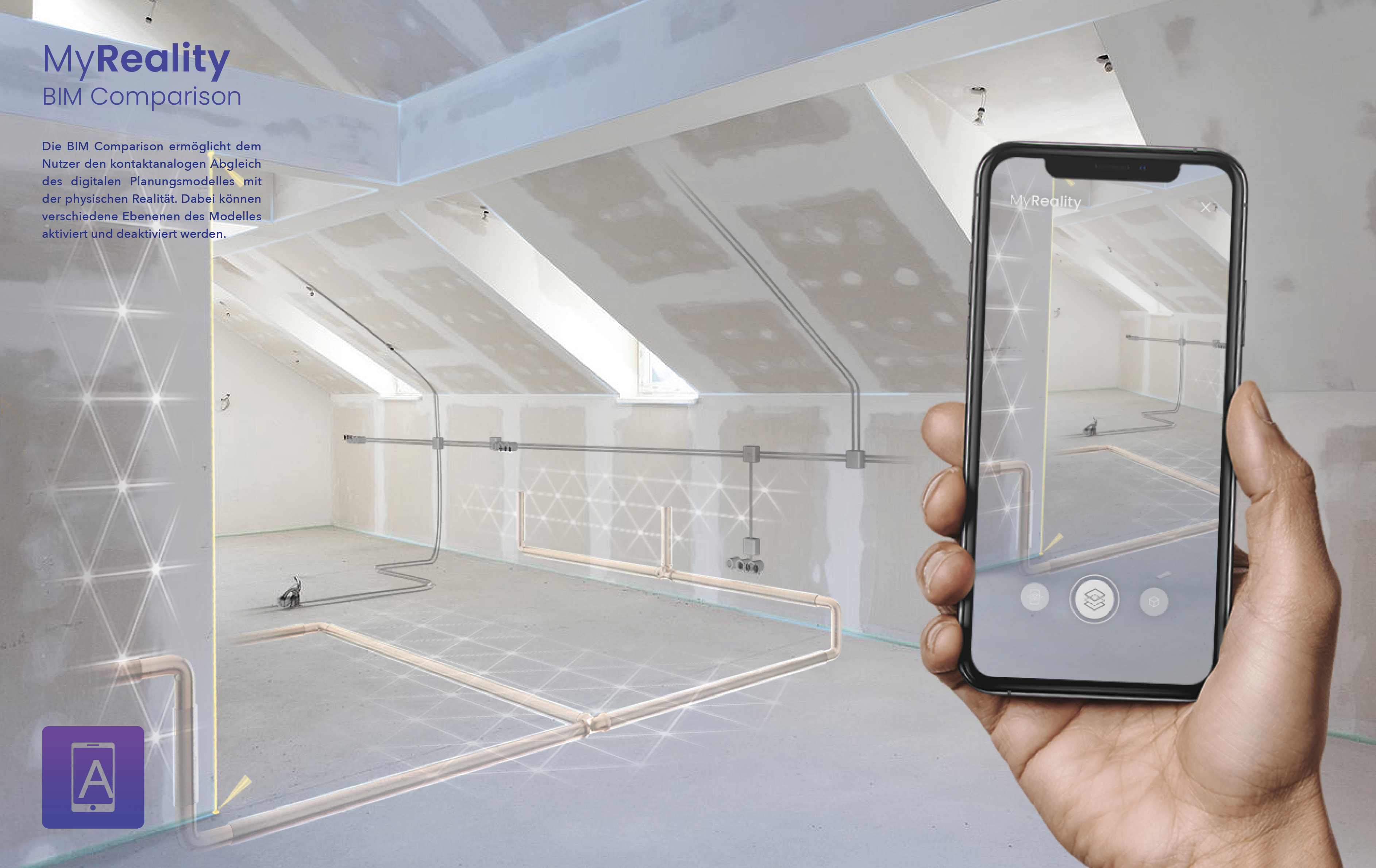 MyReality BIM Comparison | Die MyReality BIM Comparison lässt BauherrInnen einen Blick hinter die Fassade ihres Projektes werfen. Hierfür wird die App mit aktivierter Kamera auf die voranschreitenden Bauarbeiten gerichtet, wobei ein digitales Planungsmodell in seiner ganzen Vielfalt über die physische Realität projiziert wird. Somit kann beispielsweise veranschaulicht werden, wo Leitungen innerhalb einer Wand verlaufen, oder wo Bauarbeiten nicht entsprechend der Planung umgesetzt wurden. Der Nutzer kann dabei verschiedene Ebenen des Modells ein- und ausblenden.