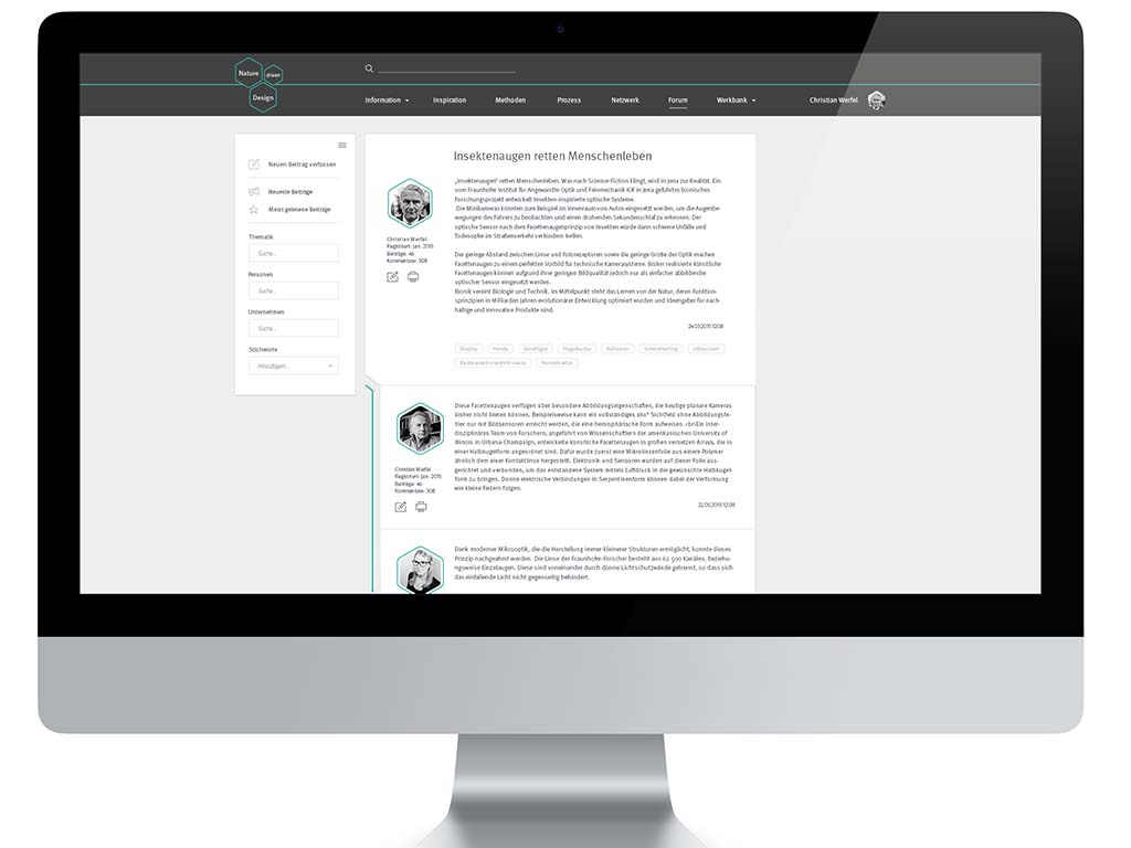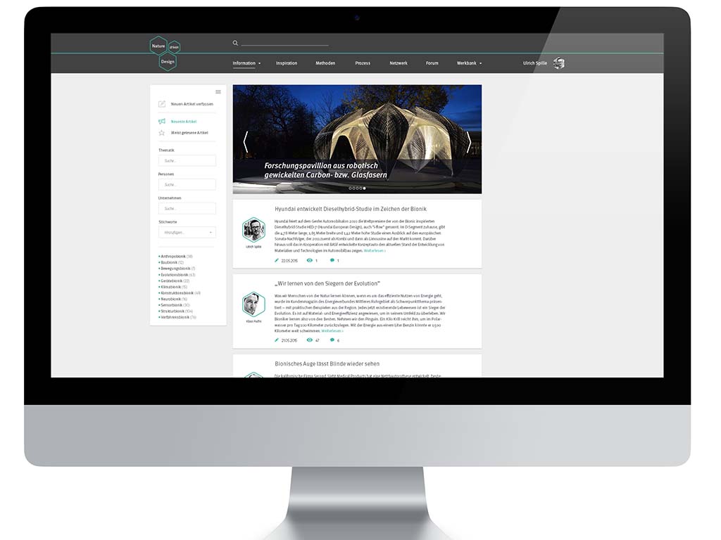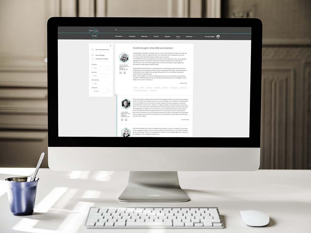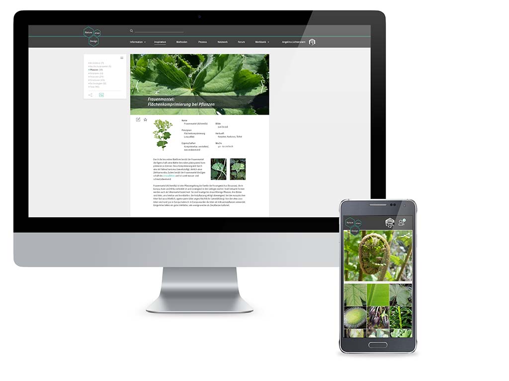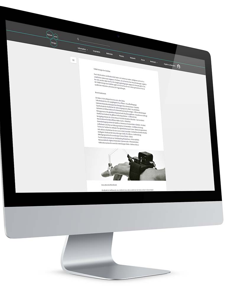 NATURE driven DESIGN ist eine adaptive Plattform für Bioniker, Produktenwickler und Studenten. Sie bietet weitreichende Informationen zum Thema Bionik, dient als Inspirationsquelle und beinhaltet ein Tool zur Unterstützung in Produktenwicklungprozessen, durch das Bereitstellen von prozessrelevanten Methoden.