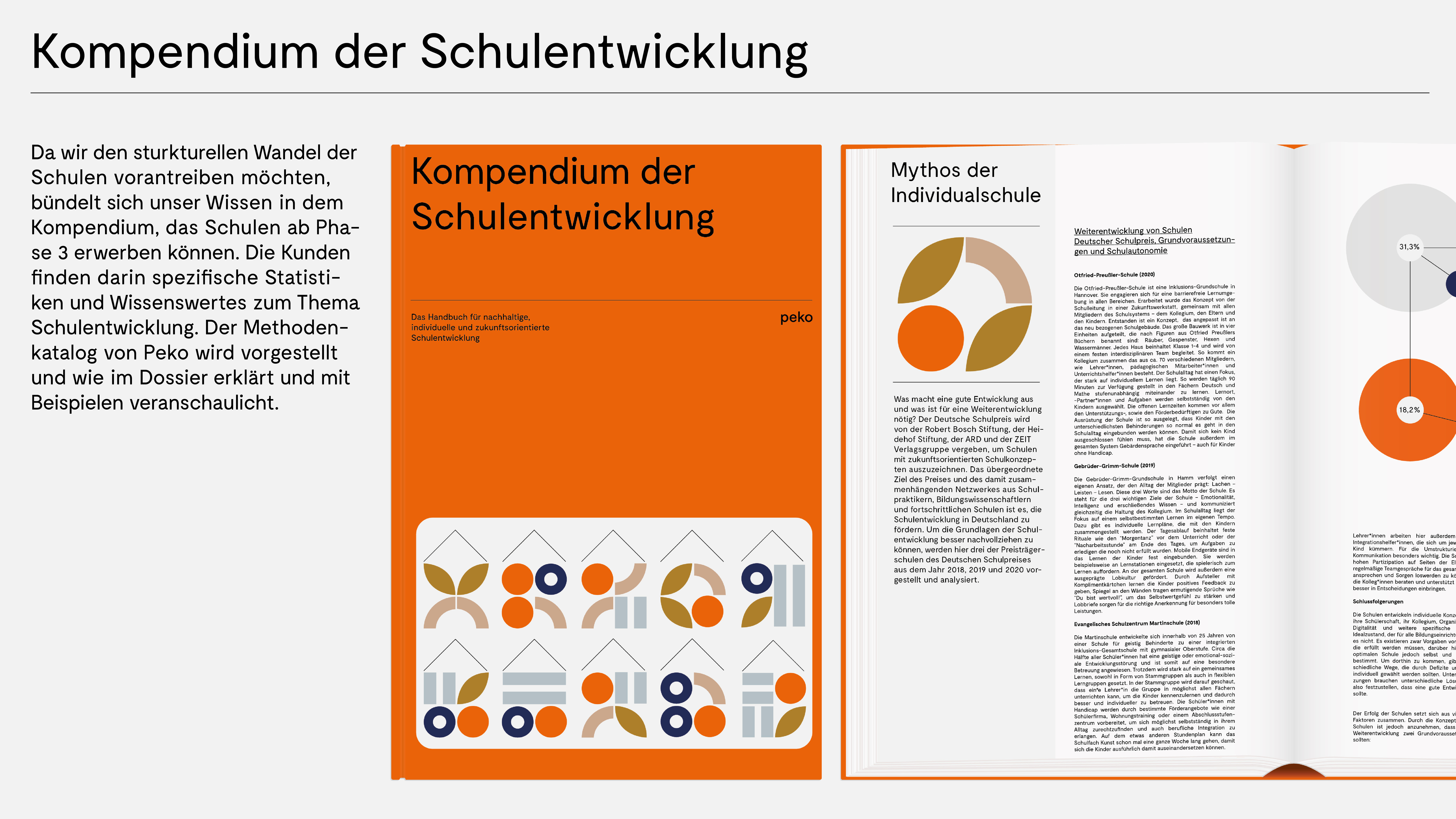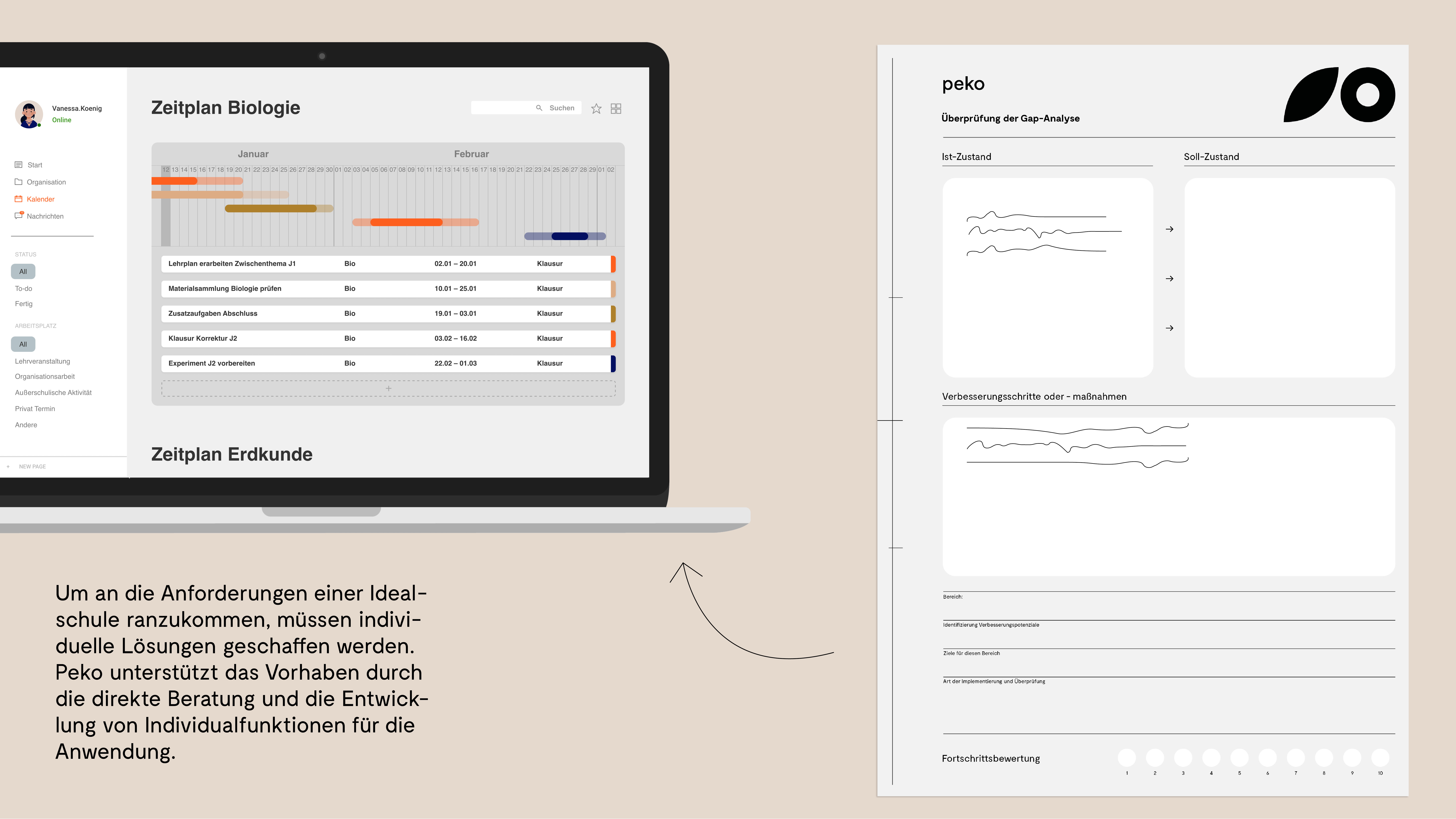 Mit Peko schließt sich die Lücke zwischen dem hohen gesellschaftlichen Druck zur Generalüberholung des Schulsystems und dem defizitären individuellen Stand der Einzelschule, die ihre Weiterentwicklung nicht allein zustande bringen kann. Peko ebnet den Weg zu individuell zugeschnittenen und dadurch nachhaltig zu etablierenden Schulkonzepten. Gemeinsam gestalten wir die Zukunft unserer Schulen von morgen.