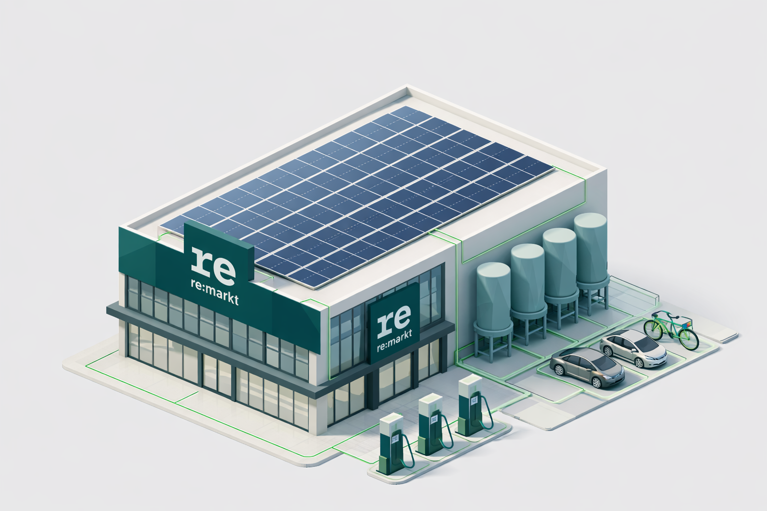 Der Markt selbst ist als energieautarkes System konzipiert. Photovoltaik, Energiespeicher und intelligentes Lastmanagement sichern Kühlung, Beleuchtung, Kassensysteme und Kommunikation auch bei Stromausfällen. Der modulare Aufbau ermöglicht zudem eine flexible Umnutzung: Verkaufsflächen werden zu Lagerzonen, Servicebereiche zu Ausgabestellen.