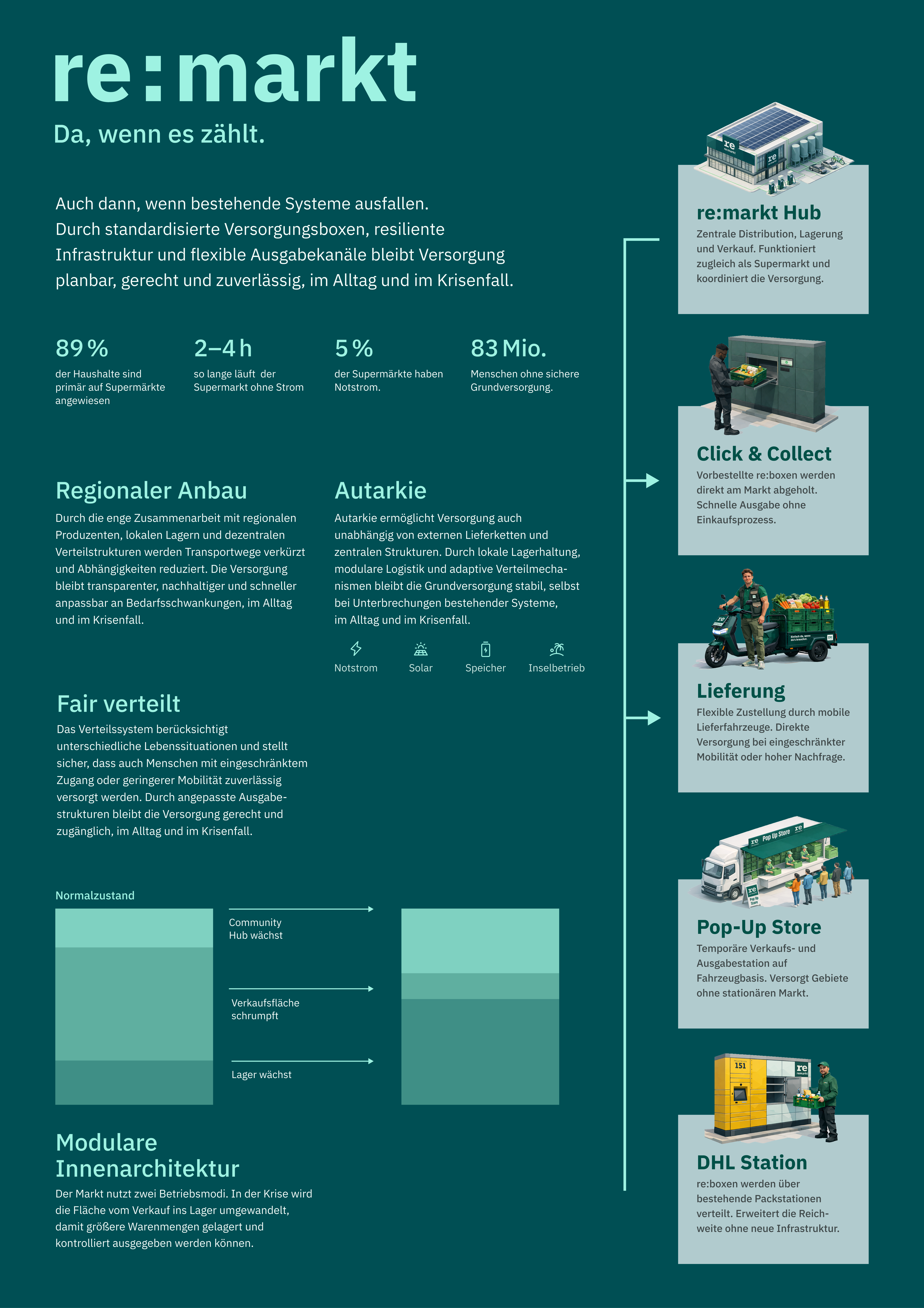 re:markt hinterfragt diese Logik grundlegend. Das Projekt versteht den Supermarkt als Teil kritischer Infrastruktur und entwickelt ein Versorgungssystem, das im Alltag effizient funktioniert und im Ausnahmezustand stabil bleibt.