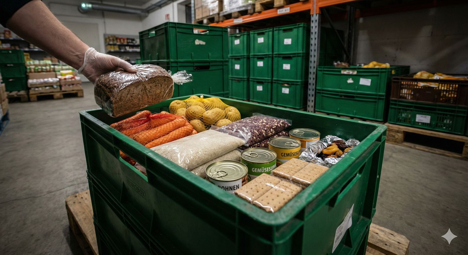 Im Zentrum steht ein durchgängiges, standardisiertes Boxensystem. Es begleitet Lebensmittel entlang der gesamten Versorgungskette – vom landwirtschaftlichen Betrieb über Logistik, Lager und Verkaufsfläche bis zur strukturierten Ausgabe. So entstehen Transparenz, Skalierbarkeit und klare Verteilmechanismen, die sowohl im Normalbetrieb als auch im Krisenmodus anwendbar sind.