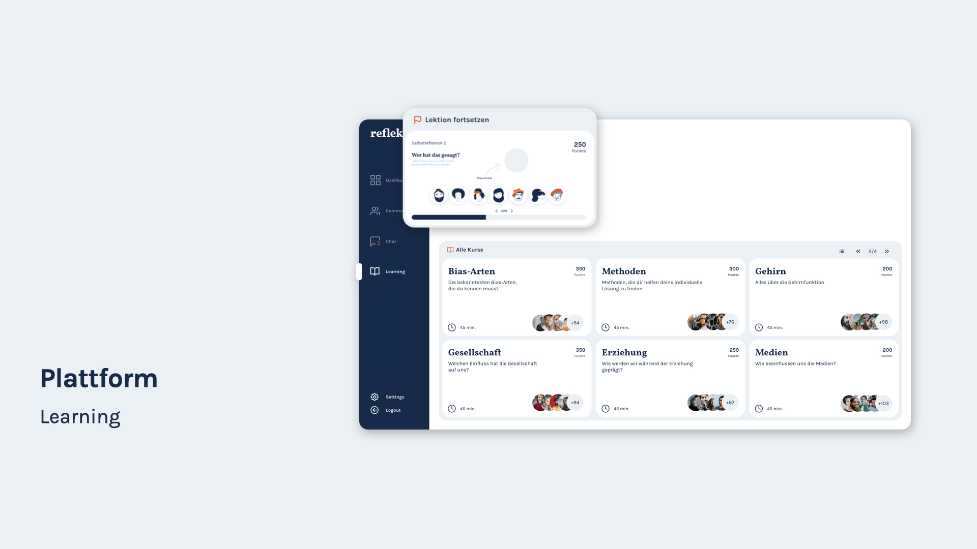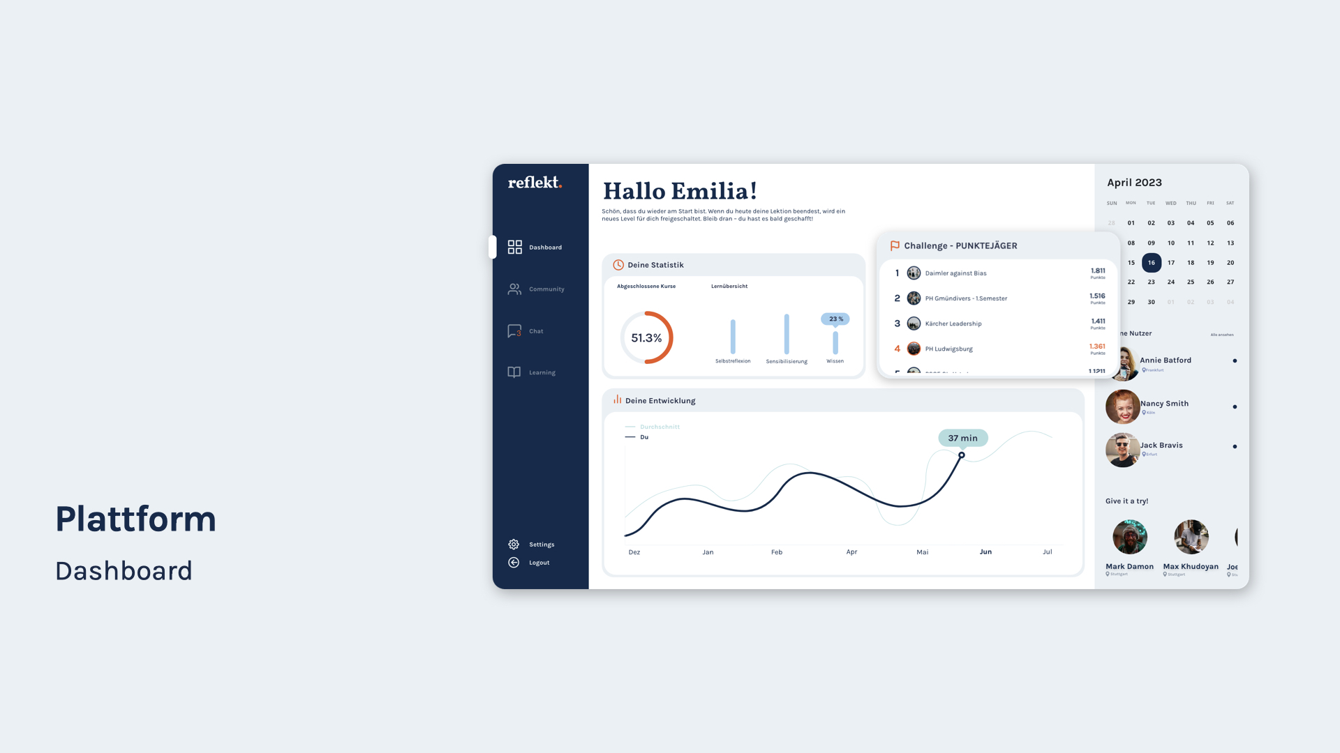Auf der Lernplattform können die Nutzer:innen eine eigene Community aufbauen, chatten, Wissen erweitern sowie ihre Fähigkeiten trainieren. Das Dashboard gibt einen Überblick über die eigene Lernaktivität und Fortschritte. Durch die Challenges mit anderen Nutzer:innen wird die Lernmotivation gesteigert. Wichtige Neuigkeiten werden als Notification auf dem Smartphone angezeigt.