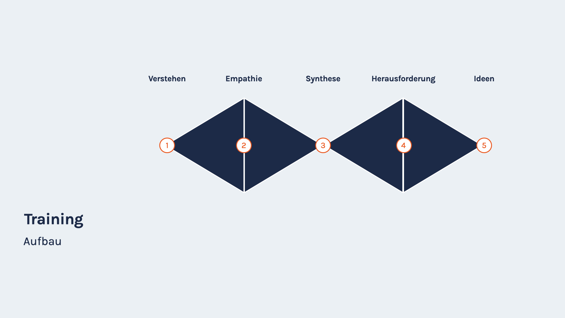 Das Training wurde nach dem Double Diamond Prinzip aufgebaut. Während des gesamten Trainingsprogramms werden Methoden des Design Thinkings eingesetzt. Dies gewährleistet die selbstständige Wissensvertiefung sowie die eigene Problemanalyse. Die Teilnehmenden sollen bei der Entwicklung von individuellen und persönlichen Lösungsansätzen unterstützt werden. Dadurch steigt der persönliche Mehrwert und die langfristige Wirkung wird verbessert.