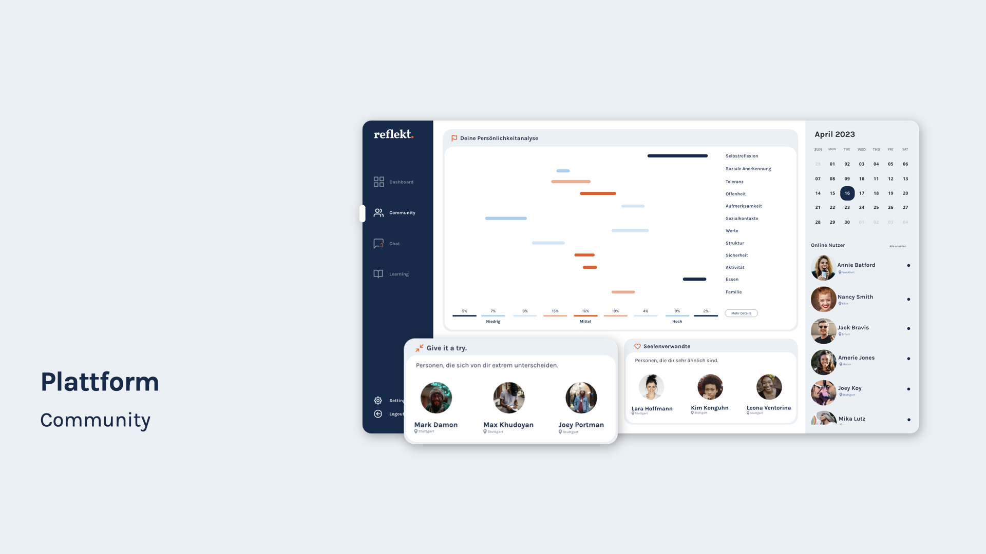 Die Nutzer:innen haben die Möglichkeit im Community-Bereich eine Persönlichkeitsanalyse durchzuführen. Darauf basierend bekommen die Nutzer:innen passende Personenvorschläge. Dies können einerseits fremde Nutzer:innen mit sehr ähnlichen Eigenschaften und Werten sein. Andererseits werden auch gegensätzliche Charaktere und Persönlichkeiten vorgeschlagen. Dadurch sollen die Personen in einen inspirierenden Austausch mit anderen Nutzer:innen treten und ihren eigenen Blickwinkel erweitern.