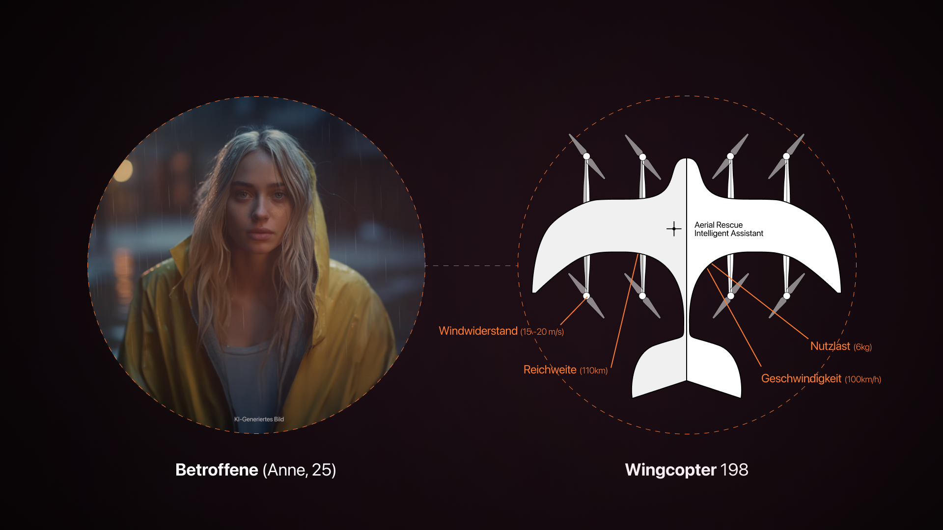 Anne befindet sich auf einem von steigendem Wasser umgebenen Garagendach. Eine DJI-Drohne identifiziert sie und erfasst ihre Lage. Aufgrund der akuten Gefährdung wird eine schnelle Lösung gesucht. Die Drohne schlägt eine Rettungsinsel vor, die für Anne die beste Option darstellt. ARIA gibt den Auftrag über die Software an eine Wingcopter-Drohne mit dem Hilfsgut "Rettungsinsel" weiter und informiert Anne gleichzeitig darüber, dass Hilfe unterwegs ist. Sobald die Rettungsinsel für Anne bereitgestellt ist, endet die Mission der DJI-Drohne.