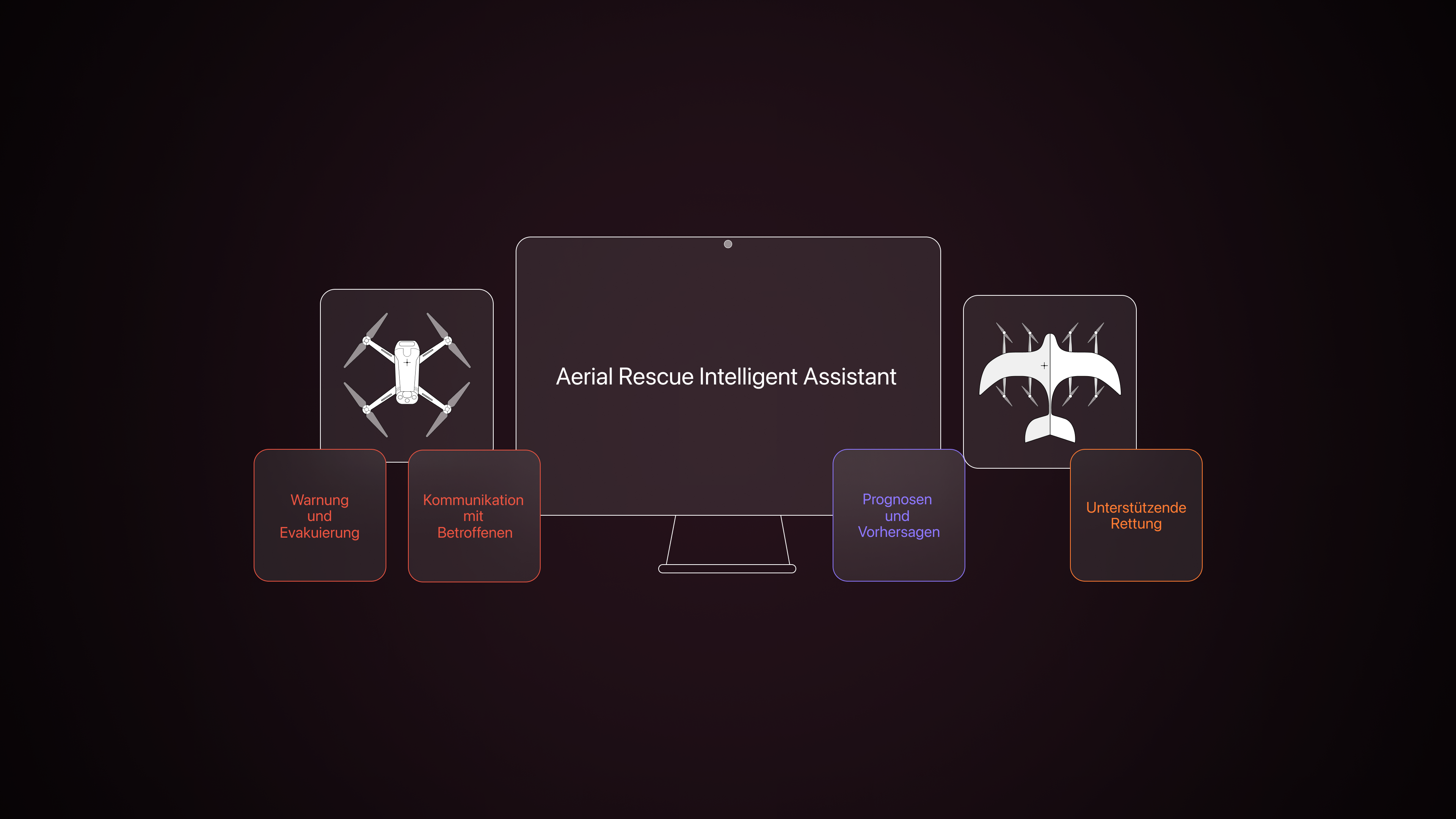 ARIA (Aerial Rescue Intelligent Assistant) ist ein strategisches Projekt, das bei zukünftigen Flutkatastrophen eine effektive Entscheidungs- und Kommunikationsebene schafft, indem künstliche Intelligenz gezielt eingesetzt wird. Durch den Einsatz von autonomen Drohnenflügen und zuverlässigen Prognosen können Evakuierungsmaßnahmen frühzeitig eingeleitet werden. ARIA-Drohnen können während des Hochwassers Betroffene im Gefahrengebiet identifizieren und mittels Handsignalen und Sprache ihre Situation schildern. Aufgrund dieser Informationen können Priorisierungen vorgenommen, Evakuierungswege aufgezeigt werden sowie Hilfsgüter-Lieferungen oder der Herbeiruf von Einsatzkräften gezielt erfolgen.