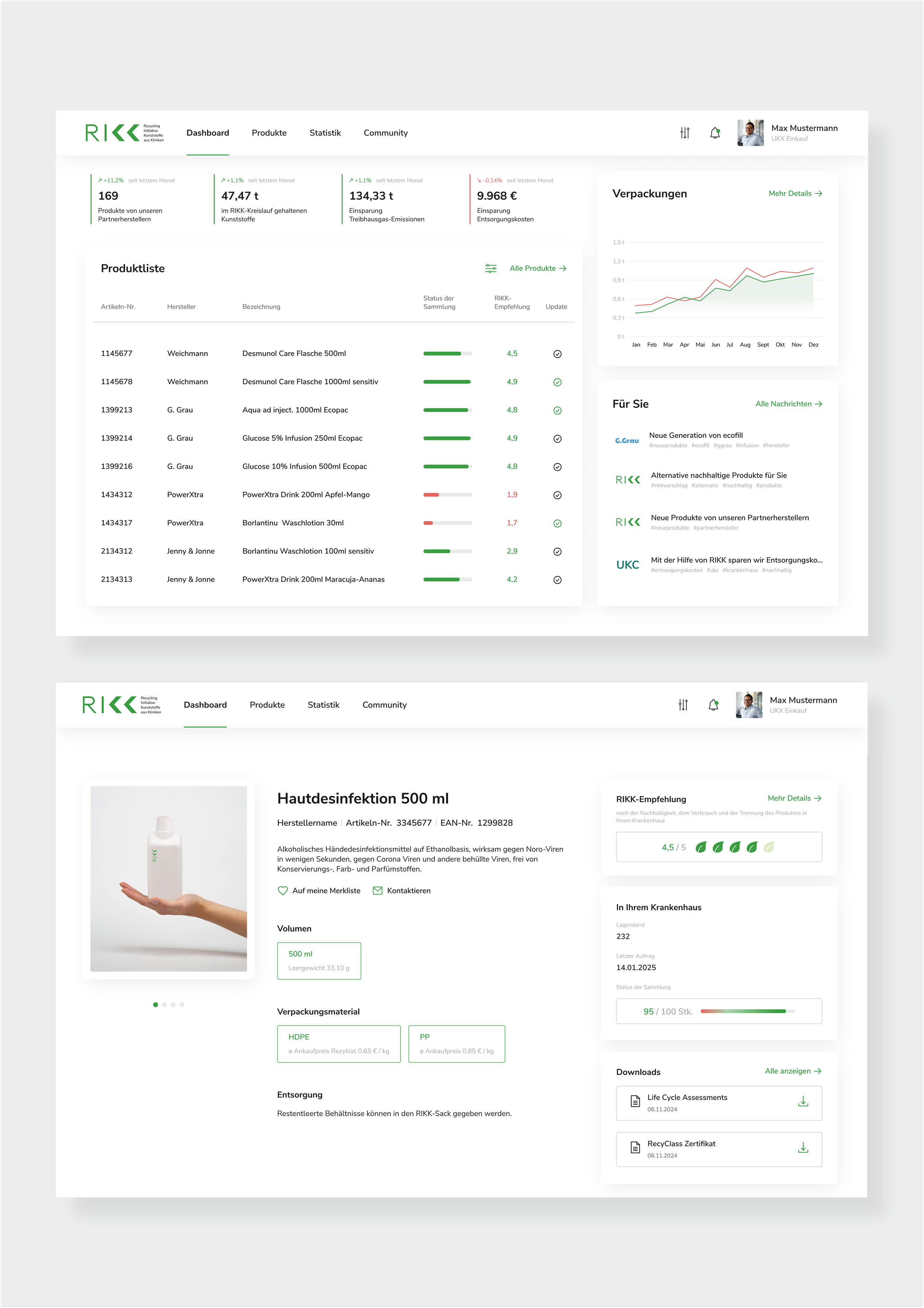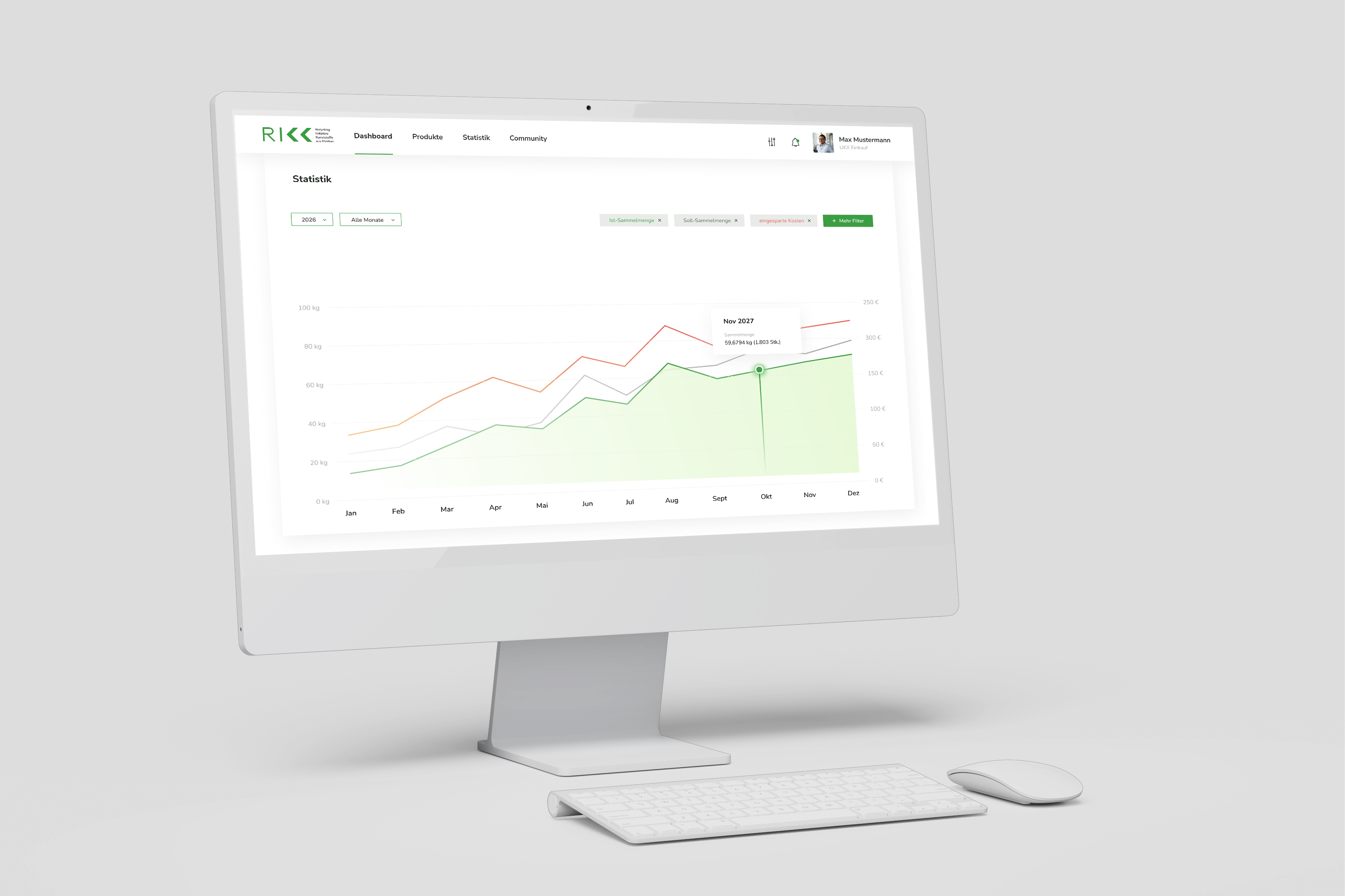 Auf den individuellen Dashboards der Teilnehmenden werden ihnen die für sie relevanten Systeminformationen angezeigt. Alle Akteur:innen profitieren von der RIKK-Plattform, welche Übersicht über Abfallaufkommen, Materialien und Einsparungen im finanziellen und ökologischen Bereich bietet.