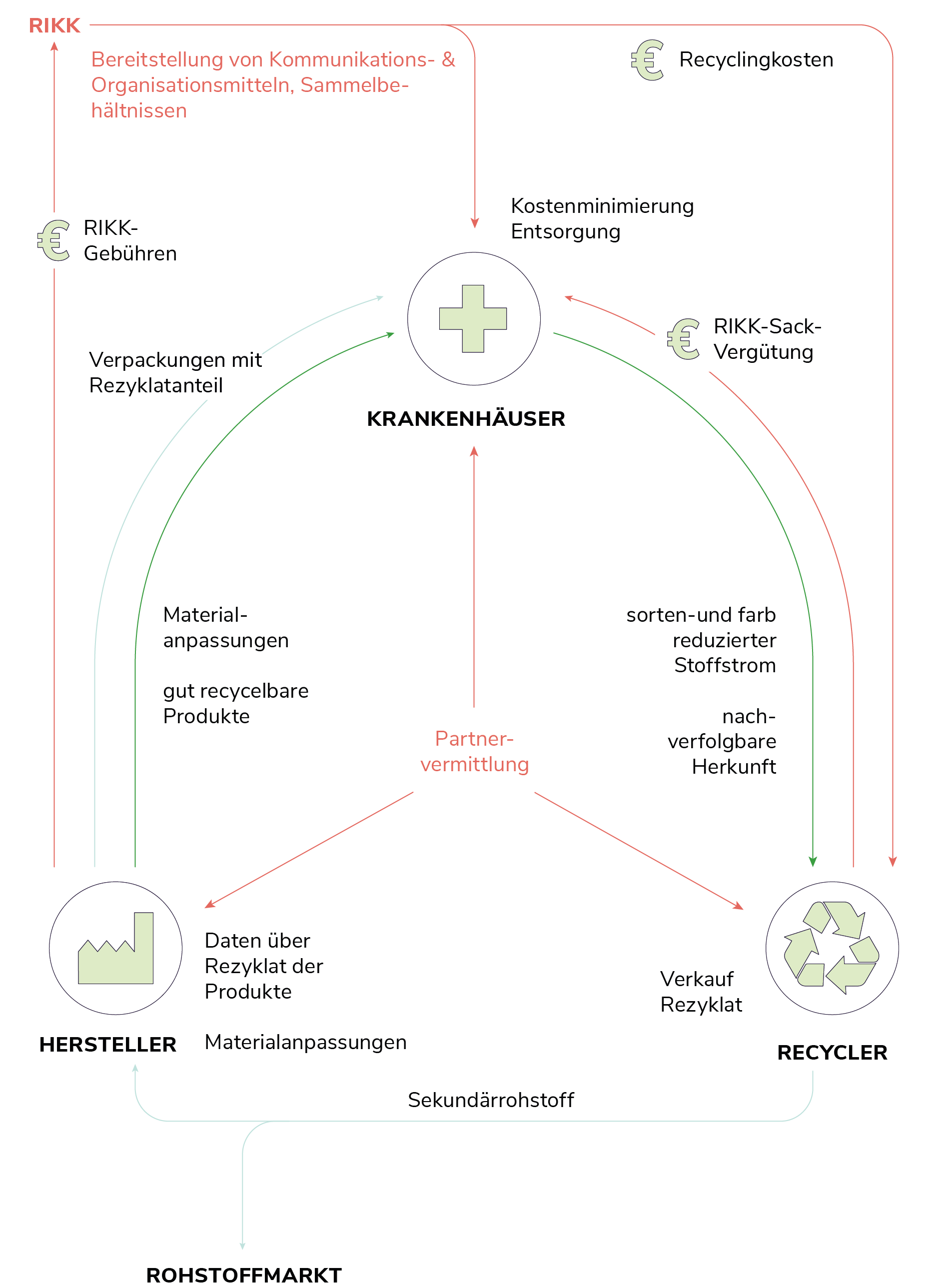 Hersteller sparen durch die Zugabe ihrer Produkte in das RIKK-System Lizensierungsgebühren. Kliniken können dadurch die medizinischen Produkte günstiger einkaufen und sparen Entsorgungskosten, da ein Systemrecycler die Produkte abholt, recycelt und weiterverkauft.