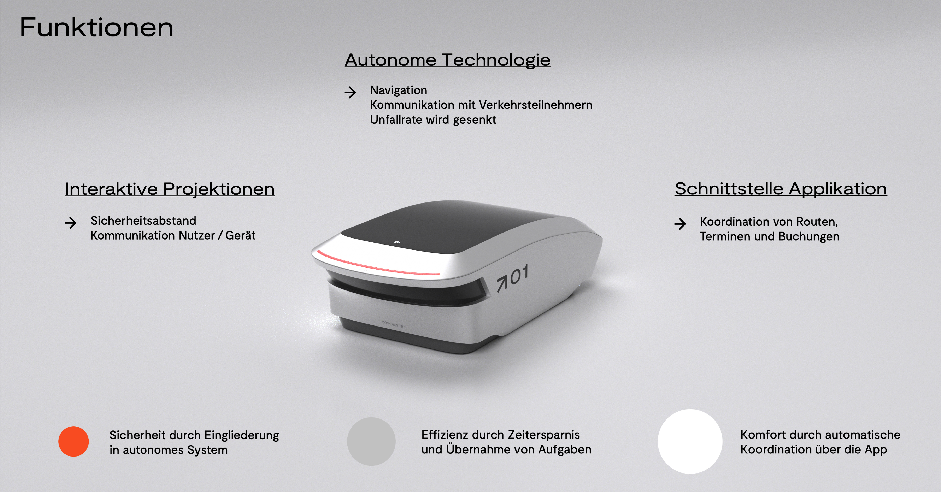 In order to increase the security of pedestrians, to make walking more efficient and to provide comfort to motivate people to walk, the prototype romo–01 was developed. Its function is to integrate humans into autonomous traffic. In this manner it closes the safety gap between autonomous vehicles and pedestrians. As a physical product romo–01 takes over the communication with other autonomous vehicles, minimizes the safety risk of the user and thereby prevents accidents. At the same time, in addition to communication, it also handles navigation through road traffic. This increases the efficiency of the entire system. For humans, this means that time spent walking can be used wisely for other things. The simple coordination provided by the application that comes with romo–01 also brings the necessary convenience.