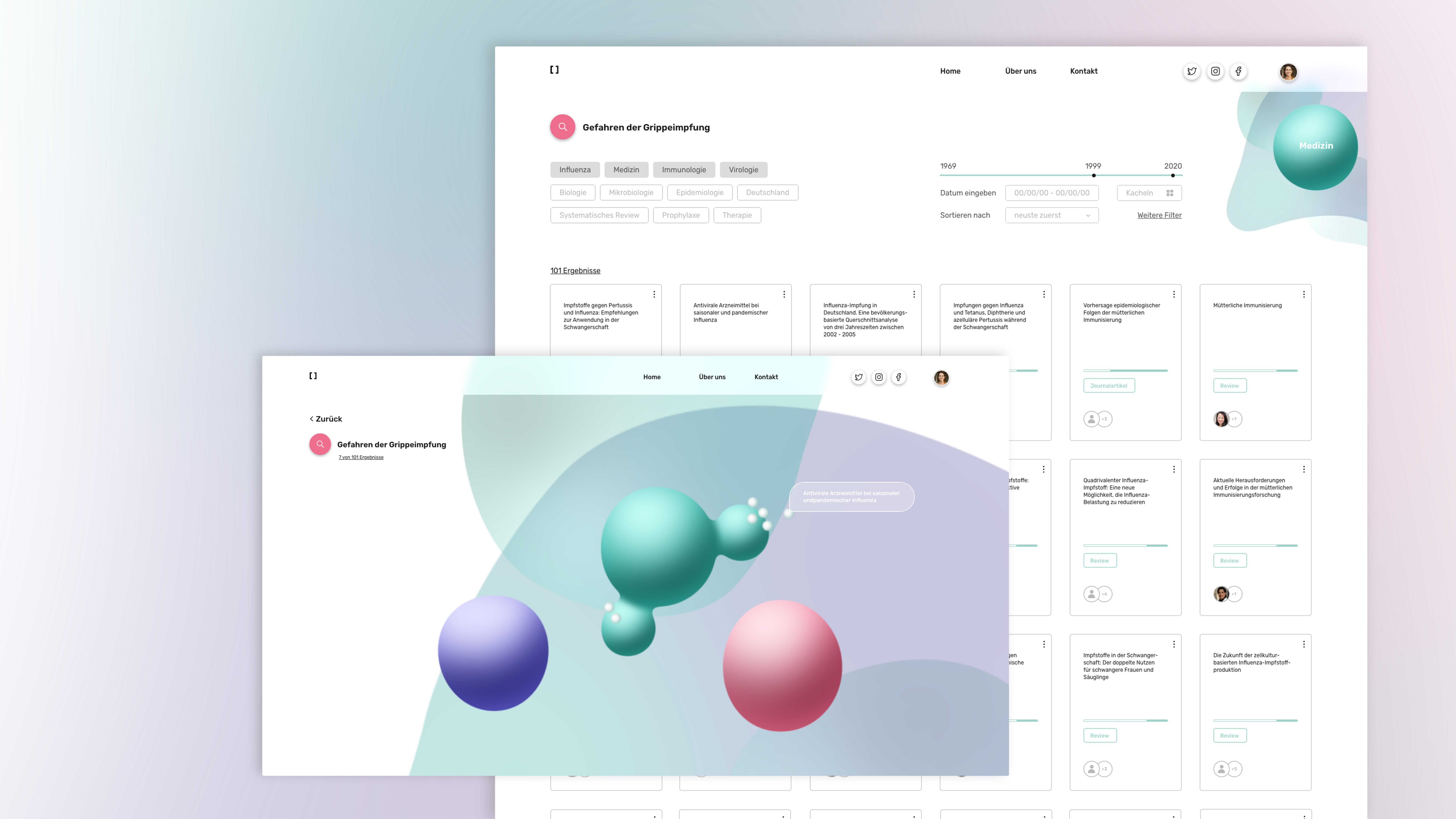 Die alternative Suche ist eine Abwechslung zur klassischen Listendarstellung. Sie soll lebendiger wirken und eine Abwechslung zur klassischen Listendarstellung sein. In dieser Ansicht wird eine Verortung der Publikation in der Welt der Wissenschaft ermöglicht. Sie zeigt durch Verbindungen an, welche Wissenschaftsbereiche die entsprechende Publikation beinhaltet. Darüber hinaus ist es möglich auf überschneidende Themenbereiche zu wechseln und durch den gespeicherten Verlauf, den Weg zur ersten Studie wieder verfolgen zu können.