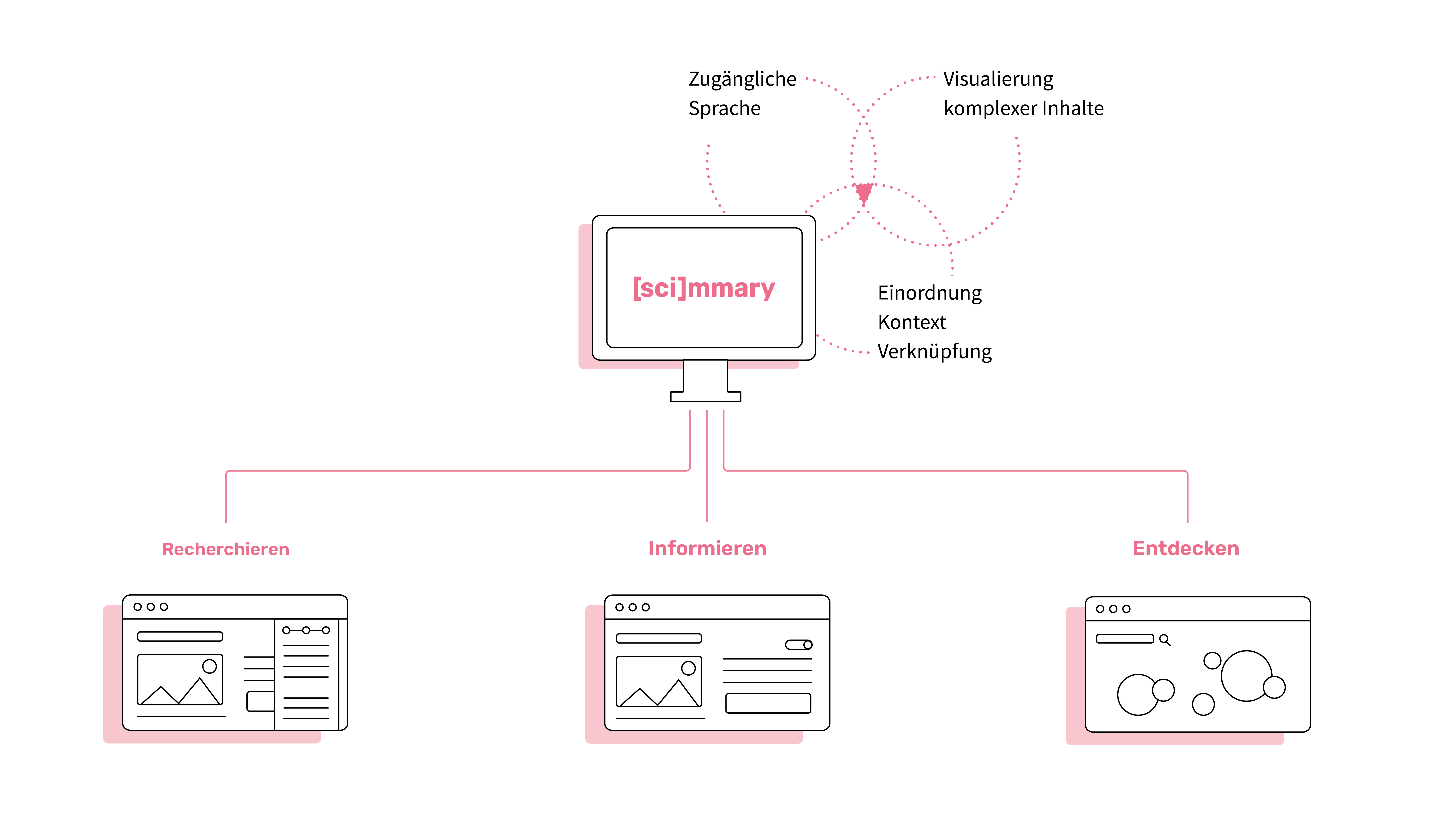 Mit [sci]mmary wird ein Gestaltungskonzept präsentiert, das anhand einer digitalen Plattform aktuelle Forschungsfragen und -ergebnisse für Menschen ohne wissenschaftlichen Hintergrund verfügbar macht. Durch den Einsatz einer künstlichen Intelligenz werden komplexe wissenschaftliche Inhalte dem jeweiligen Wissensstand des Nutzers entsprechend angepasst. Diese ermöglicht ebenfalls, lange Texte in knappe Kernaussagen zu verpacken und kontextgebende Bilder aus einzelnen Textpassagen zu generieren. Zusätzlich interaktiven Darstellungen der Wissenschaftswelt sollen zudem die menschliche Entdeckerlust ansprechen.
