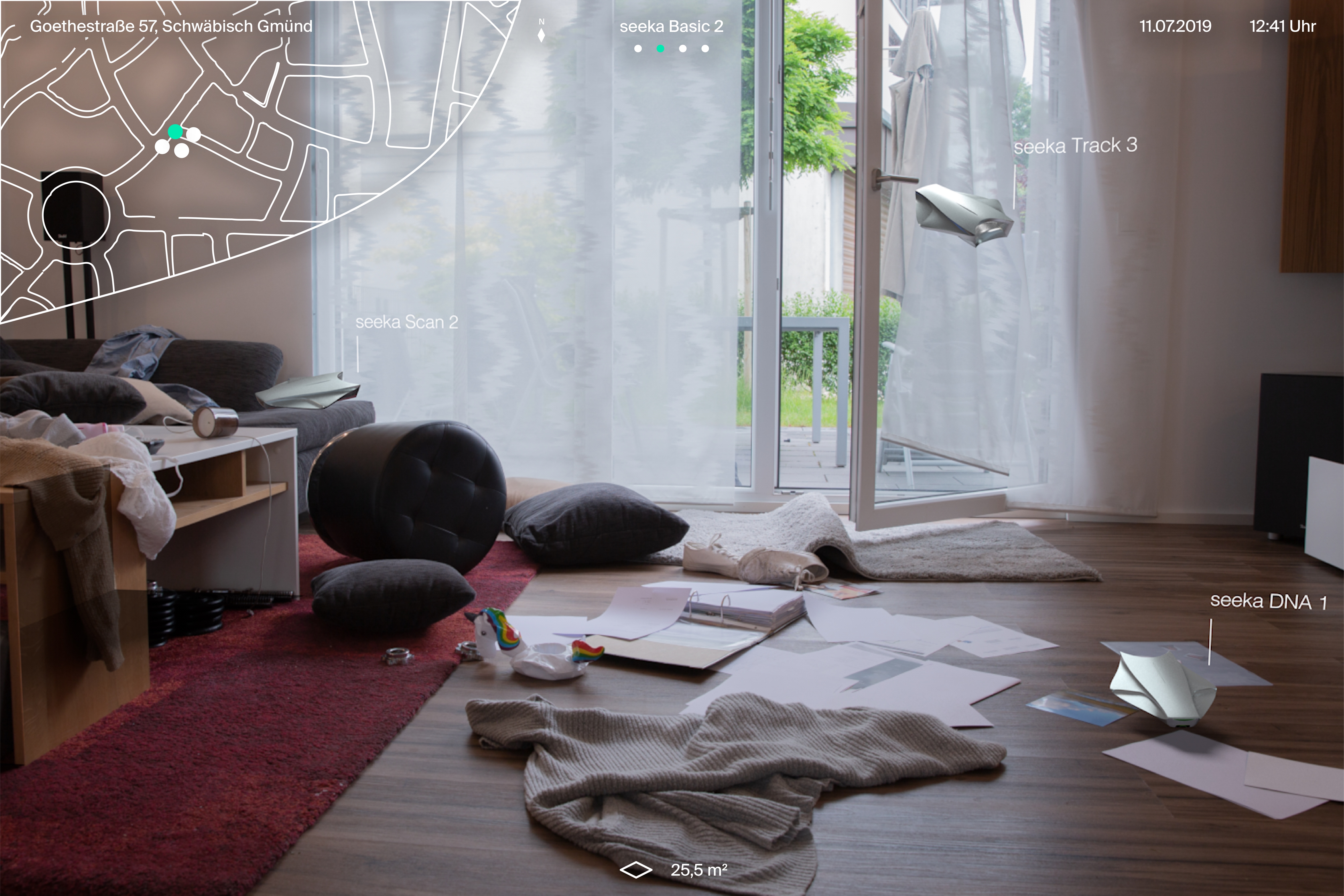 seeka sammelt Spuren und Hinweise und werten sie gemeinsam mit der durch Künstliche Intelligenz geleiteten Software seekaSync aus. Der Kriminalbeamte kann die seeka bei Bedarf mithilfe des seekaSense manuell steuern und sich durch die VR-Kontaktlinse seekaLense in die Immersion begeben: Ein Zustand, in dem er alle Eindrücke, die eine seeka vor Ort aufnimmt, übertragen bekommt. Der Kriminalbeamte wird so aus Gefahrensituationen herausgehalten, hat aber dennoch das Gefühl, als wäre er direkt am Tatort. Die Künstliche Intelligenz von seekaSync bietet ihm Rückhalt bei der Aufklärung des Falls. Dabei bleiben seine Intuition und Erfahrung aber trotzdem noch von größter Relevanz und unschätzbarem Wert.