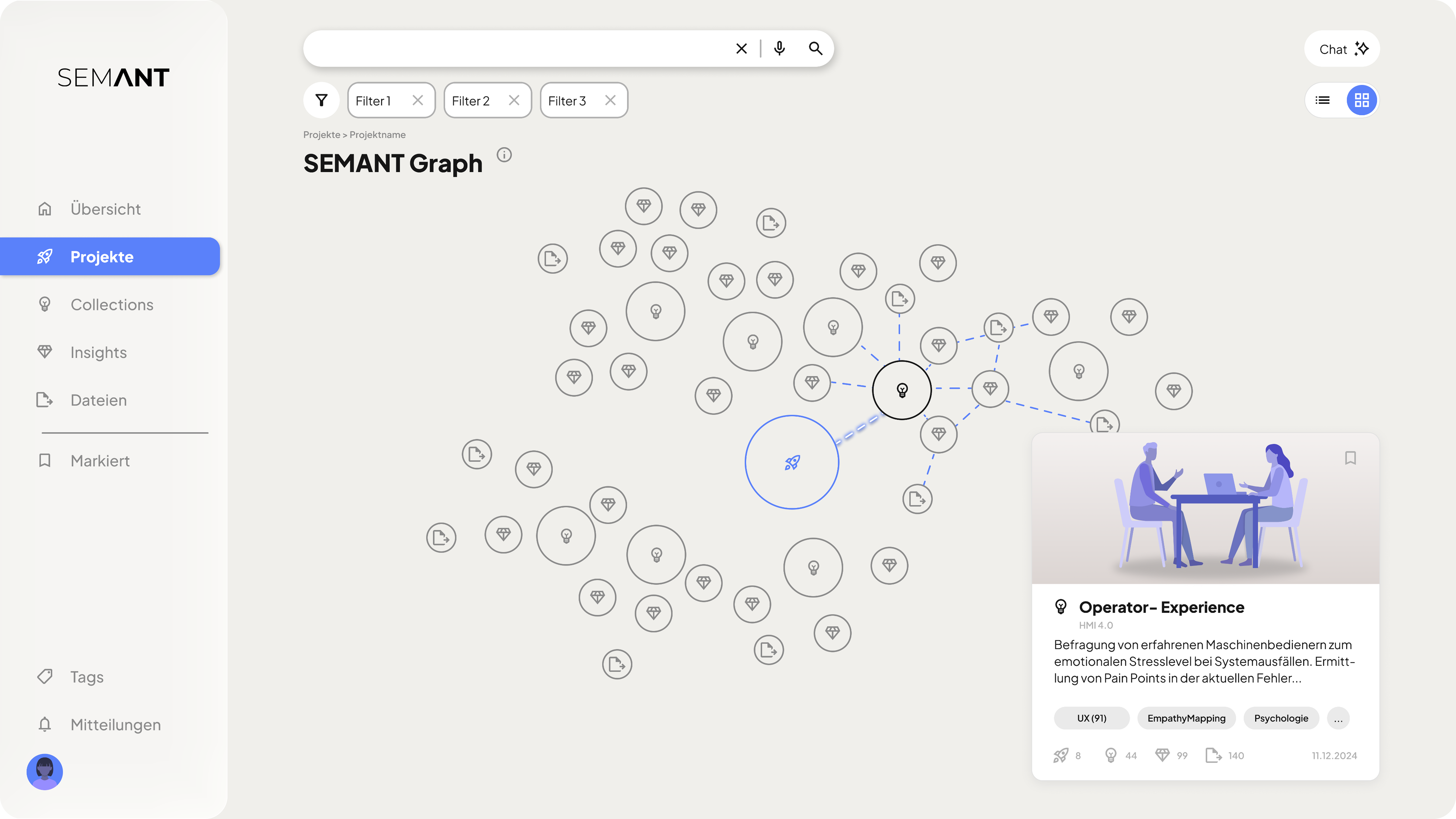 SEMANT transformiert isolierte Daten in vernetzte Erkenntnisse. Das Ziel der Plattform ist die Etablierung einer Single Source of Truth, die UX-Wissen nicht nur archiviert, sondern dessen komplexe Zusammenhänge kontextualisiert und sichtbar macht.