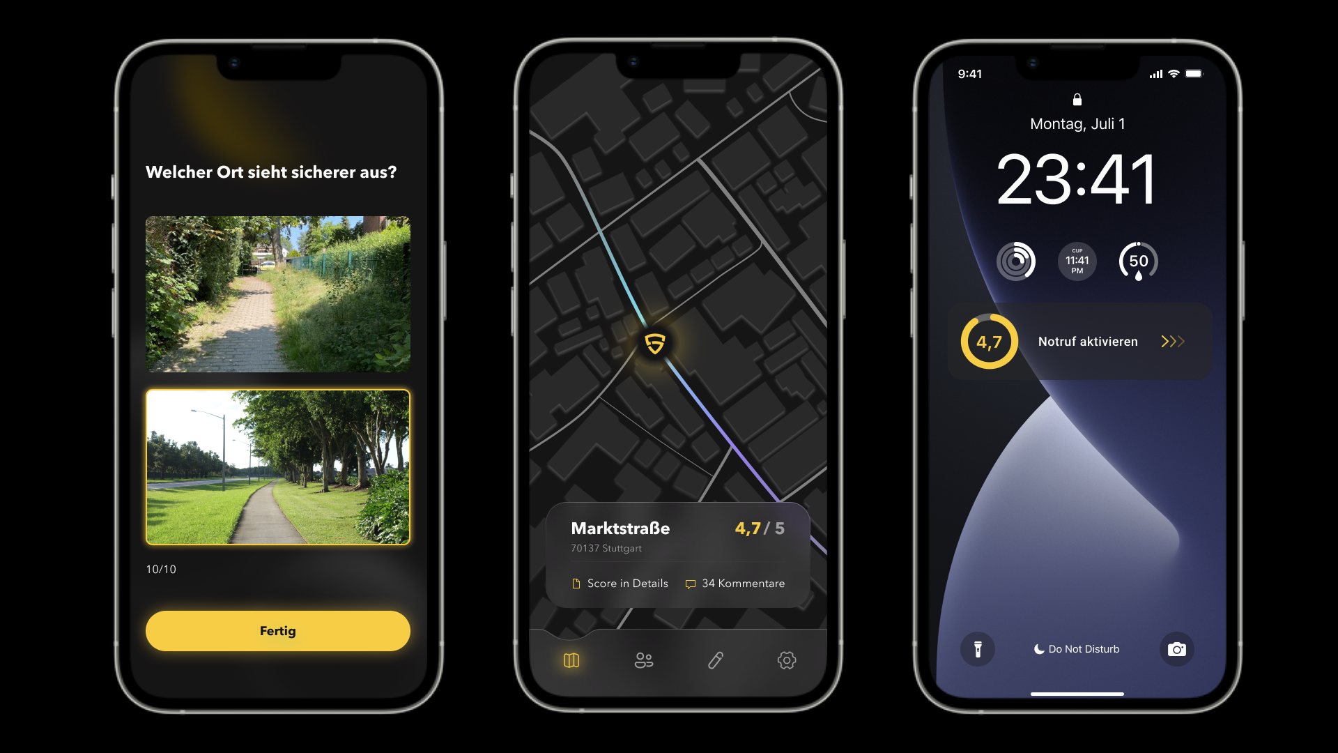 Wir ermitteln das individuelle Sicherheitsgefühl unserer Nutzer:innen, um ihnen für ihr subjektives Empfinden den sichersten Weg anzeigen zu lassen. Dazu stufen sie das persönliche Sicherheitsempfinden passierter Straßen ein und machen damit für andere Nutzer:innen sichtbar, an welchen Stellen potenzielle Gefahren lauern.
