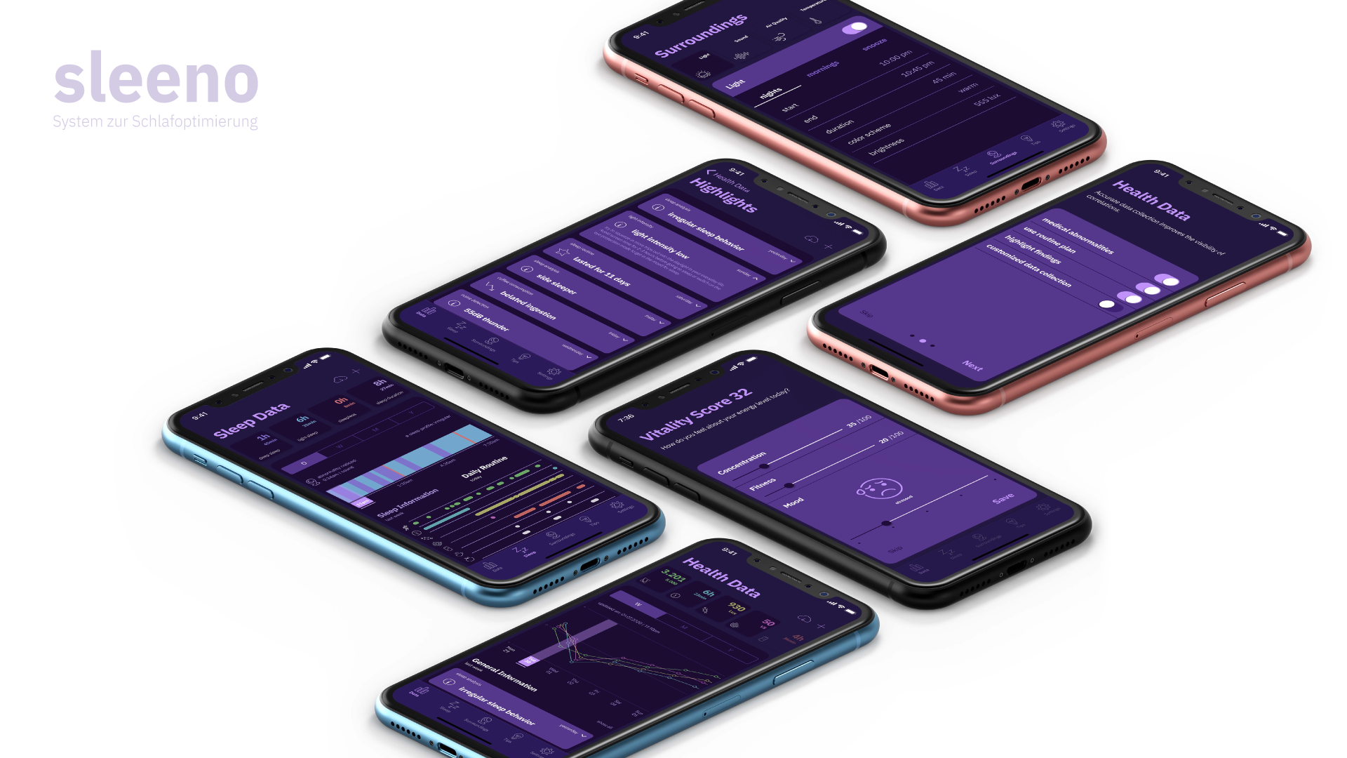 "sleeno" stands for "sleep innovation" and takes care of the sleep quality and performance of people with difficulties in falling asleep. It does not offer a medical solution to treat chronic sleep disorders, but rather aims to recognize deviations in sleep behavior early on and help to change them into positive sleep experiences. With sleeno, you receive information and change instructions for your daily routine and can control linked room elements or adapt them to your individual sleeping behavior based on the data collected by the system components Sleeno App and Habit through Sleeno Sphere.