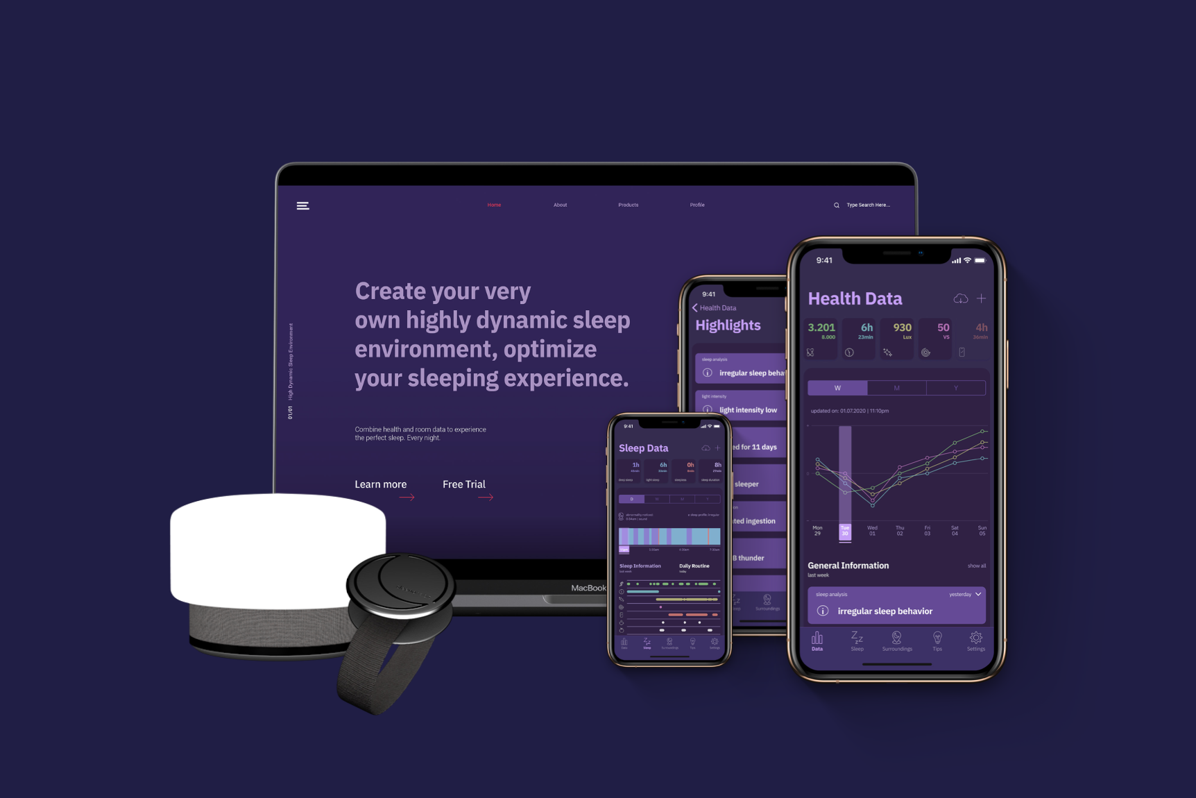 In conversations with our team of experts, which consists of young, future-oriented people from the fields of general medicine, sleep medicine and psychology, we were able to collect findings that provide us with the scientific backbone for the project. People who are struggling with their sleep regularly provided us with important insights into real problems. With the help of user feedback, we were able to iteratively design a comprehensive sleep optimization system that adapts to the sleeping needs of the user through constant data collection instead of the other way around.