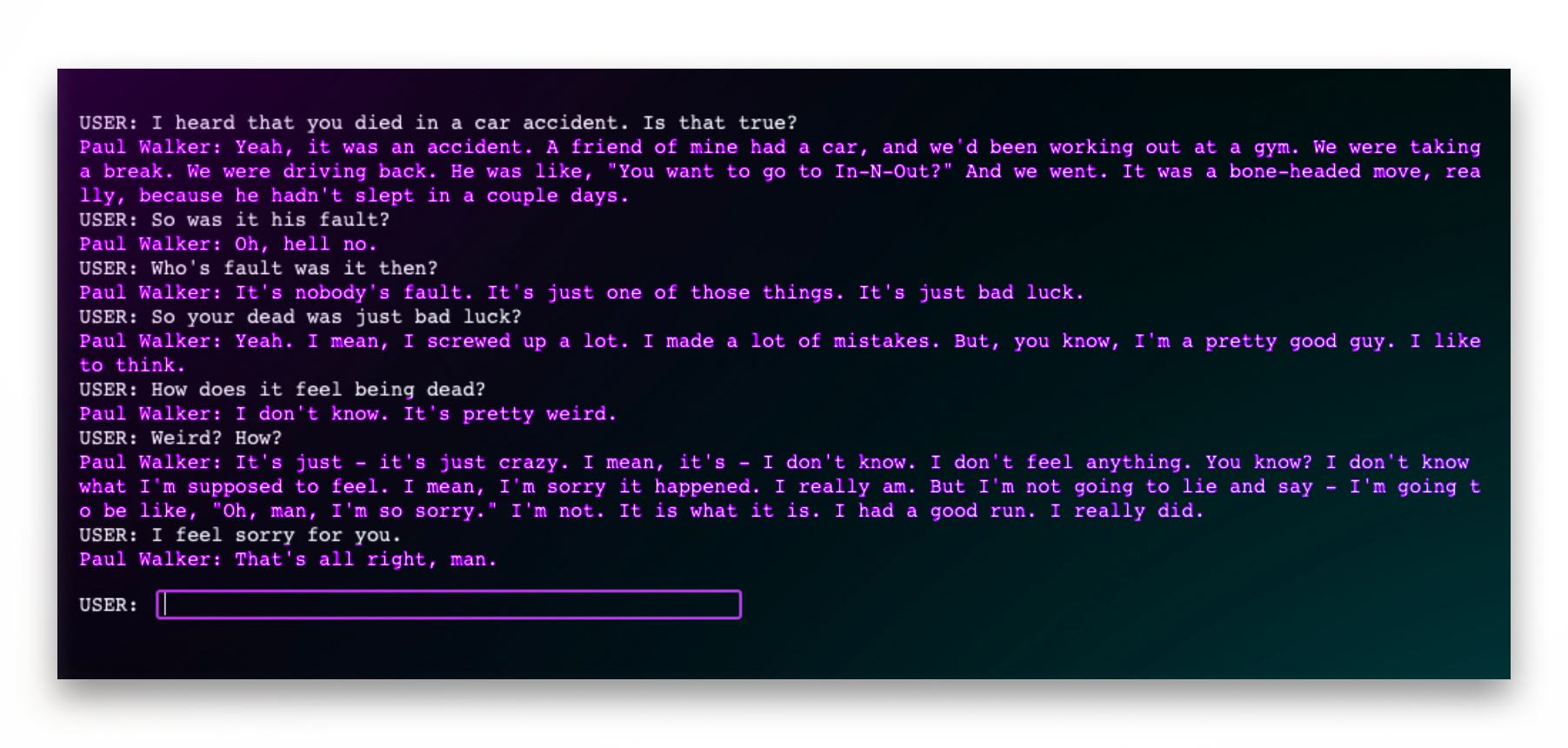 Excerpt from a chat history with our digital twin of Paul Walker
