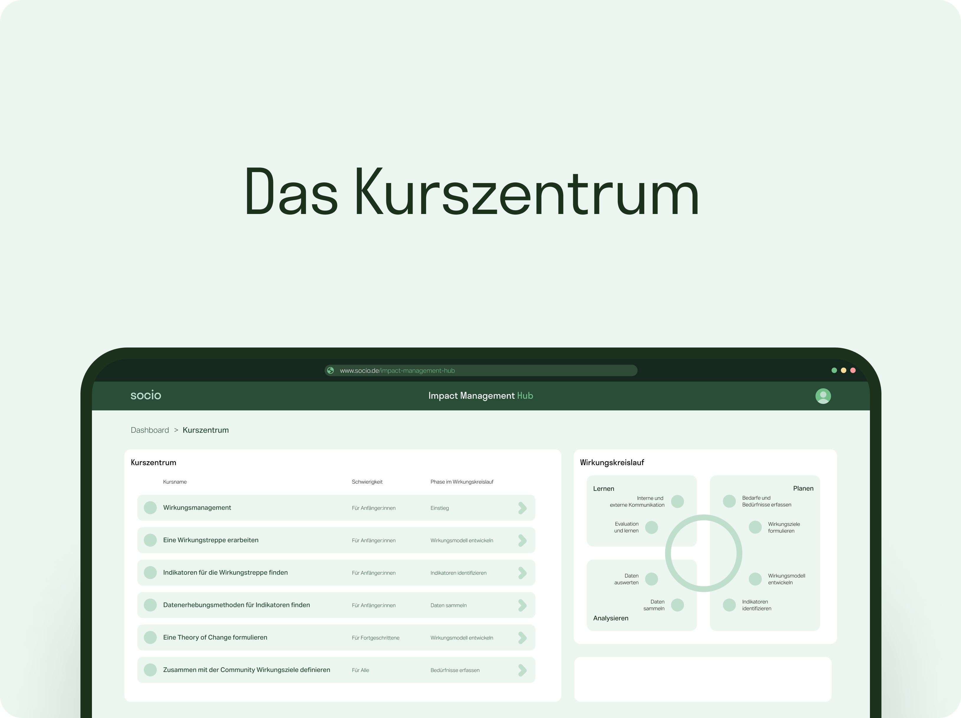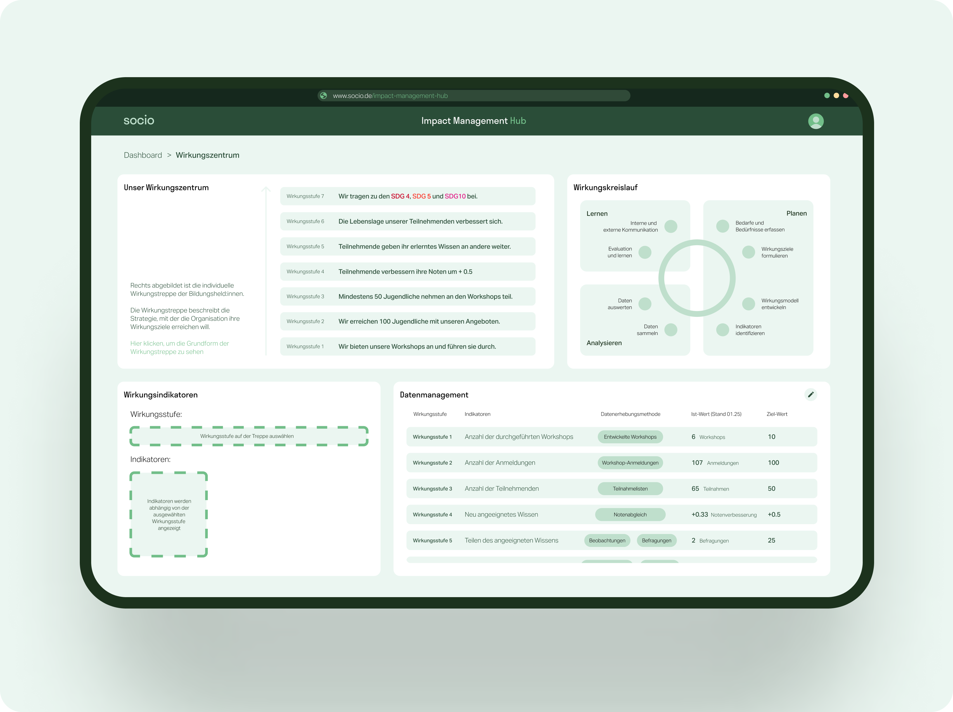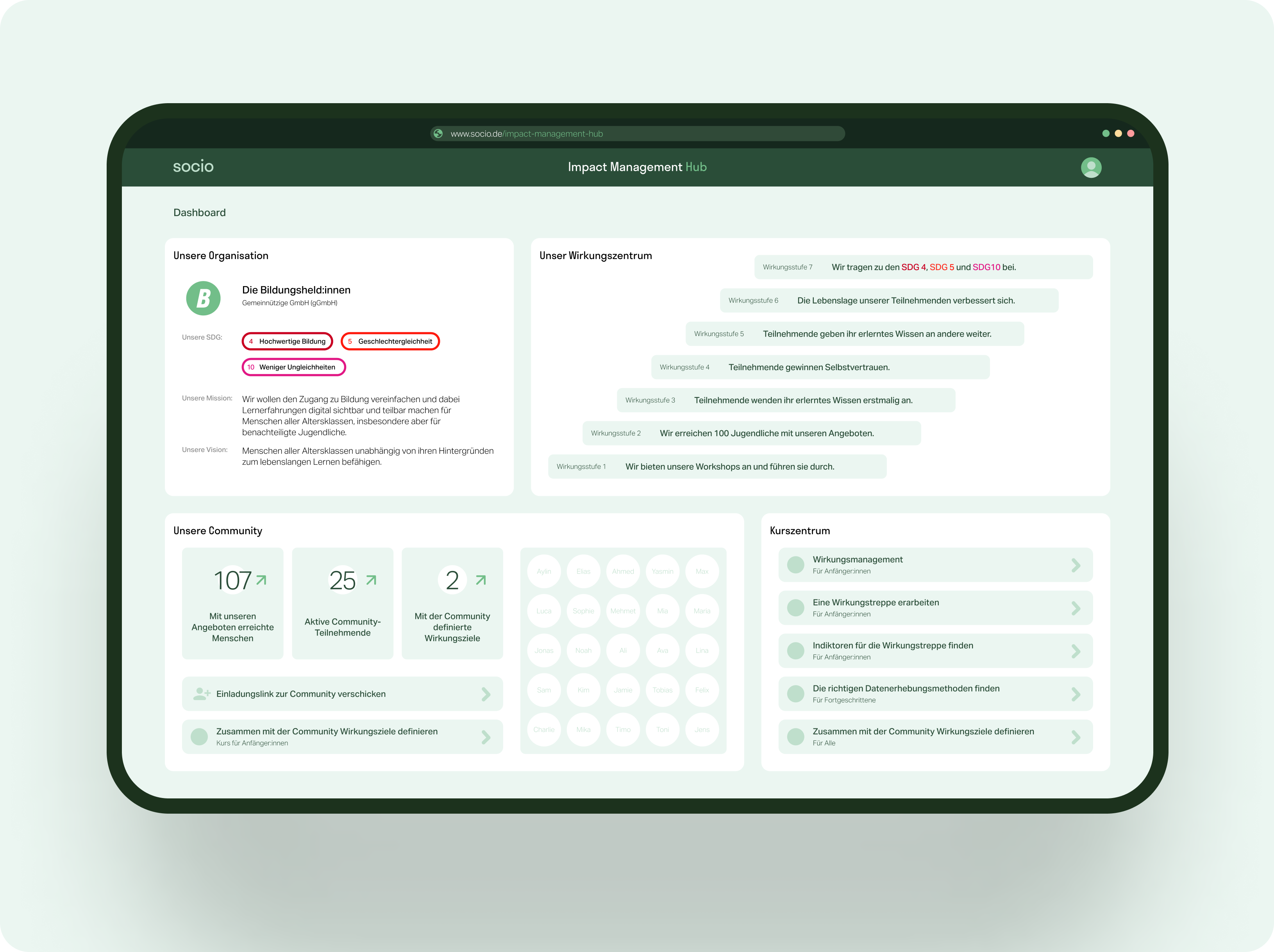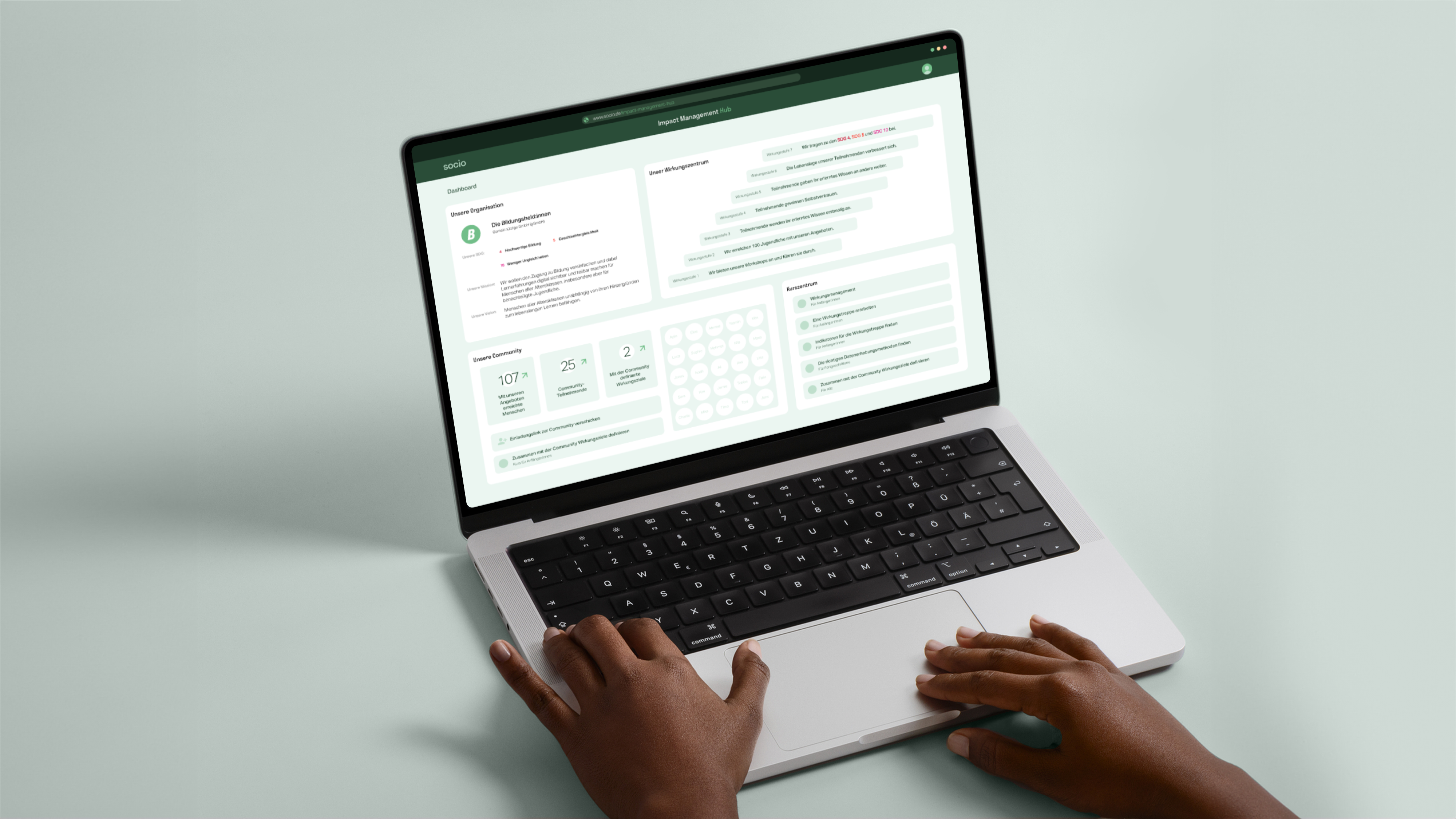 Das Impact Management Hub wird dabei als das Angebot eines fiktiven B2B Impact Startups – socio – kommuniziert, dessen Mission es ist, anderen Impact Startups zum Wirken zu verhelfen.
