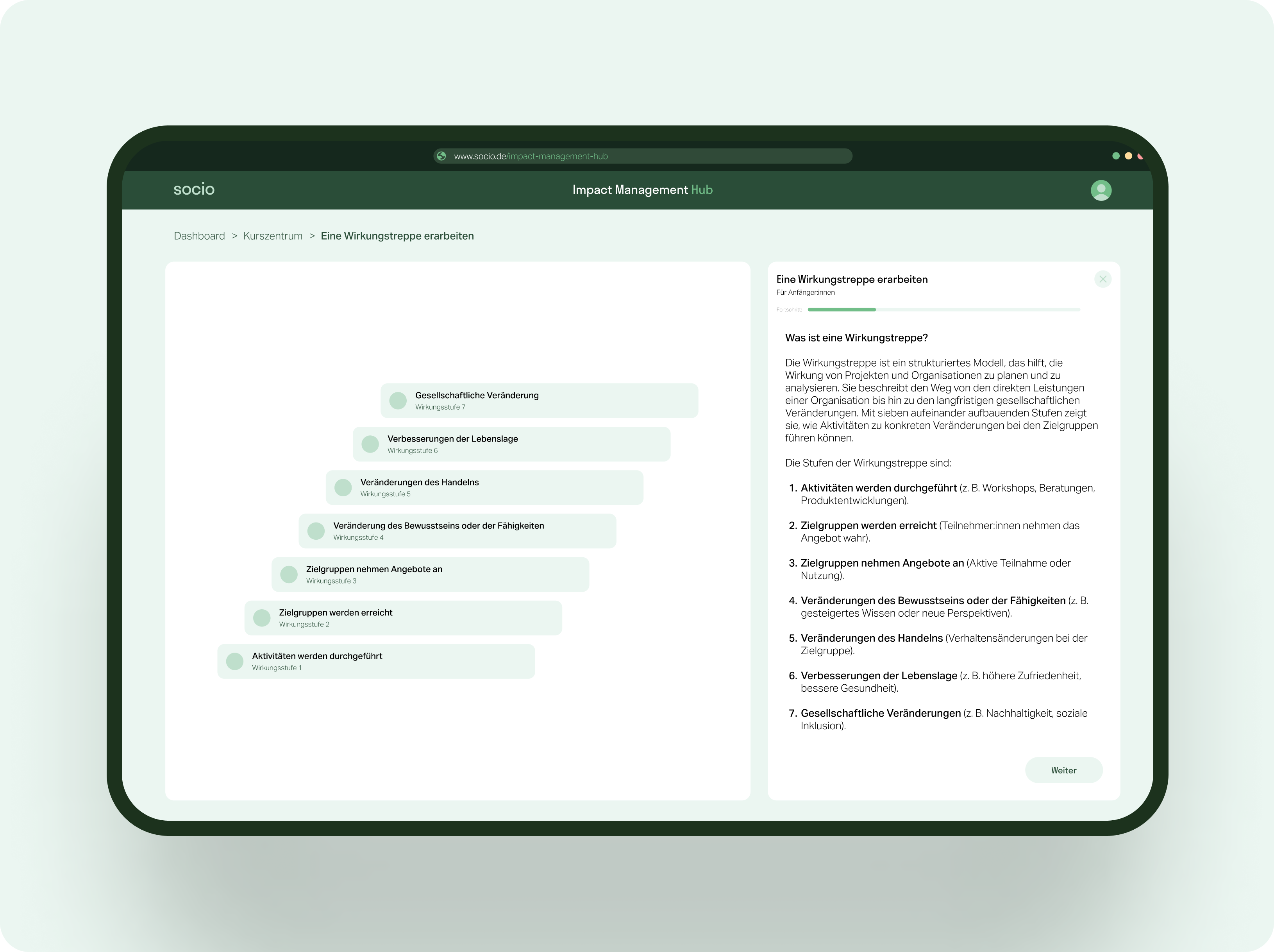 Das Impact Management Hub im Einsatz Das im Rahmen der Thesis "Soziale Innovation" erarbeitete Impact Management Hub: Ein digitales Werkzeug für wirkungsorientierte Organisationen und Startups, dass das partizipative Planen, analysieren, evaluieren und kommunizieren von Wirkung ermöglicht. Das Wirkungszentrum ist die zentrale Anlaufstelle des Impact Management Hubs, um die Planung, Analyse, Evaluation und Kommunikation von Wirkung durchzuführen. Das Kurszentrum zielt auf den Aufbau von Kompetenzen innerhalb der Startups selbst ab und ist als Open-Source-Lerncommunity angedacht, wo sowohl Expert:innen als auch Gründer:innen Wissen teilen können Ein Beispiel-Kurs: Die Wirkungstreppe. Die Wirkungstreppe beschreibt in sieben aufeinander aufbauenden Stufen, wie Aktivitäten einer Organisation langfristige gesellschaftliche Veränderungen bewirken können – von der Durchführung erster Maßnahmen bis hin zu tiefgreifenden sozialen und ökologischen Verbesserungen. Somit ist sie einer der wichtigsten strategischen Tools einer wirkungsorientierten Organisation