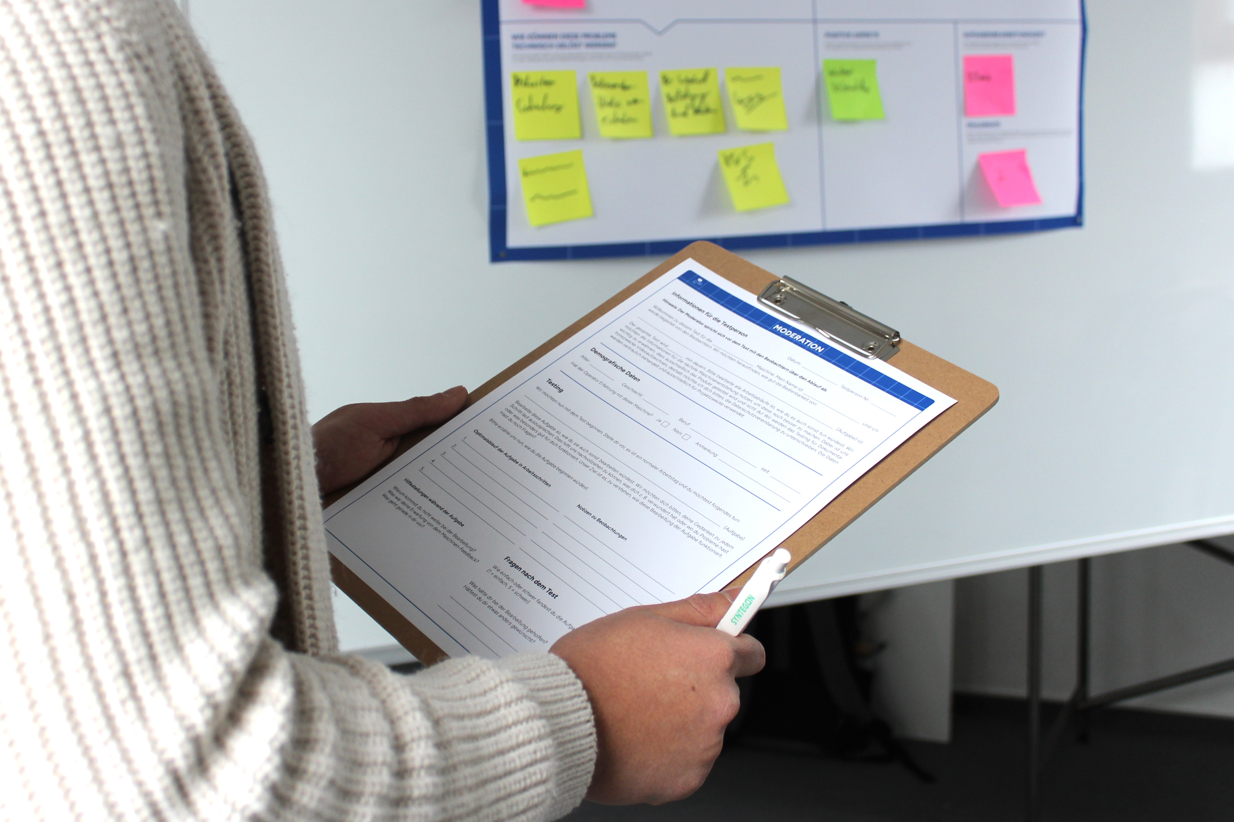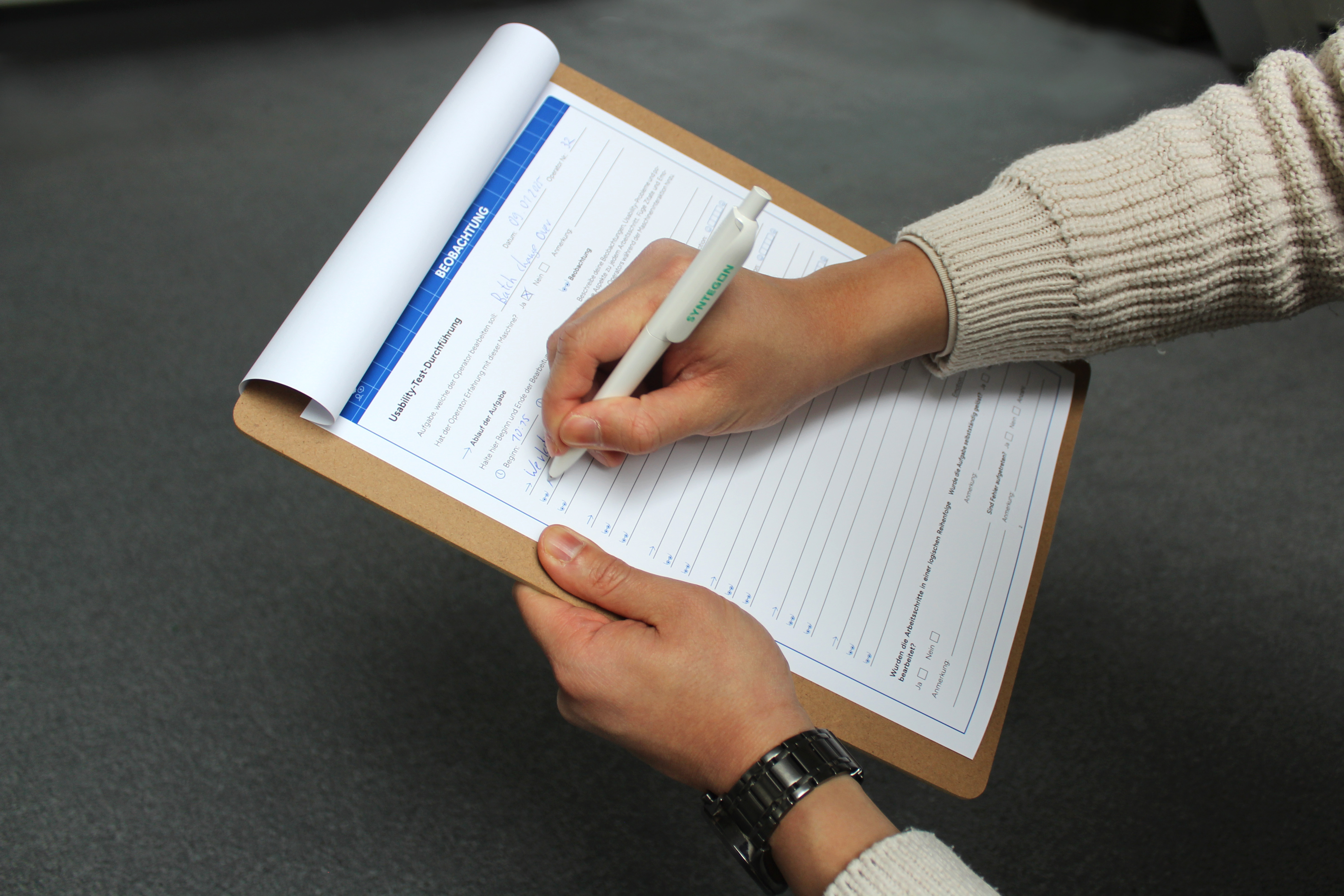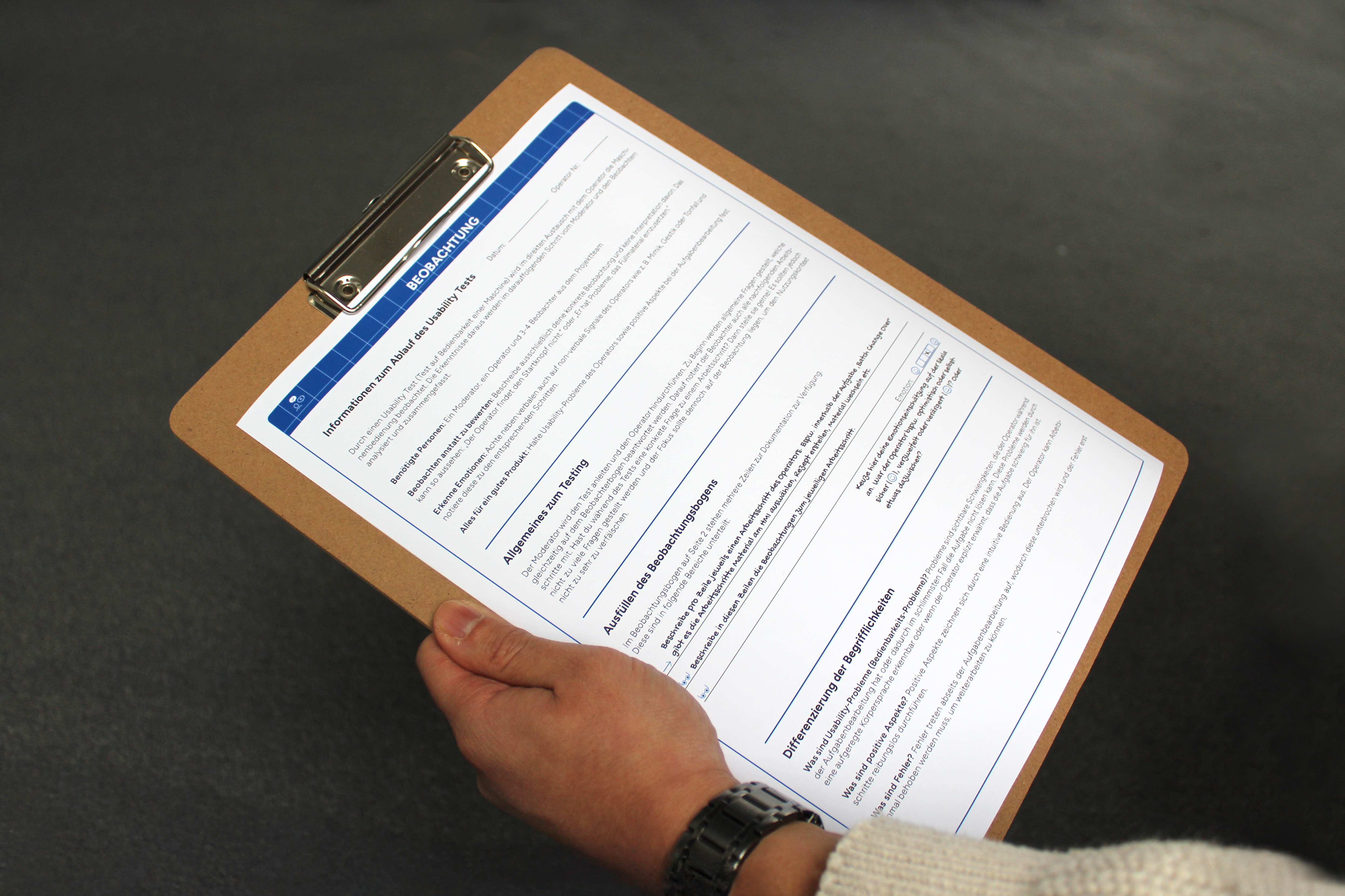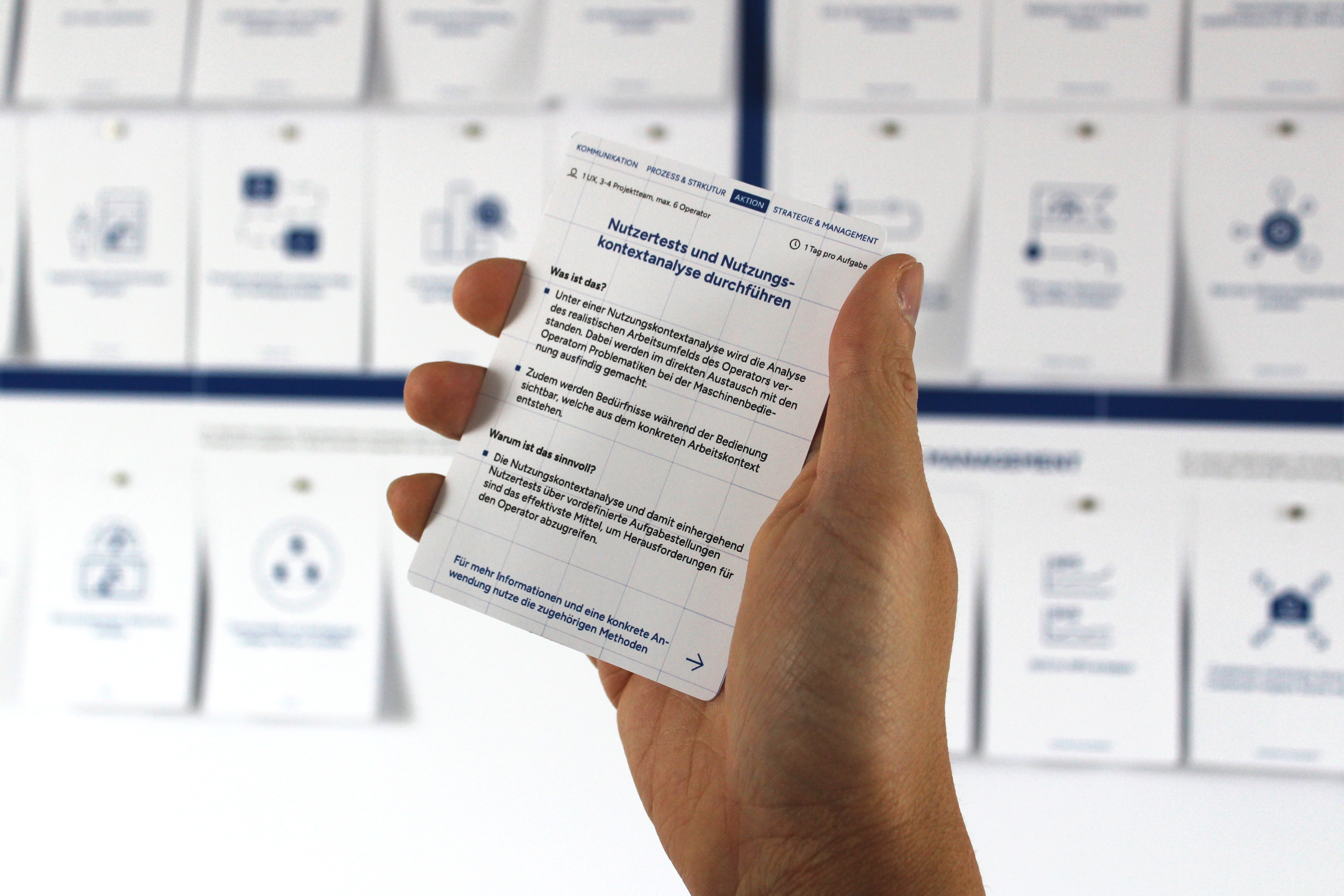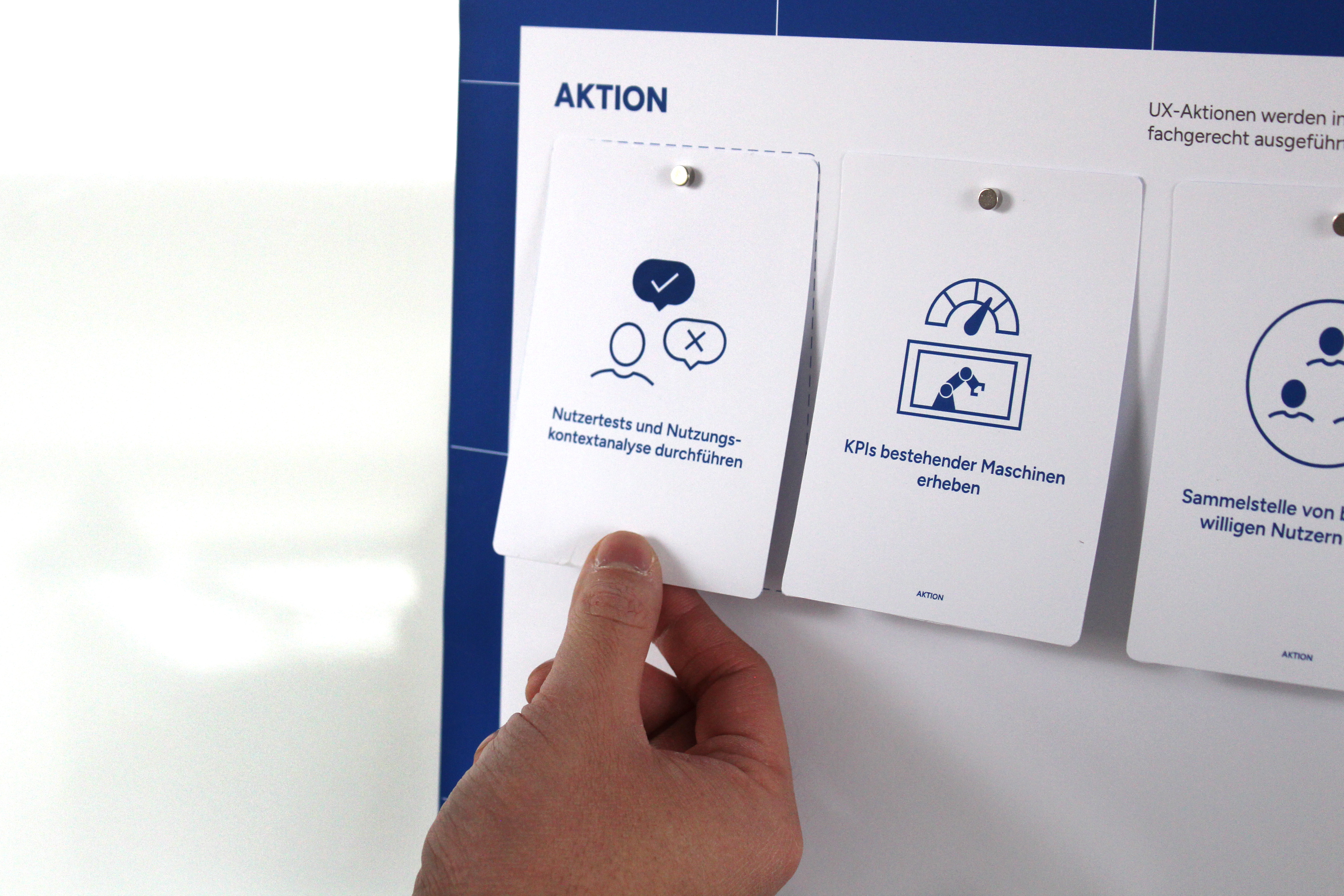 Konkret wurde ein Usability Test innerhalb der Kategorie ‚Aktion‘ entwickelt. Hierbei werden Templates für den Moderator sowie für die Beobachter zur Verfügung gestellt. Dadurch wird die Nutzung durch den Maschinenbediener an einer bestehenden Maschine analysiert und Probleme herausgefiltert, um sie in der Konzeptionierung einer neuen Maschine zu beheben. Dieser Test bietet die Besonderheit, dass er Mitarbeitende ohne UX-Ausbildung dazu befähigt, an einem Usability Test teilzunehmen und mitzuwirken. Durch deren erhaltene praktische Erfahrung wird ihr Verständnis und Akzeptanz für UX gefördert, was wiederum dazu führt, dass UX einen höheren Stellenwert im PEP erhält.