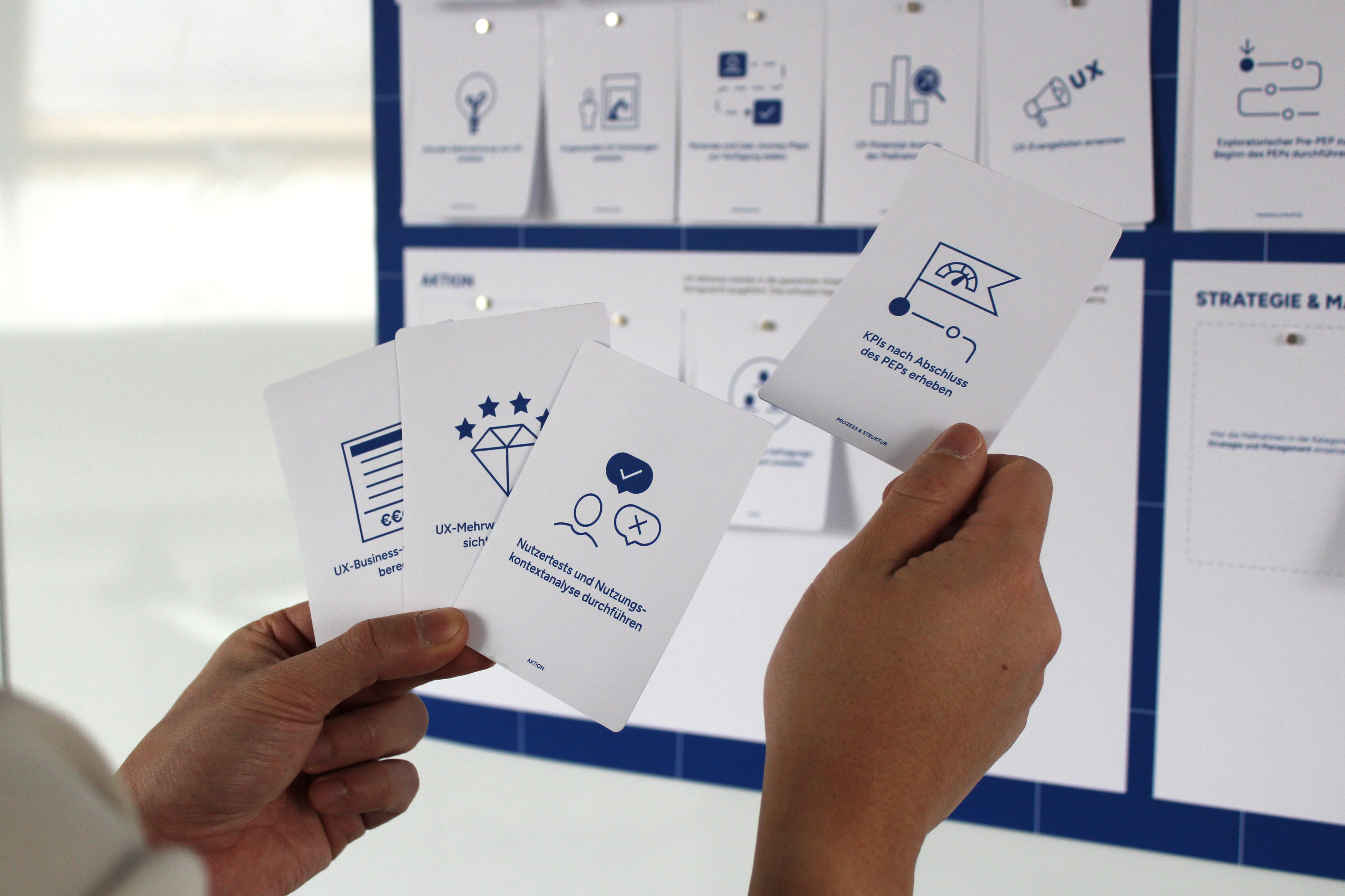 Als Gestaltungslösung wird ein Maßnahmenplan erster Schritte entwickelt. Dieser verfügt über individuelle Vorgehensweisen für das Unternehmen, welche aus der Recherche und Analyse Potenziale bieten, UX in den PEP zu integrieren. Die Maßnahmen gliedern sich in vier Kategorien: Kommunikation, Prozess & Struktur, Aktion und Strategie & Management. Darin sind die einzelnen Maßnahmen eingeordnet, welche wiederum in eine praktische Einbindung und konkrete Methoden unterteilt werden. Die Materialien sind sowohl analog als auch digital nutzbar.