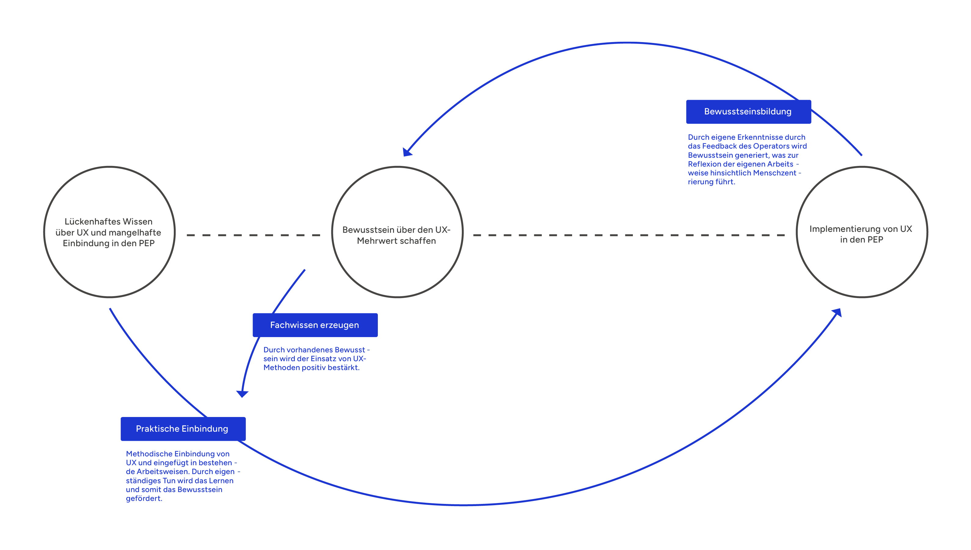 Das Bewusstsein von den Mitarbeitenden für UX wird über das methodische Lernen geschaffen. Indem UX in einer praktischen und fachlichen Anwendung stattfindet, wird Verständnis und Akzeptanz dafür geschaffen. Dies begünstigt eine künftige Einbindung in Produktentstehungsprojekte.