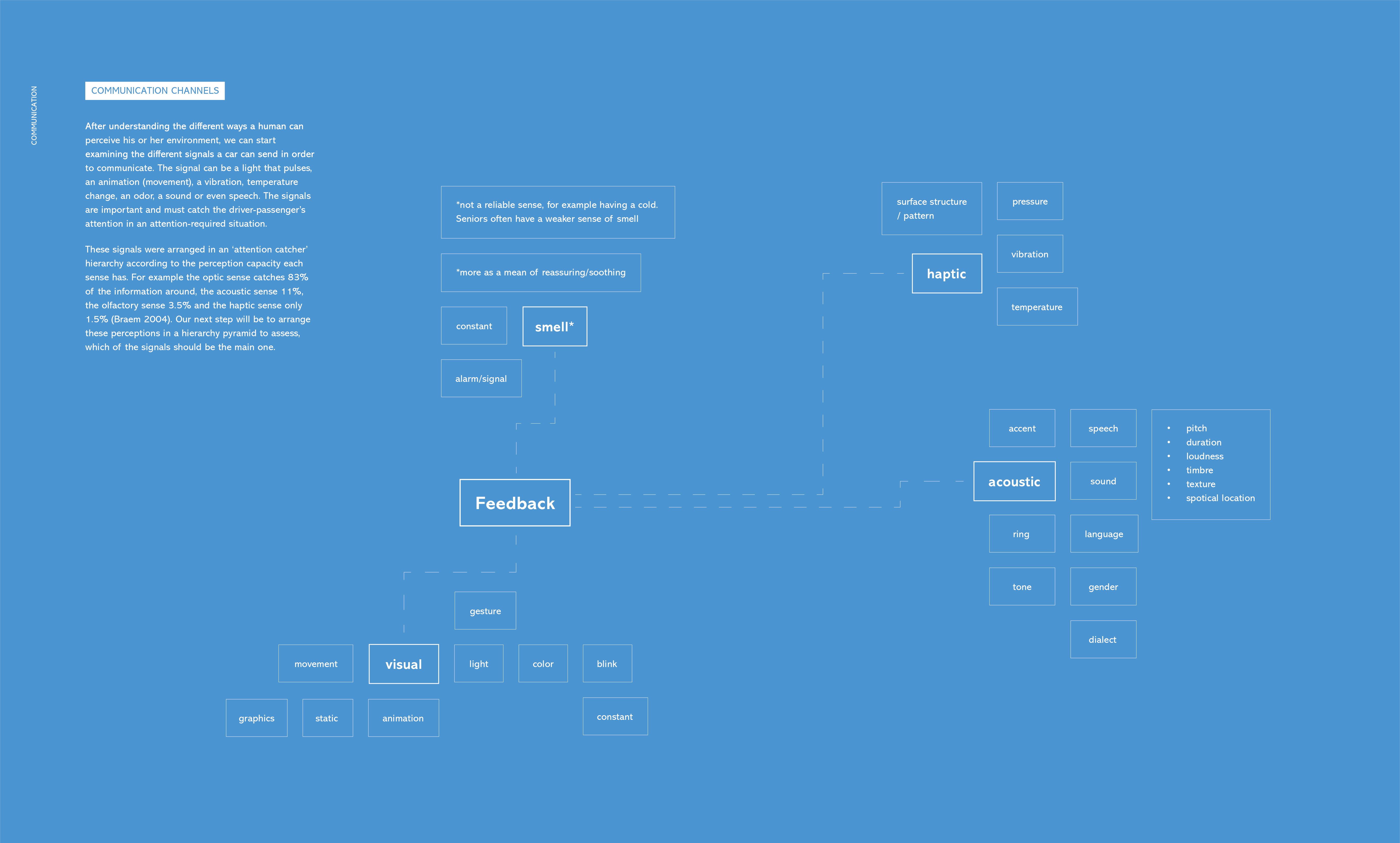 Our thesis, “Strategy for the Human-Car Communication in the Context of Human Perception and Semi-Self-Driving Vehicles”, takes a close look at future automated and autonomous vehicles and how they may communicate with us. A semi-autonomous car (level 4) is the place where a driver is also a passenger. In this case the car drives most of the time, though the driver-passenger is not entirely passive, and may need to take action (drive) from time to time. Screen interface, is the communication of yesterday. Tomorrow, vehicles will notify you about an attention-required situation, through signals that are based on the human senses and perception.