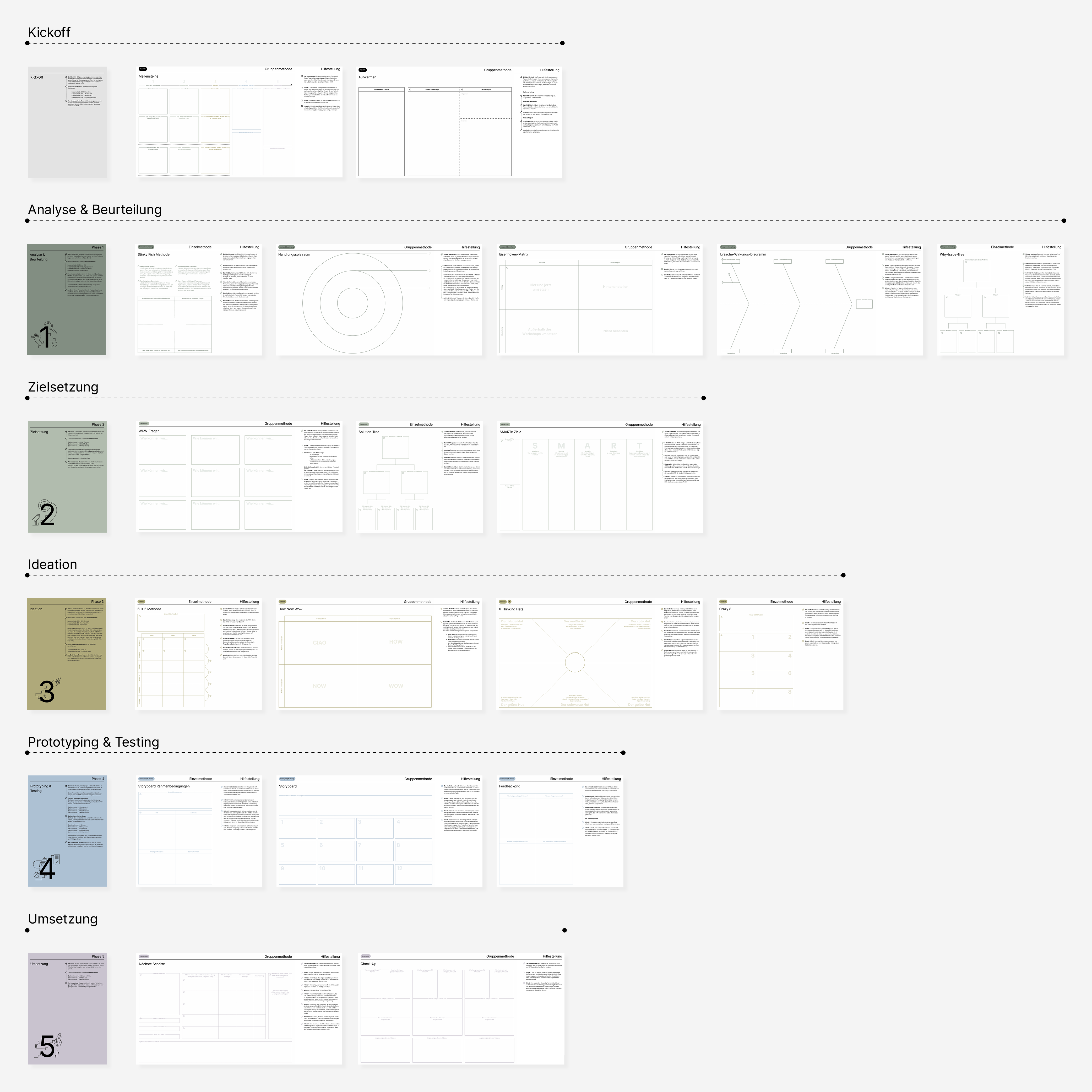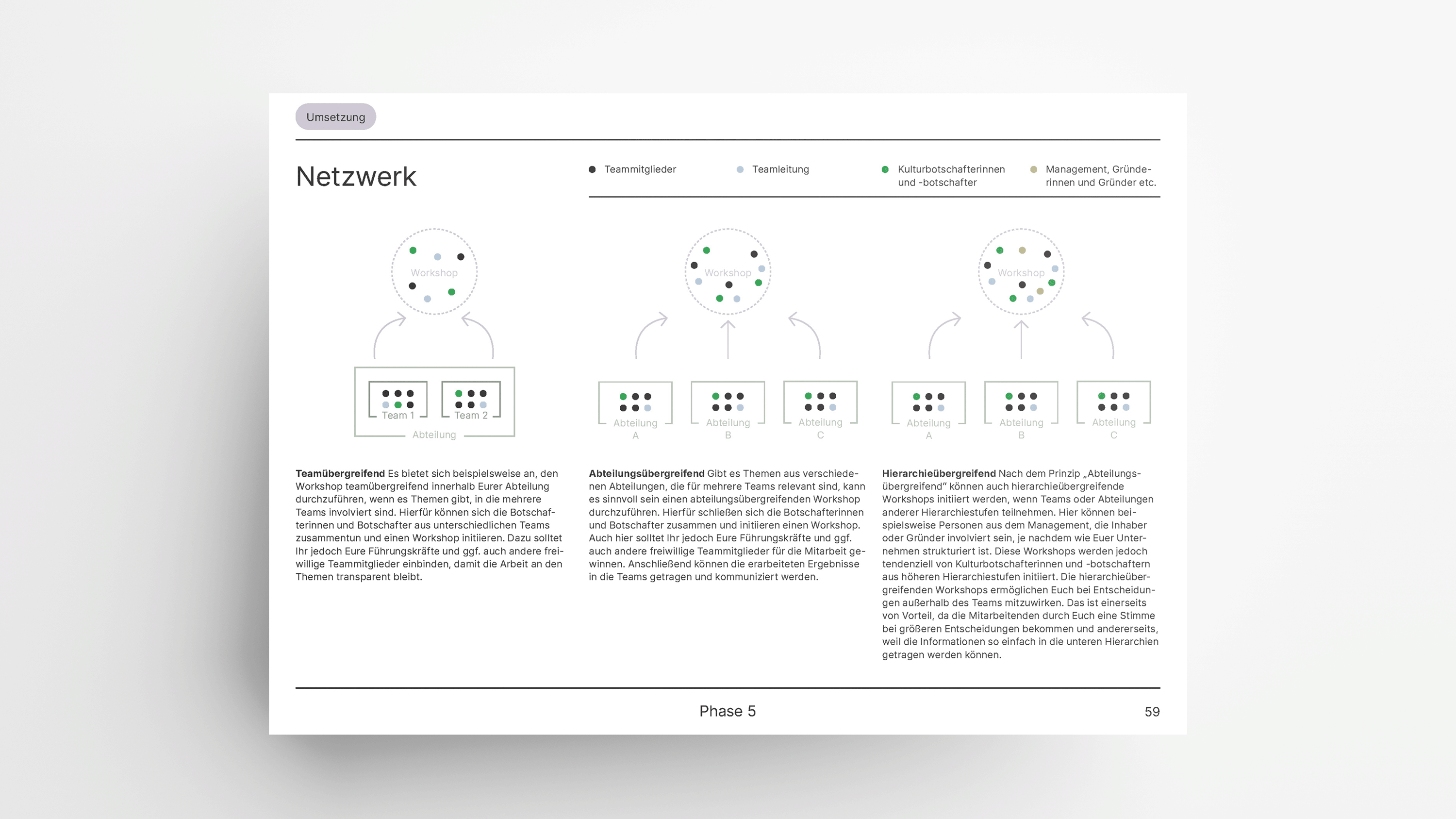 For the toolset, processes and methods from management consulting as well as agile working, and design thinking were combined to develop a culture design process that promotes the most sustainable changes possible. The resulting toolset contains a collection of a total of 21 methods that guide through the design of a team culture. With the help of a comprehensive manual, teams are empowered to work independently on their team culture.