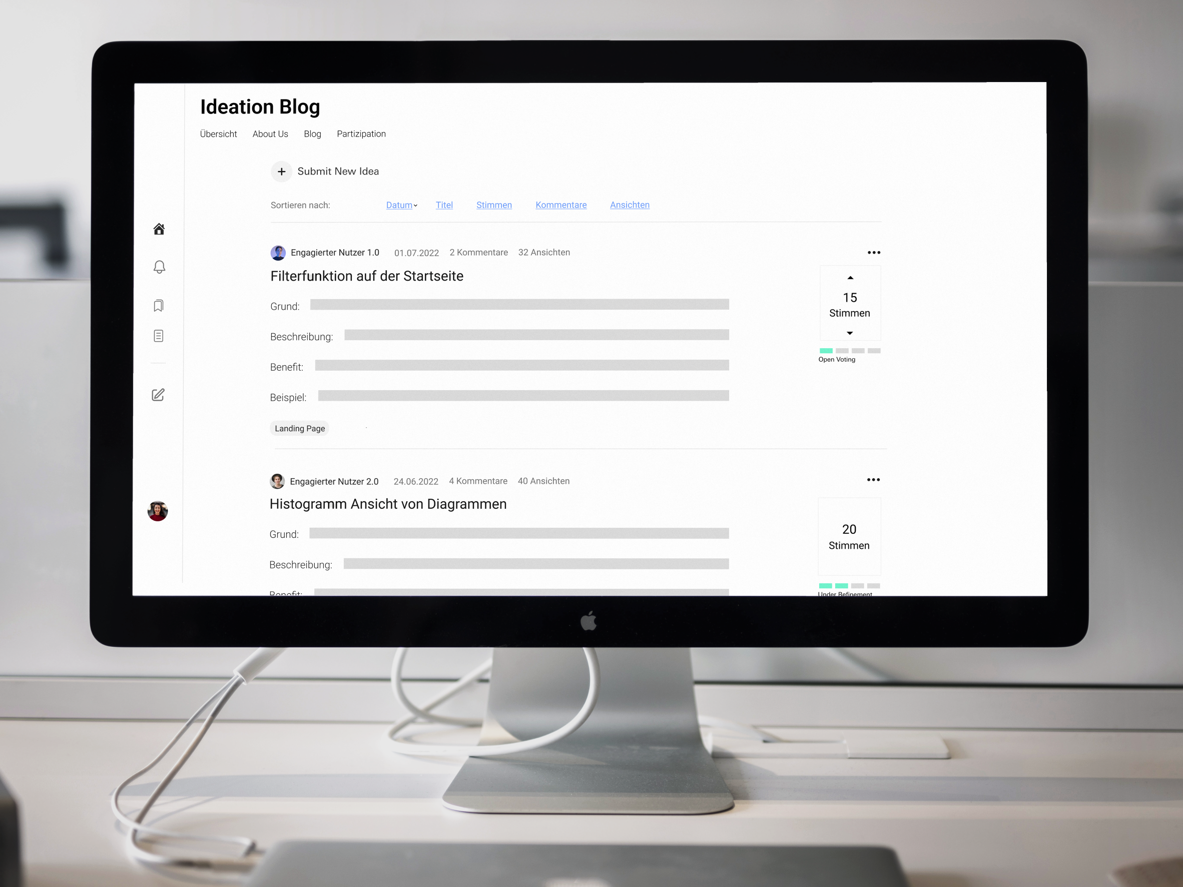 In the "Ideation Blog", users publish their own ideas for potential features, on which the community votes through a public poll. The voting result gives the project teams partial information about the feature's overall desirability.