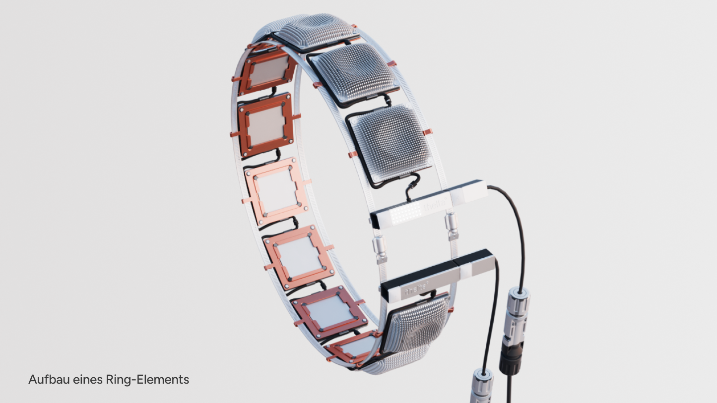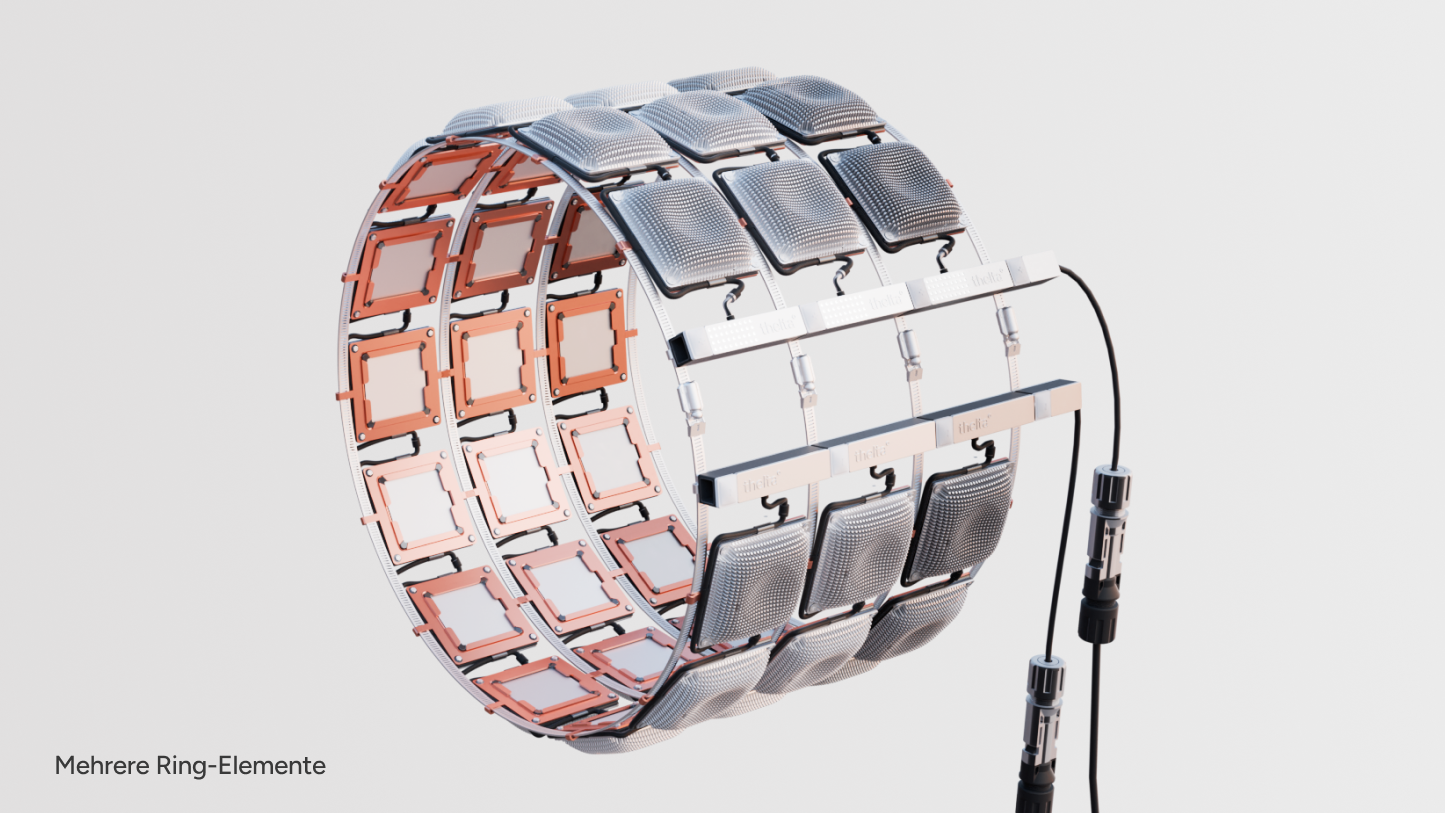 Alle Ring-Elemente sind über das Power-Element mit dem Wechselrichter verbunden, der den erzeugten Gleichstrom in Wechselstrom umwandelt, um ihn ins Stromnetz zurückzuführen und wiederzuverwenden.