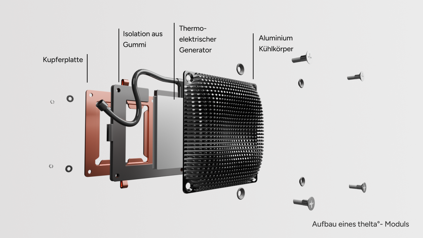 Ein Modul besteht aus einem Kühlkörper aus Aluminium, einem thermoelektrischen Generator, eine Kupferplatte und der Isolation aus Gummi.