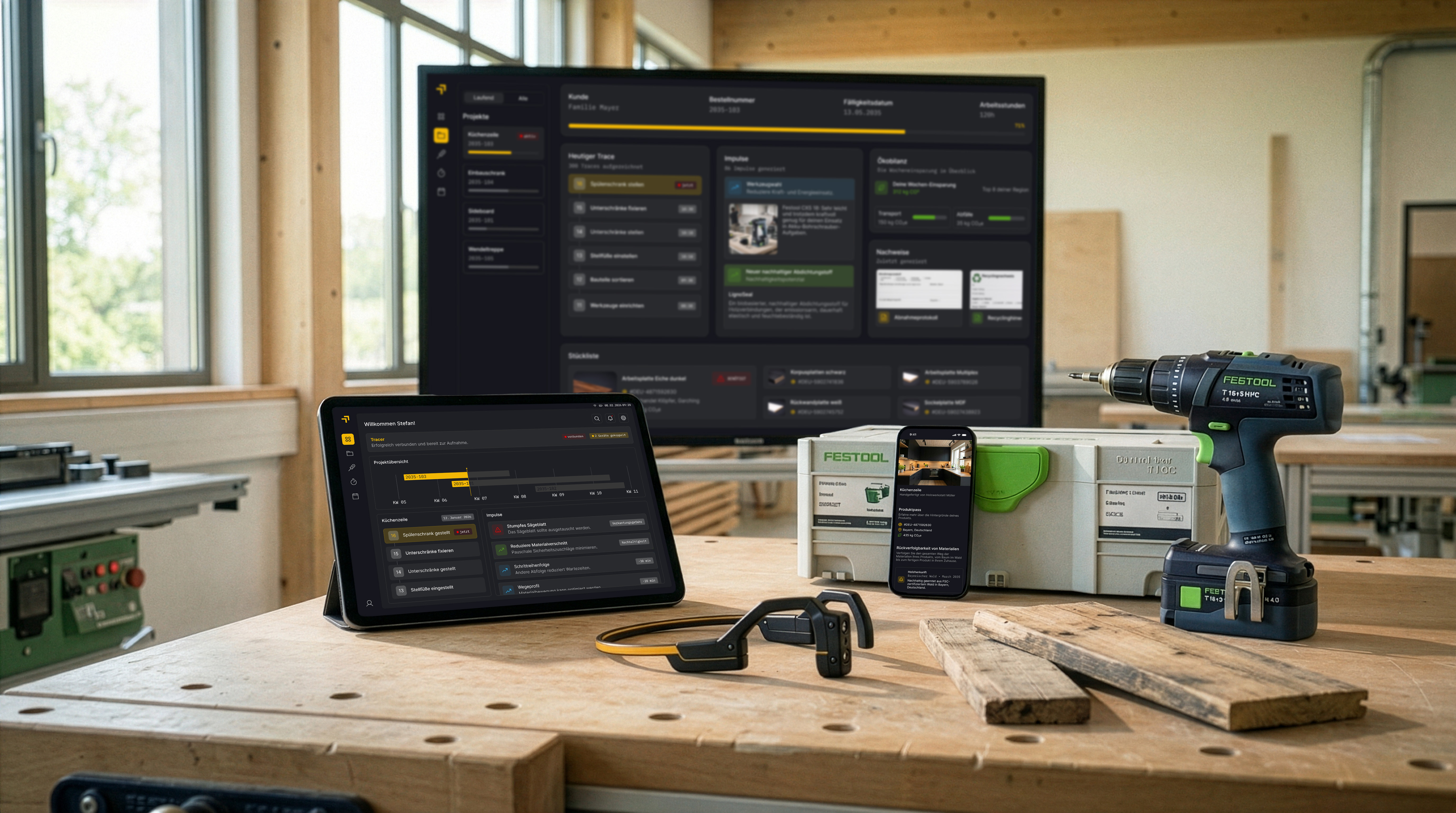 TRACER™ ist ein System für das zirkuläre Handwerk der Zukunft. Es unterstützt Handwerker:innen dabei, Materialflüsse transparent zu dokumentieren, nachhaltige Entscheidungen zu treffen und regulatorische Anforderungen effizient zu erfüllen – ohne den Arbeitsfluss zu unterbrechen.