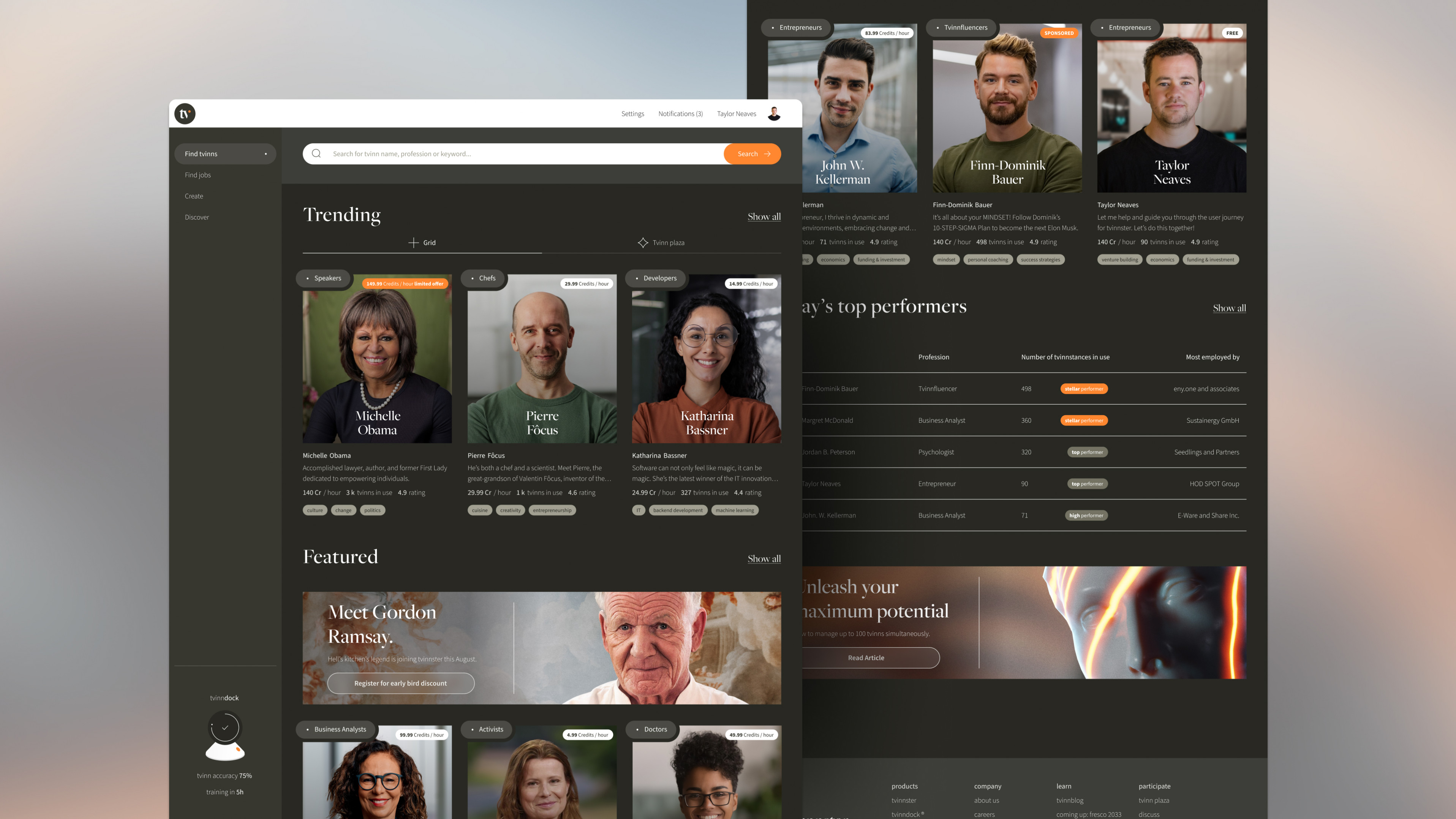 After logging in, users will find a homepage with various suggestions based on their interests and usage behavior. If they then open the profile page of a tvinn, they can conveniently jump into a video call with the digital twin without waiting times. The fast-paced working world is omnipresent here: For example, people with a particularly high number of digital instances are honored with badges as "stellar performers".