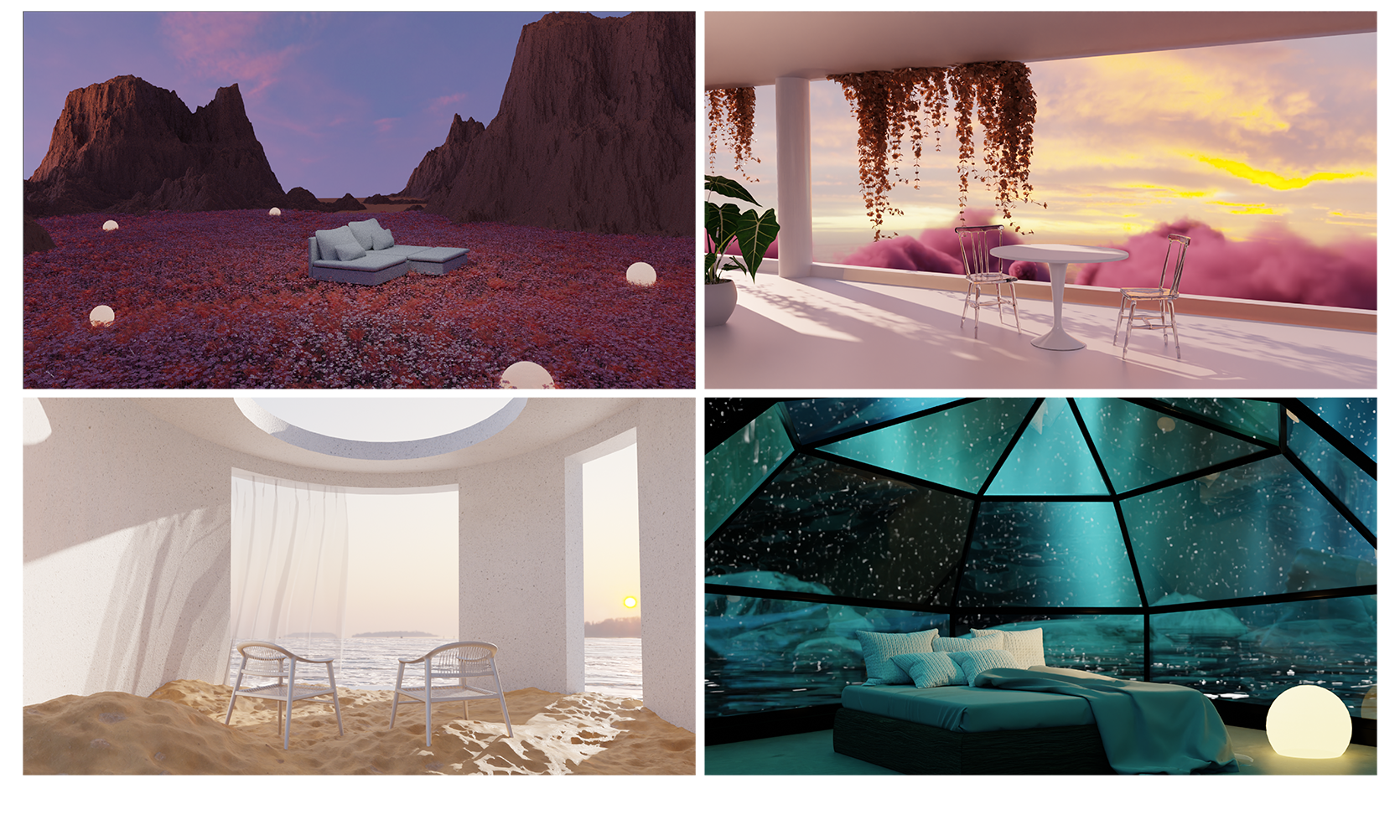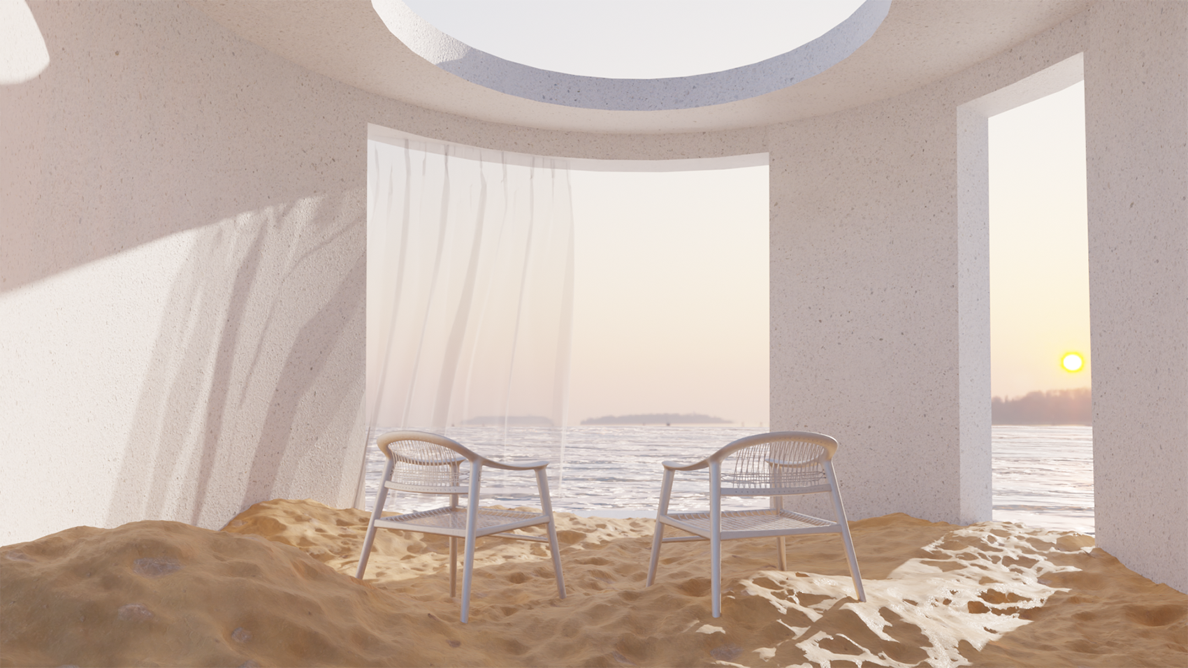 Die VR Räume wurden auf Basis einer Fokusgruppe mit unseren Nutzern erstellt. Diese hatten sich vor allem schöne außergewöhnliche Landschaften und Sehenswürdigkeiten gewünscht, welche zu einem Gespräch mit Freunden einladen. Die VR Räume wurden mit der Software Blender entworfen, erstellt und modelliert.